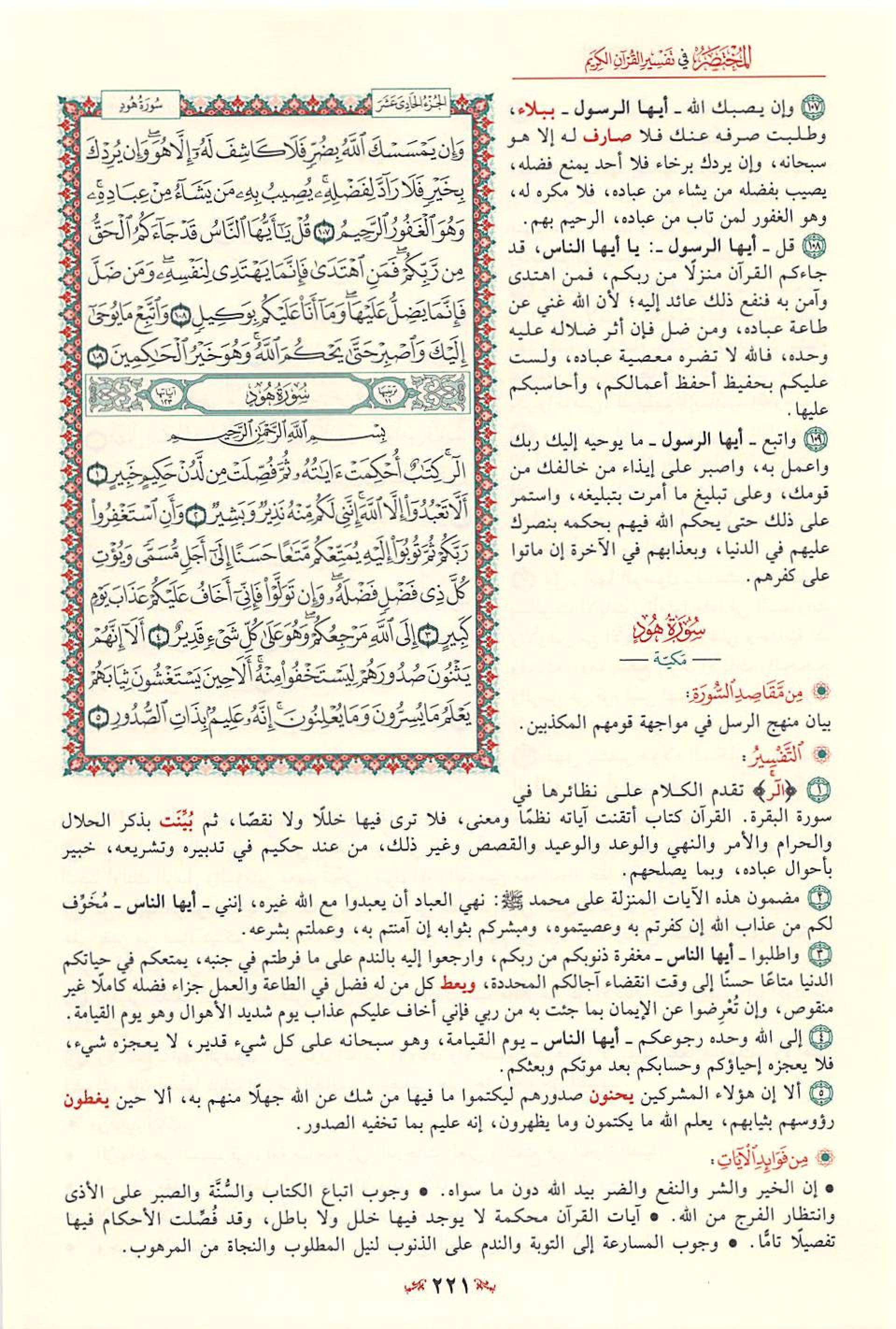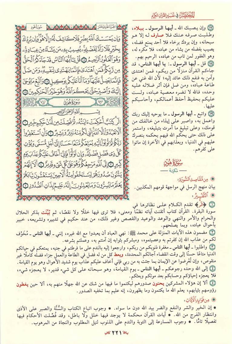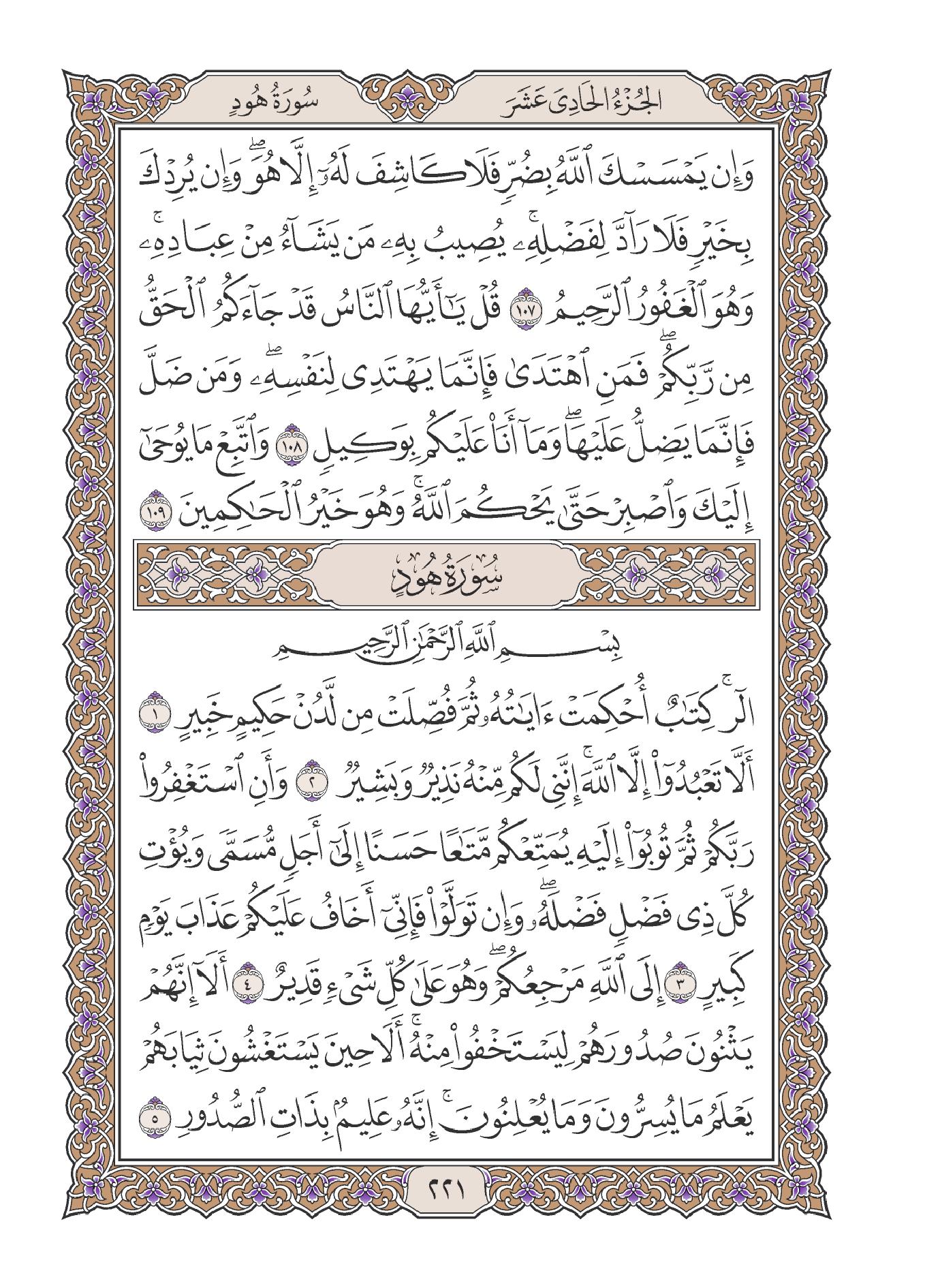 தமிழ் - ஜான் டிரஸ்ட் : அலிஃப் லாம் றா இது வேதமாகும்; இதன் வசனங்கள் பல்வேறு அத்தாட்சிகளால் உறுதியாக்கப்பட்டு பின்னர் தெளிவாக விவரிக்கப்பட்டுள்ளன மேலும் இவை யாவற்றையும் நன்கறிபவனும் ஞானம் மிக்கோனுமாகியஇறைவனிடம் இருந்துவந்துள்ளன