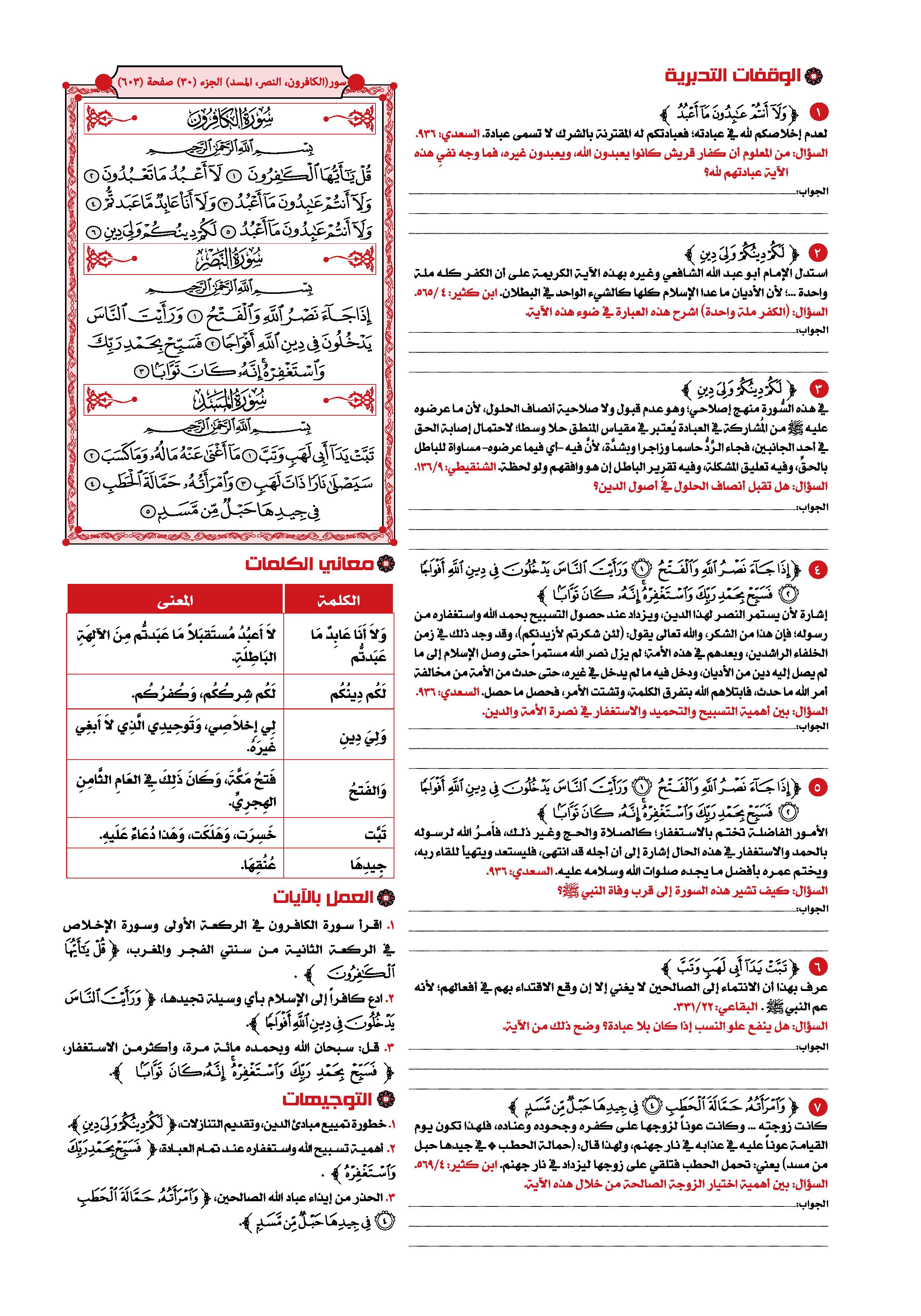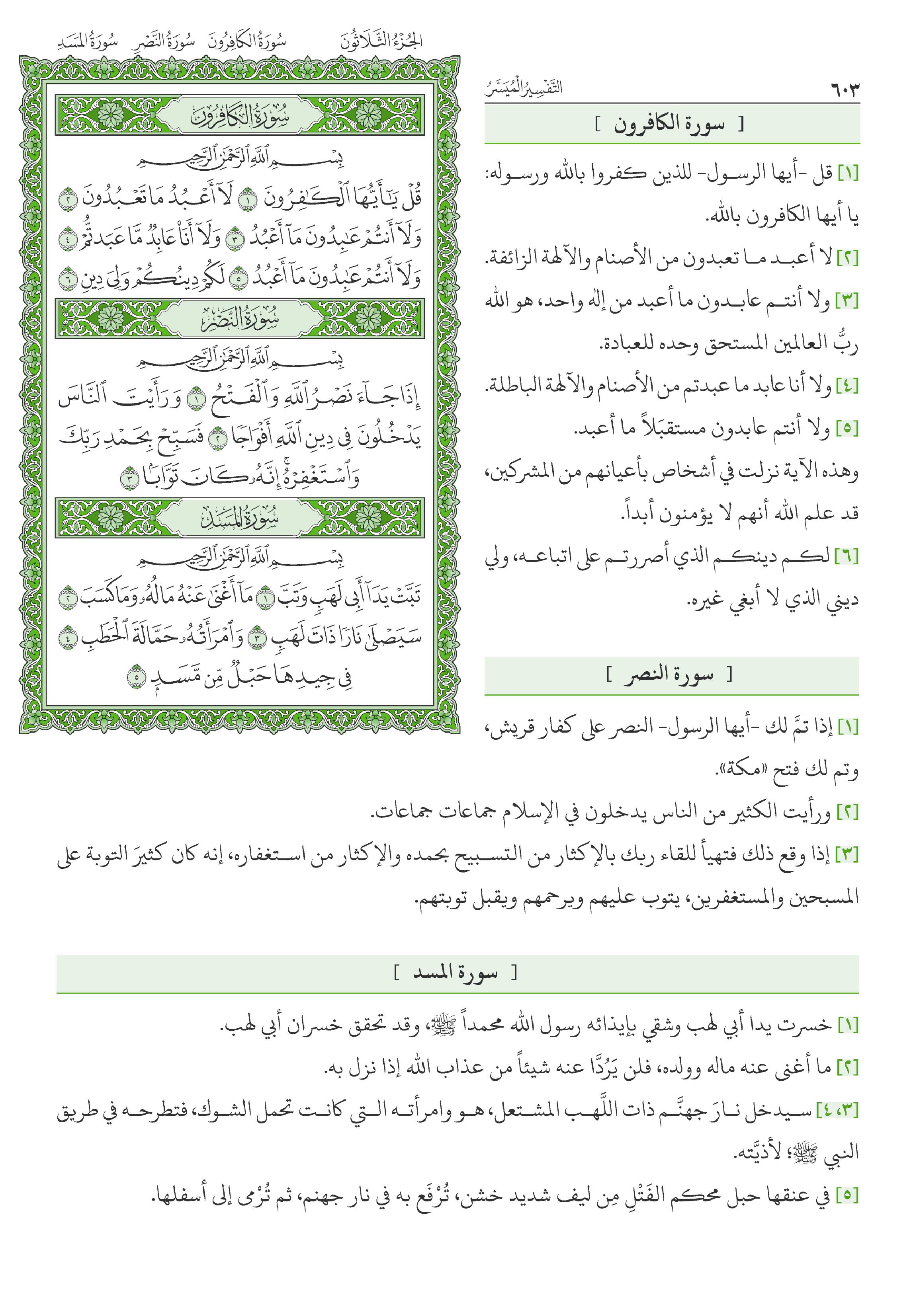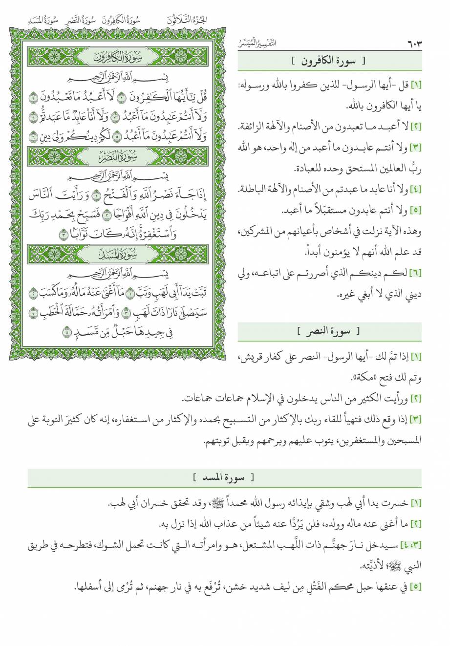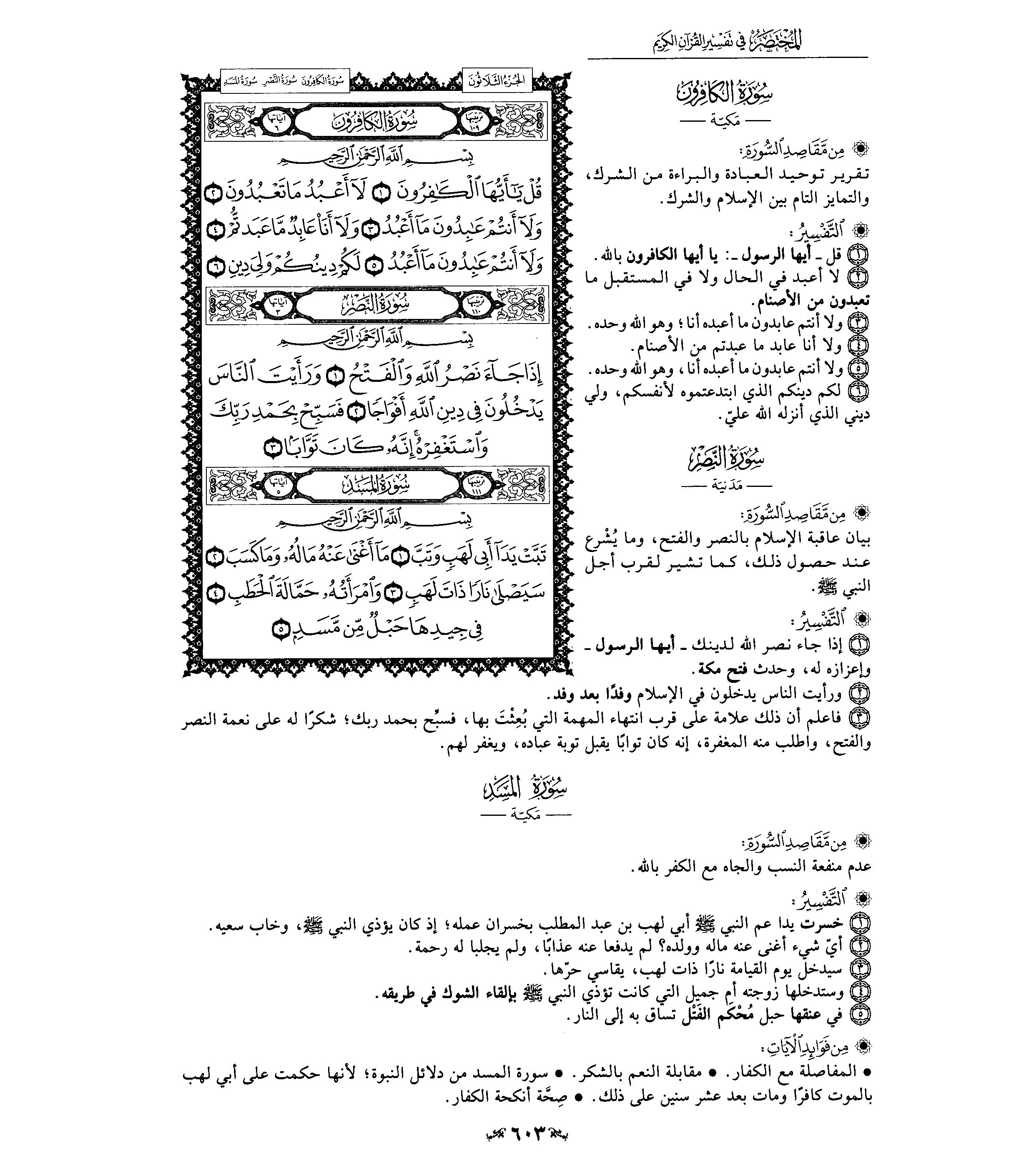 السعدى : في هذه السورة الكريمة، بشارة وأمر لرسوله عند حصولها، وإشارة وتنبيه على ما يترتب على ذلك. فالبشارة هي البشارة بنصر الله لرسوله، وفتحه مكة. الوسيط لطنطاوي : تفسير سورة النصر مقدمة وتمهيد 1- سورة «النصر» تسمى- أيضا- سورة: إِذا جاءَ نَصْرُ اللَّهِ وَالْفَتْحُ، وتسمى سورة «التوديع» وهي من السور المدنية، قيل: نزلت عند منصرف النبي صلى الله عليه وسلم من غزوة خيبر، وقيل: نزلت بمنى في أيام التشريق، والنبي صلى الله عليه وسلم في حجة الوداع، وقيل نزلت عند منصرفه صلى الله عليه وسلم من غزوة حنين. وكان نزولها بعد سورة «الحشر» وقبل سورة «النور» ، وهي ثلاث آيات. 2- وقد تضافرت الأخبار رواية وتأويلا، على أن هذه السورة تومئ إلى قرب نهاية أجل النبي صلى الله عليه وسلم. وقد ذكر الإمام ابن كثير جملة من الآثار في هذا المعنى منها ما أخرجه البيهقي عن ابن عباس قال: لما نزلت سورة إِذا جاءَ نَصْرُ اللَّهِ وَالْفَتْحُ، دعا رسول الله صلى الله عليه وسلم فاطمة وقال: «قد نعيت إلىّ نفسي» فبكت ثم ضحكت، وقالت: أخبرنى أنه نعيت إليه نفسه فبكيت، ثم قال: «اصبري فإنك أول أهلى لحاقا بي» فضحكت. وأخرج البخاري عن ابن عباس، قال: كان عمر- رضى الله عنه- يدخلني مع أشياخ بدر، فكأن بعضهم قد وجد في نفسه- أى: تغير وغضب- وقال: لماذا يدخل هذا معنا ولنا أبناء مثله، فقال عمر: إنه ممن علمتم. فدعاهم ذات يوم فأدخله معهم ... فقال: ما تقولون في قوله- تعالى- إِذا جاءَ نَصْرُ اللَّهِ وَالْفَتْحُ، فقال بعضهم: أمرنا أن نحمد الله ونستغفره، إذا نصرنا وفتح علينا، وسكت بعضهم فقال ... عمر: أكذلك تقول بن عباس؟ فقلت: لا، فقال: ما تقول؟ فقلت: هو أجل رسول الله صلى الله عليه وسلم أعلمه له ... فقال عمر: لا أعلم منها إلا ما تقول. وأخرج الطبراني عن ابن عباس أنه قال: آخر سورة نزلت من القرآن هذه السورة . 3- والسورة الكريمة وعد منه- تعالى- لنبيه صلى الله عليه وسلم بالنصر والفتح وبشارة بدخول أفواج الناس في دين الله، وأمر منه- سبحانه- بالمواظبة على حمده واستغفاره. النصر : التغلب على العدو ، والإِعانة على بلوغ الغاية ، ومنه قولهم : قد نصر الغيث الأرض ، أى : أعان على إظهار نباتها . والمراد به هنا : إعانة الله - تعالى - لنبيه صلى الله عليه وسلم على أعدائه ، حتى حقق له النصر عليهم . والفتح : يطلق على فتح البلاد عَنْوَةً والتغلب على أهلها ، ويطلق على الفصل والحكم بين الناس ، ومنه قوله - تعالى - : ( رَبَّنَا افتح بَيْنَنَا وَبَيْنَ قَوْمِنَا بالحق وَأَنتَ خَيْرُ الفاتحين ) والمراد به : هنا فتح مكة . وما ترتب عليه من إعزاز الدين ، وإظهار كلمة الحق . البغوى : مكية ( إذا جاء نصر الله والفتح ) أراد فتح مكة . وكانت قصته - على ما ذكر محمد بن إسحاق وأصحاب الأخبار - أن رسول الله - صلى الله عليه وسلم - لما صالح قريشا عام الحديبية ، واصطلحوا على وضع الحرب بين الناس عشر سنين ، يأمن فيهن الناس ، ويكف بعضهم عن بعض ، وأنه من أحب أن يدخل في عقد رسول الله - صلى الله عليه وسلم - وعهده دخل فيه ، ومن أحب أن يدخل في عقد قريش وعهدهم دخل فيه ، فدخلت بنو بكر في عقد قريش ، ودخلت خزاعة في عهد رسول الله - صلى الله عليه وسلم - ، وكان بينهما شر قديم . ثم إن بني بكر عدت على خزاعة ، وهم على ماء لهم بأسفل مكة ، يقال له " الوتير " ، فخرج نوفل بن معاوية الدؤلي في بني الدئل من بني بكر حتى بيت خزاعة ، وليس كل بكر تابعه ، فأصابوا منهم رجلا وتحاربوا واقتتلوا ، ورفدت قريش بني بكر بالسلاح ، وقاتل معهم من قريش من قاتل مستخفيا بالليل ، حتى حازوا خزاعة إلى الحرم ، وكان ممن أعان بني بكر من قريش على خزاعة ليلتئذ بأنفسهم متنكرين : صفوان بن أمية ، وعكرمة بن أبي جهل ، وسهيل بن عمرو ، مع عبيدهم فلما انتهوا إلى الحرم قالت بنو بكر : يا نوفل إنا دخلنا الحرم ، إلهك إلهك ، فقال كلمة عظيمة : إنه لا إله لي اليوم ، [ يا بني بكر ] أصيبوا ثأركم فيه . فلما تظاهرت قريش على خزاعة وأصابوا منهم ونقضوا ما بينهم وبين رسول الله - صلى الله عليه وسلم - من العهد بما استحلوا من خزاعة - 