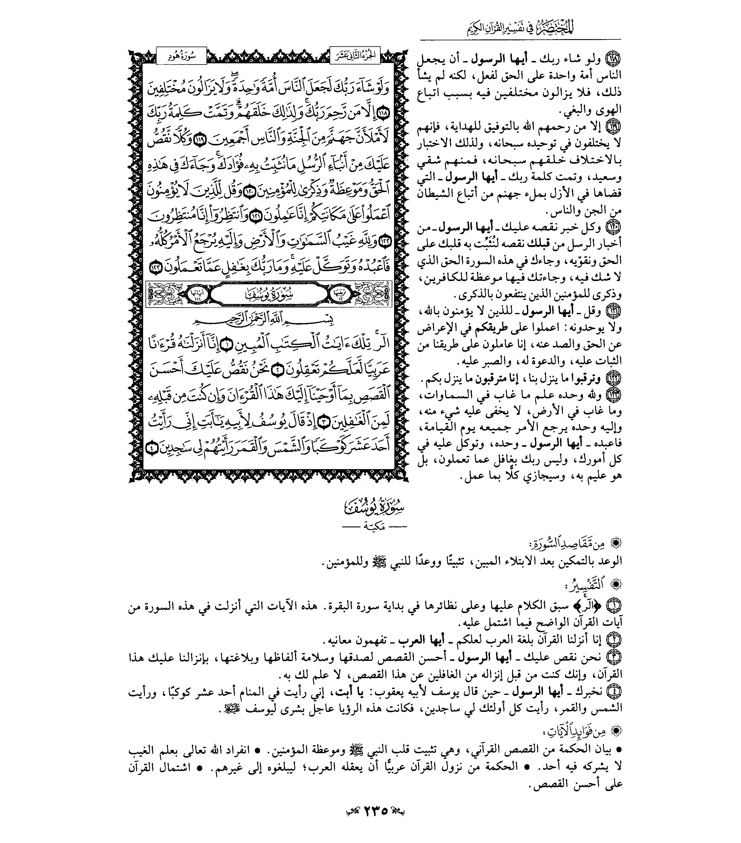 سورة يوسف عليه السلام وهي مكية كلها . وقال ابن عباس وقتادة : إلا أربع آيات منها . وروي أن اليهود سألوا رسول الله - صلى الله عليه وسلم - عن قصة يوسف فنزلت السورة ; وسيأتي . وقال سعد بن أبي وقاص : أنزل القرآن على رسول الله - صلى الله عليه وسلم - فتلاه عليهم زمانا فقالوا : لو قصصت علينا ; فنزل : نحن نقص عليك فتلاه عليهم زمانا فقالوا : لو حدثتنا ; فأنزل : الله نزل أحسن الحديث . قال العلماء : وذكر الله أقاصيص الأنبياء في القرآن وكررها بمعنى واحد في وجوه مختلفة ، بألفاظ متباينة على درجات البلاغة ، وقد ذكر قصة يوسف ولم يكررها ، فلم يقدر مخالف على معارضة ما تكرر ، ولا على معارضة غير المتكرر ، والإعجاز لمن تأمل .