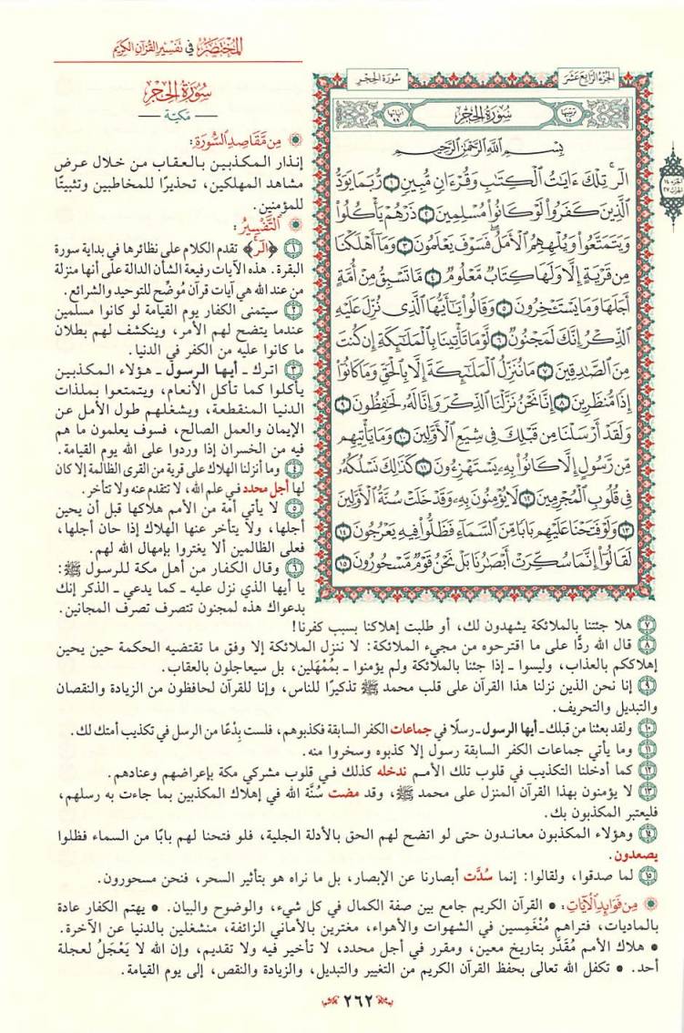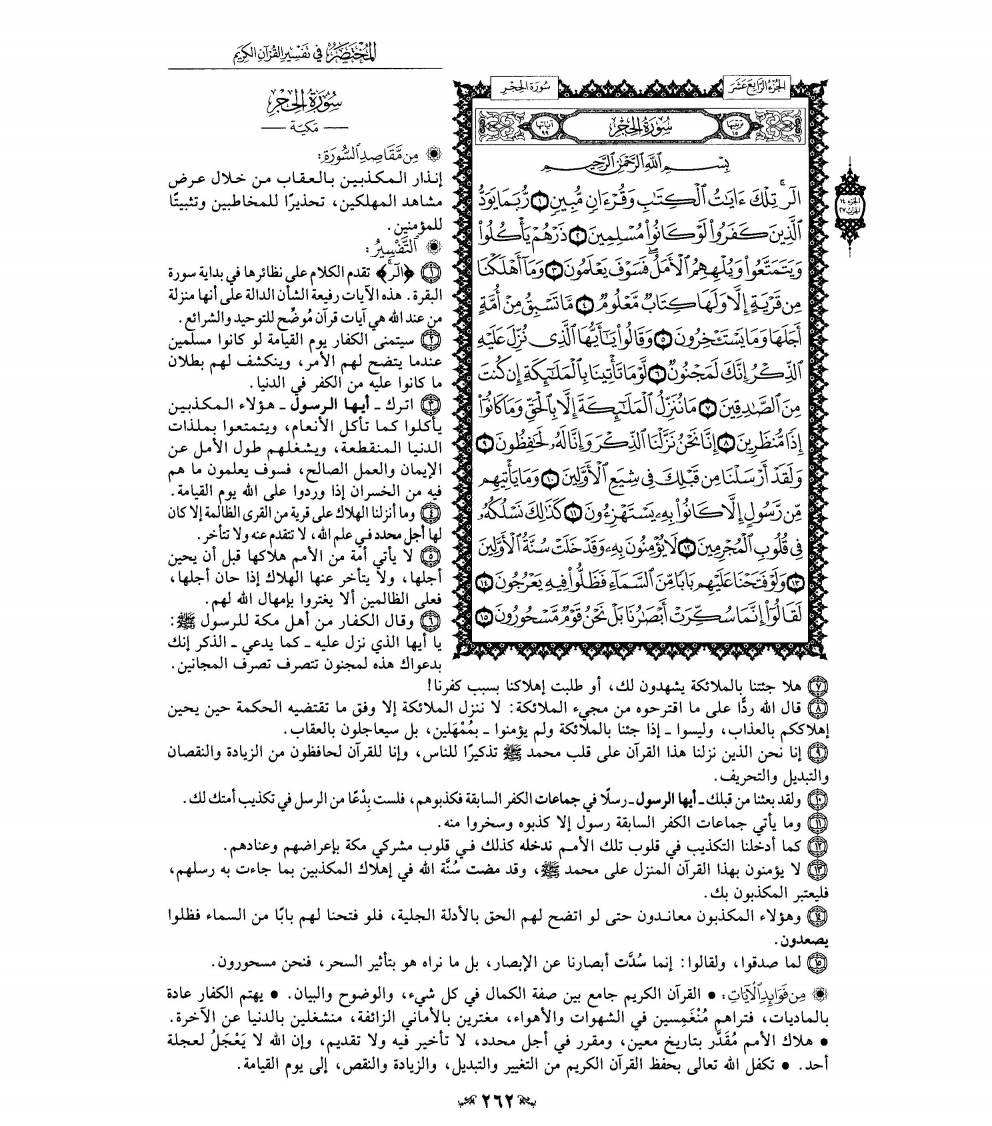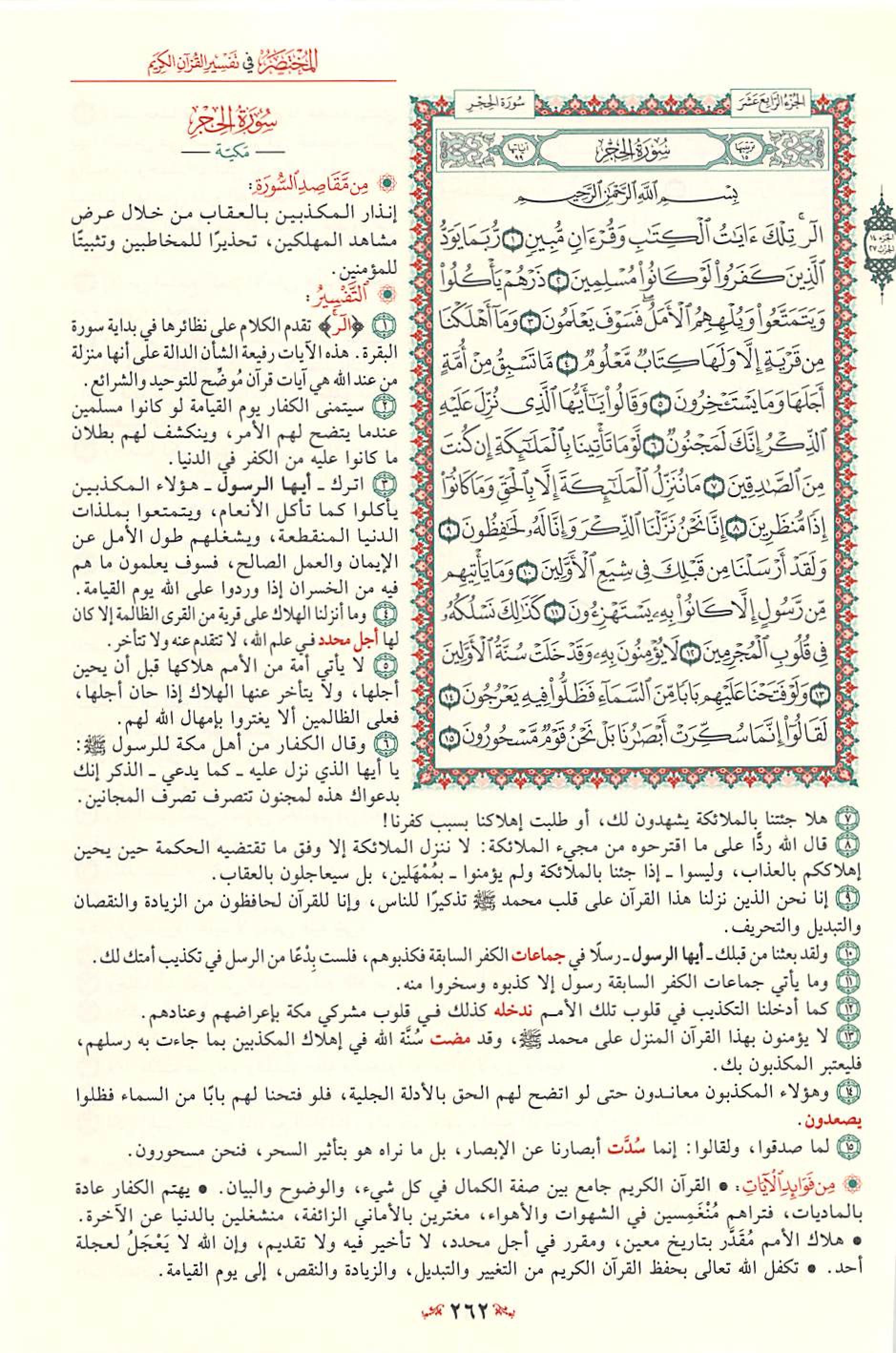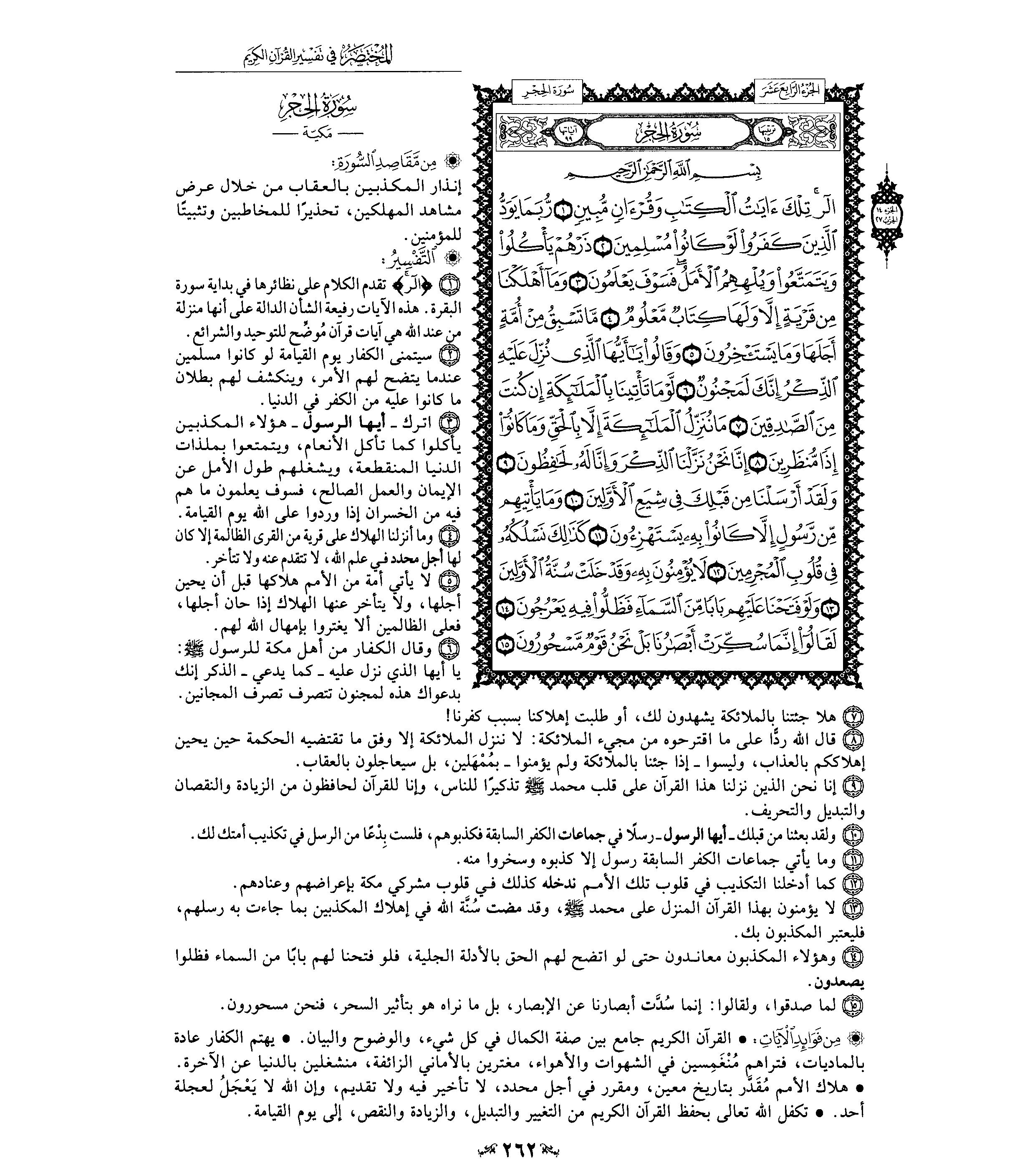 السعدى : يقول تعالى معظما لكتابه مادحا له { تِلْكَ آيَاتُ الْكِتَابِ } أي: الآيات الدالة على أحسن المعاني وأفضل المطالب، { وَقُرْآنٍ مُبِينٍ } للحقائق بأحسن لفظ وأوضحه وأدله على المقصود، وهذا مما يوجب على الخلق الانقياد إليه، والتسليم لحكمه وتلقيه بالقبول والفرح والسرور. الوسيط لطنطاوي : سورة الحجر من السور التى افتتحت ببعض حروف التهجى ( الر ) . وقد بينا - بشئ من التفصيل - عند تفسيرنا لسورة : البقرة ، وآل عمران ، والأعراف . . . آراء العلماء فى هذه الحروف التى افتتحت بها بعض سور القرآن الكريم . وقلنا ما خلاصته : من العلماء من يرى أن المعنى المقصود منها غير معروف لأنها من المتشابه الذى استأثر الله بعلمه . . . ومنهم من يرى أن المعنى المقصود منها معلوم ، وأنها ليست من المتشابه ، بل هى أسماء للسور التى افتتحت بها . . . أو هى حروف مقطعة بعضها من أسماء الله ، وبعضها من صفاته . . . ثم قلنا : ولعل أقرب الآراء إلى الصواب أن يقال : إن هذه الحروف المقطعة ، قد وردت فى افتتاح بعض السور؛ للإِشعار بأن هذا القرآن الذى تحدى الله به المشركين ، هو من جنس الكلام المركب من هذه الحروف التى يعرفونها ، ويقدرون على تأليف الكلام منها ، فإذا عجزوا عن الإِتيان بسورة من مثله ، فذلك لبلوغه فى الفصاحة والحكمة مرتبة يقف فصحاؤهم وبلغاؤهم دونها بمراحل . وفضلاً عن ذلك فإن تصدير بعض السور بمثل هذه الحروف المقطعة ، يجذب أنظار المعرضين عن استماع القرآن حين يتلى عليهم إلى الإِنصات والتدبر ، لأنه يطرق أسماعهم فى أول التلاوة ألفاظ غير مألوفة فى مجارى كلامهم وذلك مما يلفت أنظارهم ليتبينوا ما يراد منها ، فيسمعوا حكماً وهدايات قد تكون سبباً فى استجابتهم للحق ، كما استجاب صالحو الجن الذين حكى الله - تعالى - عنهم أنهم عندما استمعوا إلى القرآن قالوا : ( إِنَّا سَمِعْنَا قُرْآناً عَجَباً يهدي إِلَى الرشد فَآمَنَّا بِهِ وَلَن نُّشرِكَ بِرَبِّنَآ أَحَداً . . . . ) واسم الإِشارة ( تلك ) يعود إلى الآيات التى تضمنتها هذه السورة ، أو إلى جميع الآيات القرآنية التى نزلت قبل ذلك . والمراد بالكتاب : القرآن الكريم ، ولا يقدح فى هذا ، ذكر لفظ القرآن بعده ، لأنه - سبحانه - جمع له بين الاسمين تفخيماً لشأنه ، وتعظيماً لقدره . و ( مبين ) اسم فاعل من أبان الذى هو بمعنى بان ، مبالغة فى الوضوح والظهور . قال صاحب الصحاح : يقال : " بان الشئ يبين بيانا ، أى اتضح ، فهو بين وكذا أبان الشئ فهو مبين . . . " . والمعنى : تلك - أيها الناس - آيات بينات من الكتاب الكامل فى جنسه ، ومن القرآن العظيم الشأن ، الواضح فى حكمه وأحكامه ، المبين فى هدايته وإعجازه فأقبلوا عليها بالحفظ لها ، وبالعمل بتوجيهاتها ، لتنالوا السعادة فى دنياكم وآخرتكم . قال الآلوسى : " وفى جمع وصفى الكتابية والقرآنية من تفخيم شأن القرآن ما فيه ، حيث أشير بالأول إلى اشتماله على صفات كمال جنس الكتب الإِلهية فكأنه كلها ، وبالثانى إلى كونه ممتازاً عن غيره ، نسيجا وحده ، بديعاً فى بابه ، خارجاً عن دائرة البيان ، قرآناً غير ذى عوج . . " . البغوى : مكية ( الر ) قيل : معناه : أنا الله أرى ( تلك آيات الكتاب ) أي : هذه آيات الكتاب ( وقرآن ) أي : وآيات قرآن ( مبين ) أي : بين الحلال من الحرام والحق من الباطل . فإن قيل : لم ذكر الكتاب ثم قال ( وقرآن مبين ) وكلاهما واحد ؟ قلنا : قد قيل كل واحد يفيد فائدة أخرى ، فإن الكتاب : ما يكتب ، والقرآن : ما يجمع بعضه إلى بعض . وقيل : المراد بالكتاب : التوراة والإنجيل ، وبالقرآن هذا الكتاب . ابن كثير : قد اختلف المفسرون في الحروف المقطعة التي في أوائل السور فمنهم من قال هي مما استأثر الله بعلمه فردوا علمها إلى الله ولم يفسرها حكاه القرطبي في تفسـره عن أبي بكر وعمر وعثمان وعلي وابن مسعود رضي الله عنهم أجمعين وقاله عامر الشعبي وسفيان الثوري والربيع بن خيثم واختاره أبو حاتم بن حبان. ومنهم من فسرها واختلف هؤلاء في معناها فقال عبدالرحمن بن زيد بن أسلم إنما هي أسماء السور. قال العلامة أبو القاسم محمود بن عمر الزمخشري في تفسير