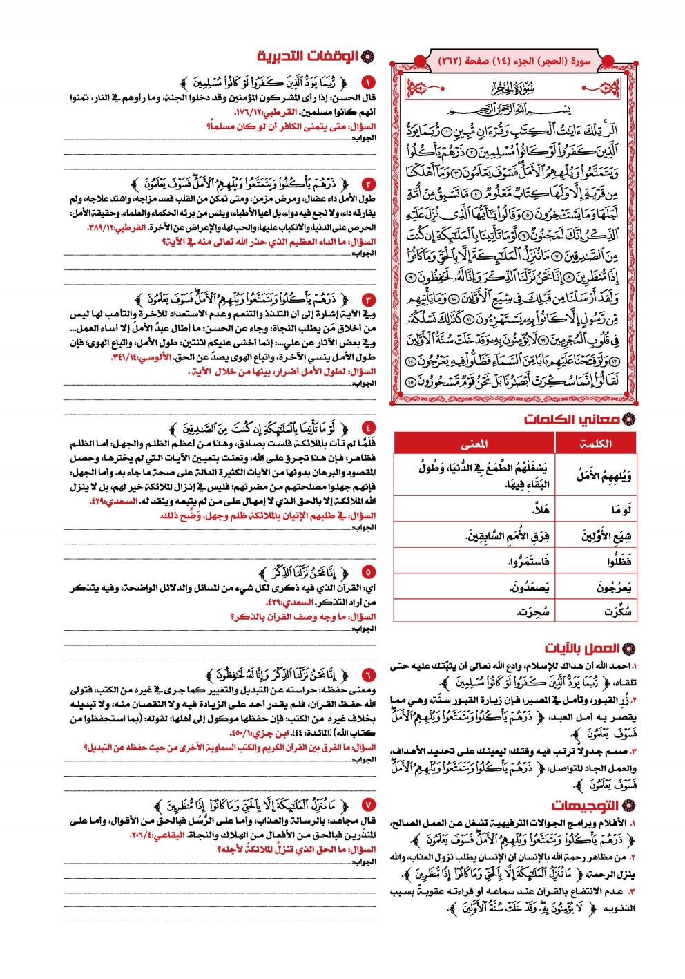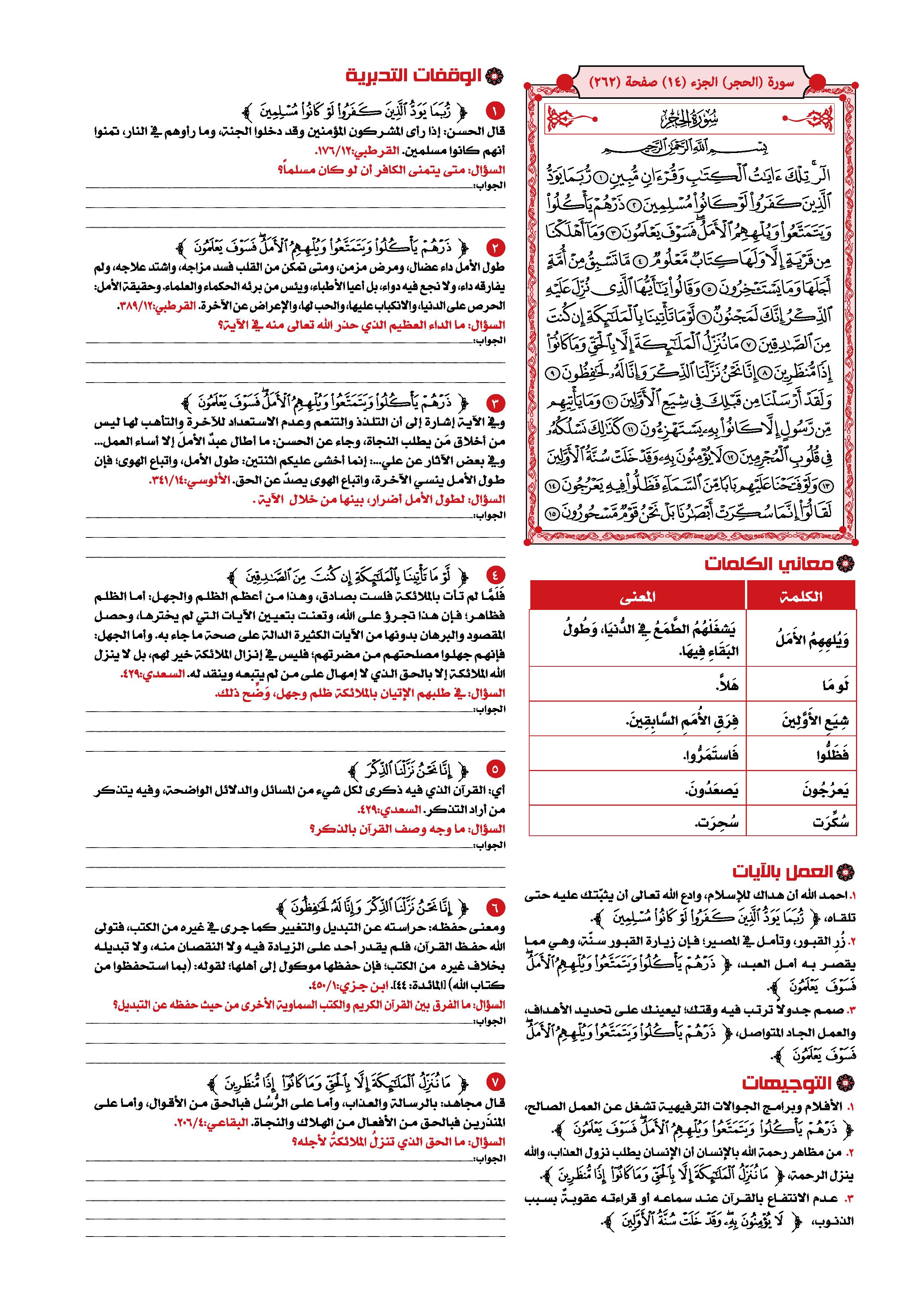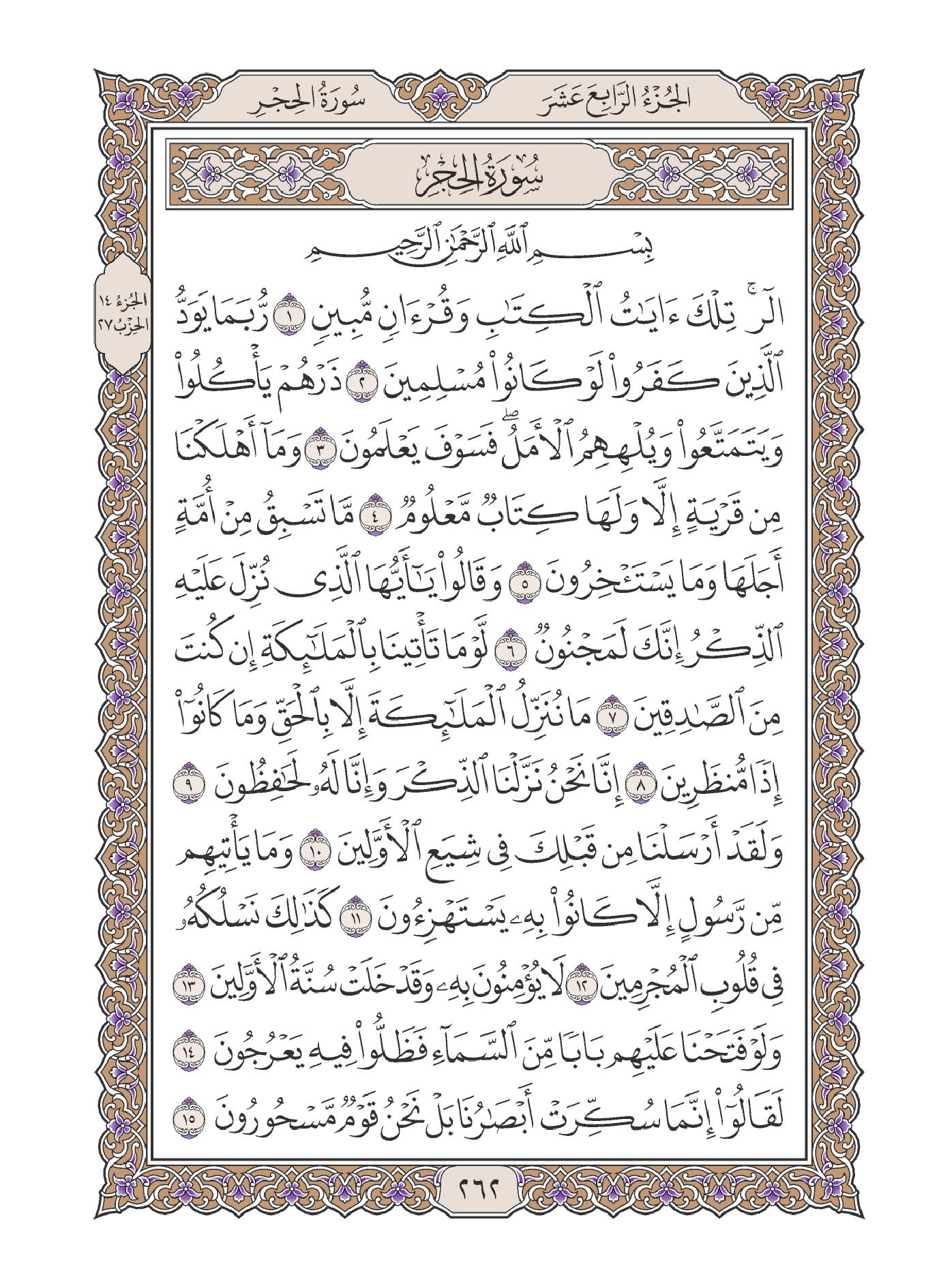 السعدى : يقول تعالى معظما لكتابه مادحا له { تِلْكَ آيَاتُ الْكِتَابِ } أي: الآيات الدالة على أحسن المعاني وأفضل المطالب، { وَقُرْآنٍ مُبِينٍ } للحقائق بأحسن لفظ وأوضحه وأدله على المقصود، وهذا مما يوجب على الخلق الانقياد إليه، والتسليم لحكمه وتلقيه بالقبول والفرح والسرور. الوسيط لطنطاوي : سورة الحجر من السور التى افتتحت ببعض حروف التهجى ( الر ) . وقد بينا - بشئ من التفصيل - عند تفسيرنا لسورة : البقرة ، وآل عمران ، والأعراف . . . آراء العلماء فى هذه الحروف التى افتتحت بها بعض سور القرآن الكريم . وقلنا ما خلاصته : من العلماء من يرى أن المعنى المقصود منها غير معروف لأنها من المتشابه الذى استأثر الله بعلمه . . . ومنهم من يرى أن المعنى المقصود منها معلوم ، وأنها ليست من المتشابه ، بل هى أسماء للسور التى افتتحت بها . . . أو هى حروف مقطعة بعضها من أسماء الله ، وبعضها من صفاته . . . ثم قلنا : ولعل أقرب الآراء إلى الصواب أن يقال : إن هذه الحروف المقطعة ، قد وردت فى افتتاح بعض السور؛ للإِشعار بأن هذا القرآن الذى تحدى الله به المشركين ، هو من جنس الكلام المركب من هذه الحروف التى يعرفونها ، ويقدرون على تأليف الكلام منها ، فإذا عجزوا عن الإِتيان بسورة من مثله ، فذلك لبلوغه فى الفصاحة والحكمة مرتبة يقف فصحاؤهم وبلغاؤهم دونها بمراحل . وفضلاً عن ذلك فإن تصدير بعض السور بمثل هذه الحروف المقطعة ، يجذب أنظار المعرضين عن استماع القرآن حين يتلى عليهم إلى الإِنصات والتدبر ، لأنه يطرق أسماعهم فى أول التلاوة ألفاظ غير مألوفة فى مجارى كلامهم وذلك مما يلفت أنظارهم ليتبينوا ما يراد منها ، فيسمعوا حكماً وهدايات قد تكون سبباً فى استجابتهم للحق ، كما استجاب صالحو الجن الذين حكى الله - تعالى - عنهم أنهم عندما استمعوا إلى القرآن قالوا : ( إِنَّا سَمِعْنَا قُرْآناً عَجَباً يهدي إِلَى الرشد فَآمَنَّا بِهِ وَلَن نُّشرِكَ بِرَبِّنَآ أَحَداً . . . . ) واسم الإِشارة ( تلك ) يعود إلى الآيات التى تضمنتها هذه السورة ، أو إلى جميع الآيات القرآنية التى نزلت قبل ذلك . والمراد بالكتاب : القرآن الكريم ، ولا يقدح فى هذا ، ذكر لفظ القرآن بعده ، لأنه - سبحانه - جمع له بين الاسمين تفخيماً لشأنه ، وتعظيماً لقدره . و ( مبين ) اسم فاعل من أبان الذى هو بمعنى بان ، مبالغة فى الوضوح والظهور . قال صاحب الصحاح : يقال : " بان الشئ يبين بيانا ، أى اتضح ، فهو بين وكذا أبان الشئ فهو مبين . . . " . والمعنى : تلك - أيها الناس - آيات بينات من الكتاب الكامل فى جنسه ، ومن القرآن العظيم الشأن ، الواضح فى حكمه وأحكامه ، المبين فى هدايته وإعجازه فأقبلوا عليها بالحفظ لها ، وبالعمل بتوجيهاتها ، لتنالوا السعادة فى دنياكم وآخرتكم . قال الآلوسى : " وفى جمع وصفى الكتابية والقرآنية من تفخيم شأن القرآن ما فيه ، حيث أشير بالأول إلى اشتماله على صفات كمال جنس الكتب الإِلهية فكأنه كلها ، وبالثانى إلى كونه ممتازاً عن غيره ، نسيجا وحده ، بديعاً فى بابه ، خارجاً عن دائرة البيان ، قرآناً غير ذى عوج . . " . البغوى : مكية ( الر ) قيل : معناه : أنا الله أرى ( تلك آيات الكتاب ) أي : هذه آيات الكتاب ( وقرآن ) أي : وآيات قرآن ( مبين ) أي : بين الحلال من الحرام والحق من الباطل . فإن قيل : لم ذكر الكتاب ثم قال ( وقرآن مبين ) وكلاهما واحد ؟ قلنا : قد قيل كل واحد يفيد فائدة أخرى ، فإن الكتاب : ما يكتب ، والقرآن : ما يجمع بعضه إلى بعض . وقيل : المراد بالكتاب : التوراة والإنجيل ، وبالقرآن هذا الكتاب . ابن كثير : قد اختلف المفسرون في الحروف المقطعة التي في أوائل السور فمنهم من قال هي مما استأثر الله بعلمه فردوا علمها إلى الله ولم يفسرها حكاه القرطبي في تفسـره عن أبي بكر وعمر وعثمان وعلي وابن مسعود رضي الله عنهم أجمعين وقاله عامر الشعبي وسفيان الثوري والربيع بن خيثم واختاره أبو حاتم بن حبان. ومنهم من فسرها واختلف هؤلاء في معناها فقال عبدالرحمن بن زيد بن أسلم إنما هي أسماء السور. قال العلامة أبو القاسم محمود بن عمر الزمخشري في تفسير
