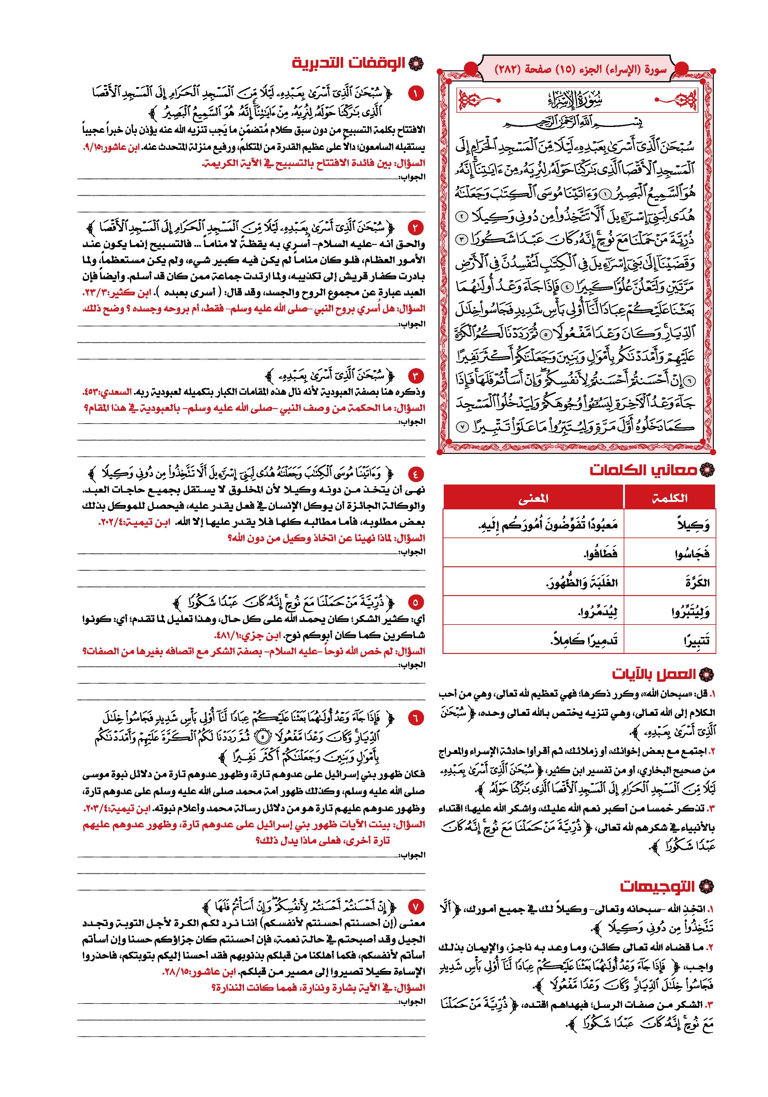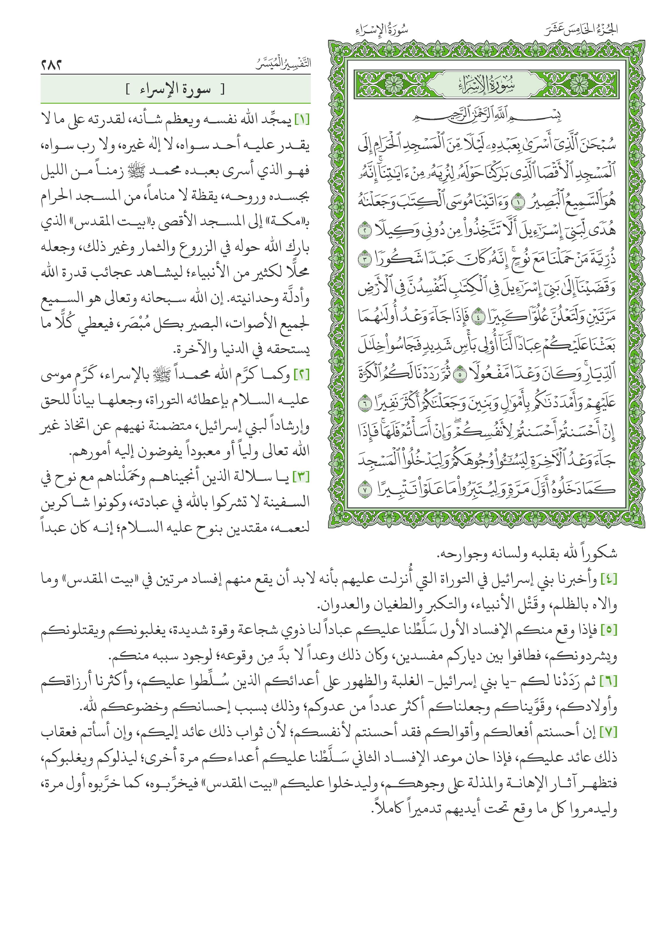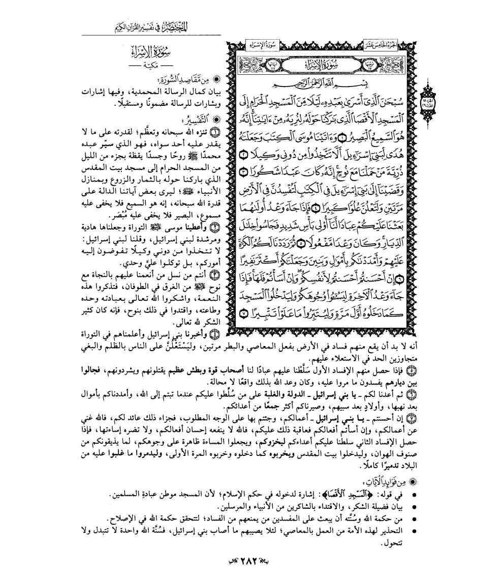 السعدى : ينزه تعالى نفسه المقدسة ويعظمها لأن له الأفعال العظيمة والمنن الجسيمة التي من جملتها أن { أَسْرَى بِعَبْدِهِ } ورسوله محمد صلى الله عليه وسلم { مِنَ الْمَسْجِدِ الْحَرَامِ } الذي هو أجل المساجد على الإطلاق { إِلَى الْمَسْجِدِ الْأَقْصَى } الذي هو من المساجد الفاضلة وهو محل الأنبياء. فأسري به في ليلة واحدة إلى مسافة بعيدة جدا ورجع في ليلته، وأراه الله من آياته ما ازداد به هدى وبصيرة وثباتا وفرقانا، وهذا من اعتنائه تعالى به ولطفه حيث يسره لليسرى في جميع أموره وخوله نعما فاق بها الأولين والآخرين، وظاهر الآية أن الإسراء كان في أول الليل وأنه من نفس المسجد الحرام، لكن ثبت في الصحيح أنه أسري به من بيت أم هانئ، فعلى هذا تكون الفضيلة في المسجد الحرام لسائر الحرم، فكله تضاعف فيه العبادة كتضاعفها في نفس المسجد، وأن الإسراء بروحه وجسده معا وإلا لم يكن في ذلك آية كبرى ومنقبة عظيمة. وقد تكاثرت الأحاديث الثابتة عن النبي صلى الله عليه وسلم في الإسراء، وذكر تفاصيل ما رأى وأنه أسري به إلى بيت المقدس ثم عرج به من هناك إلى السماوات حتى وصل إلى ما فوق السماوات العلى ورأى الجنة والنار، والأنبياء على مراتبهم وفرض عليه الصلوات خمسين، ثم ما زال يراجع ربه بإشارة موسى الكليم حتى صارت خمسا بالفعل، وخمسين بالأجر والثواب، وحاز من المفاخر تلك الليلة هو وأمته ما لا يعلم مقداره إلا الله عز وجل. وذكره هنا وفي مقام الإنزال للقرآن ومقام التحدي بصفة العبودية لأنه نال هذه المقامات الكبار بتكميله لعبودية ربه. وقوله: { الَّذِي بَارَكْنَا حَوْلَهُ } أي: بكثرة الأشجار والأنهار والخصب الدائم. ومن بركته تفضيله على غيره من المساجد سوى المسجد الحرام ومسجد المدينة، وأنه يطلب شد الرحل إليه للعبادة والصلاة فيه وأن الله اختصه محلا لكثير من أنبيائه وأصفيائه. الوسيط لطنطاوي : افتتحت سورة الإسراء بتنزيه الله - تعالى - عن كل ما لا يليق بجلاله ، كما يدل على ذلك لفظ " سبحان " الذى من أحسن وجوه إعرابه ، أنه اسم مصدر منصوب - على أنه مفعول مطلق - بفعل محذوف ، والتقدير : سبحت الله - تعالى - سبحانا أى تسبيحا ، بمعنى نزهته تنزيها عن كل سوء . قال القرطبى : " وقد روى طلحة بن عبيد الله الفياض أحد العشرة - أى المبشرين بالجنة - أنه قال للنبى صلى الله عليه وسلم : ما معنى سبحان الله؟ فقال : " تنزيه الله من كل سوء " " . وقوله ( أسرى ) من الإِسراء ، وهو السير بالليل خاصة . قال الجمل : يقال أسرى وسرى ، بمعنى سار فى الليل ، وهما لازمان ، لكن مصدر الأول الإِسراء ومصدر الثانى السرى - بضم السين كالهدى - فالهمزة ليست للتعدية إلى المفعول ، وإنما جاءت التعدية هنا من الباء . ومعنى أسرى به ، صيره ساريا فى الليل . والمراد ( بعبده ) خاتم أنبيائه محمد صلى الله عليه وسلم ، والإِضافة للتشريف والتكريم . وأوثر التعبير بلفظ العبد ، للدلالة على أن مقام العبودية لله - تعالى - هو أشرف صفات المخلوقين وأعظمها وأجلها ، إذ لو كان هناك وصف أعظم منه فى هذا المقام لعبر به ، وللإِشارة - أيضا - إلى تقرير هذه العبودية لله - تعالى - وتأكيدها ، حتى لا يلتبس مقام العبودية بمقام الألوهية ، كما التبسا فى العقائد المسيحية ، حيث ألهوا عيسى - عليه السلام - ، وألهوا أمه مريم ، مع أنهما بريئان من ذلك . . . قال الشيخ القاسمى نقلا عن الإِمام ابن القيم فى كتاب " طريق الهجرتين " : أكمل الخلق أكملهم عبودية لله - تعالى - ، ولهذا كان النبى صلى الله عليه وسلم أقرب الخلق إلى الله - تعالى - وأعظمهم عنده جاها ، وأرفعهم عنده منزلة ، لكماله فى مقام العبودية . وكان صلى الله عليه وسلم يقول : " أيها الناس ما أحب أن ترفعونى فوق منزلتى . إنما أنا عبد " وكان يقول : " لا تطرونى كما أطرت النصارى المسيح ابن مريم ، إنما أنا عبد فقولوا : عبد الله ورسوله " . وذكره - سبحانه - بسمة العبودية فى أشرف مقاماته : فى مقام الإِسراء حيث قال : ( سُبْحَانَ الذي أسرى بِعَبْدِهِ ) . وفى مقام الدعوة حيث قال : ( وَأَنَّهُ لَمَّا قَامَ عَبْدُ الله يَدْعُوهُ ) و
