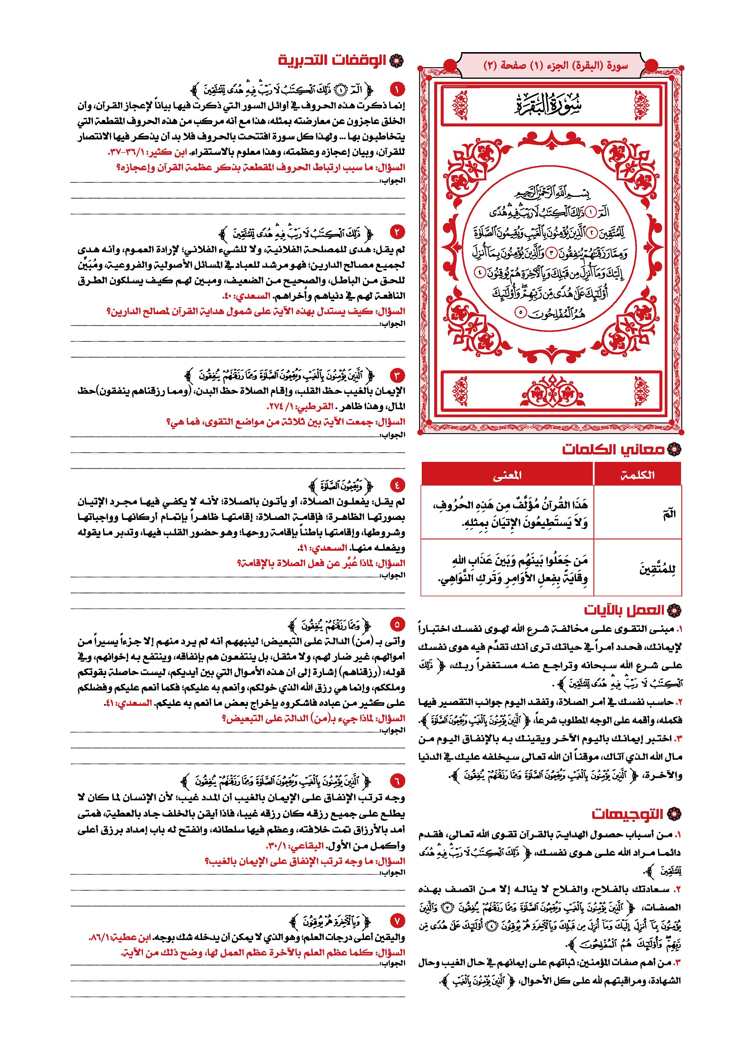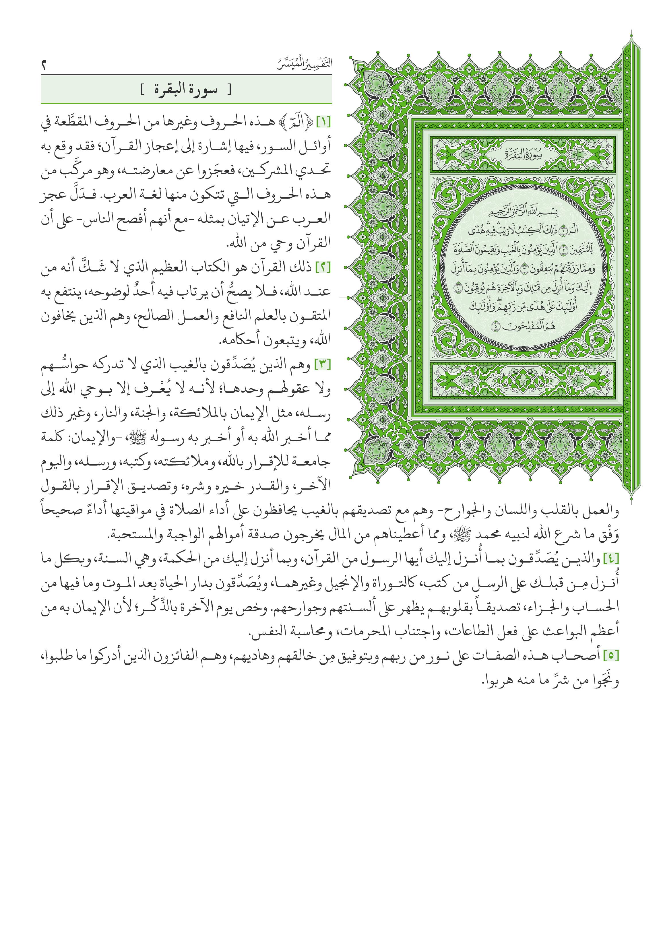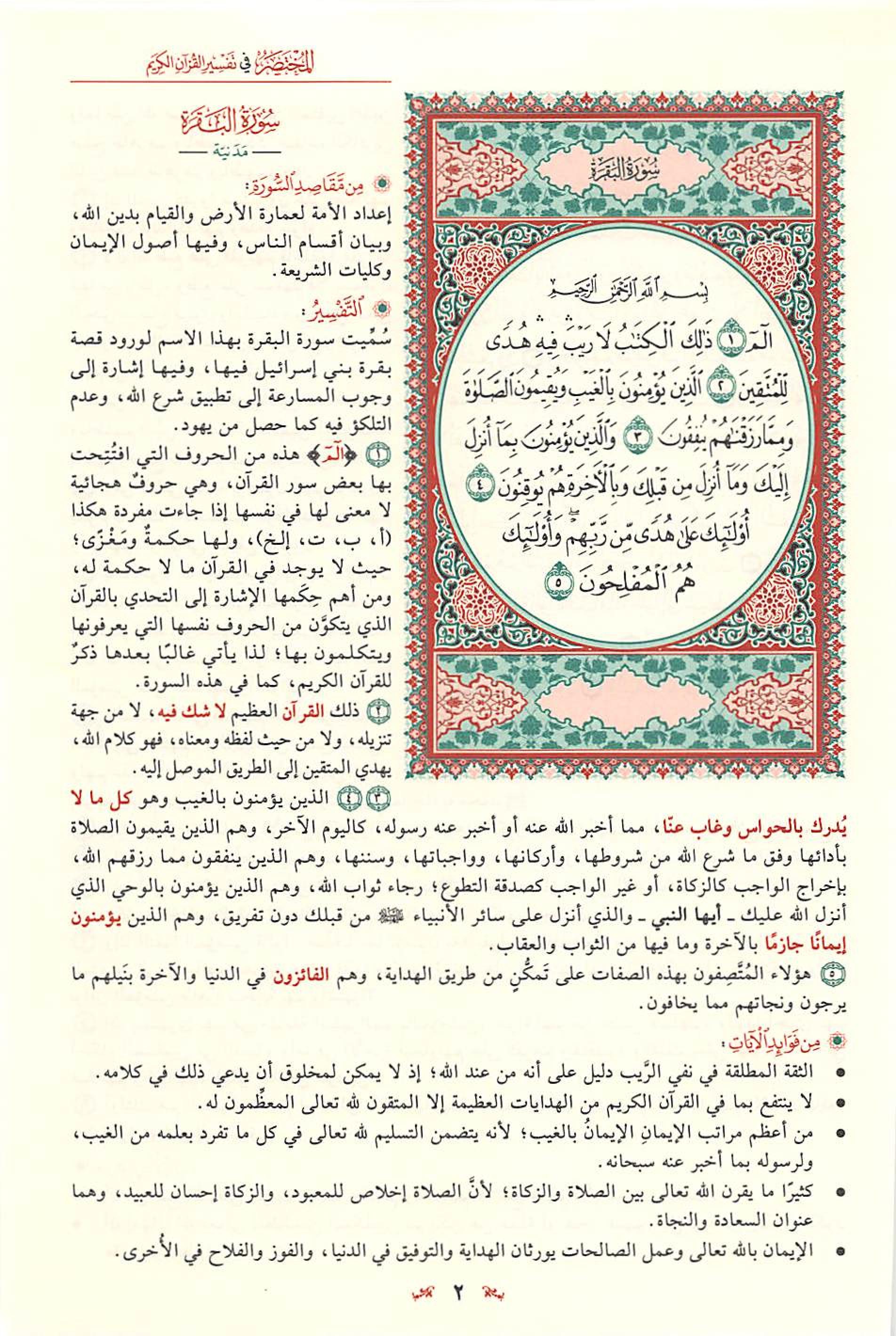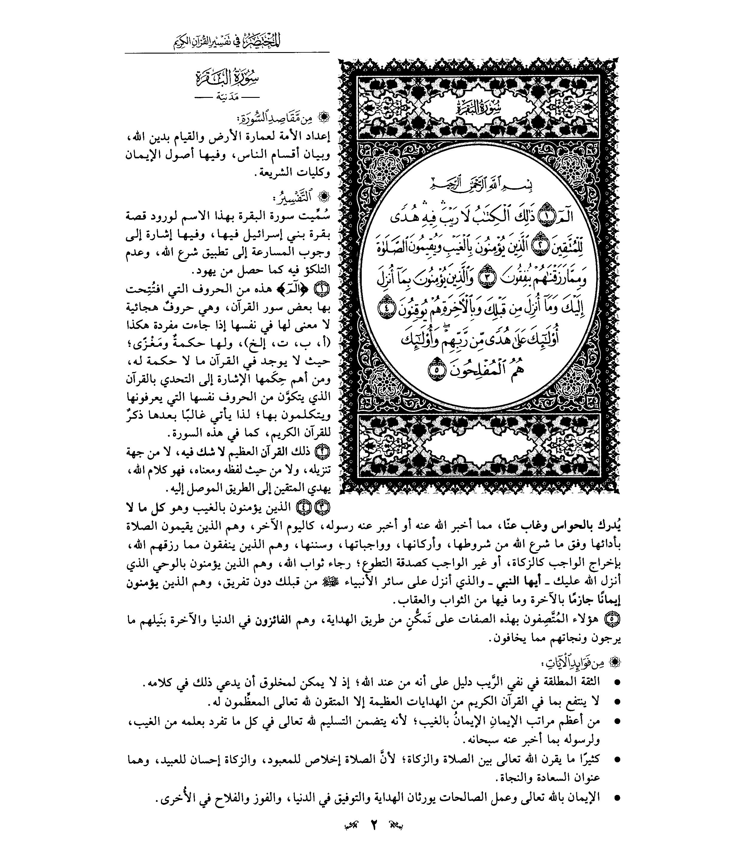 السعدى : الحروف المقطعة في أوائل السور, الأسلم فيها, السكوت عن التعرض لمعناها [من غير مستند شرعي], مع الجزم بأن الله تعالى لم ينزلها عبثا بل لحكمة لا نعلمها. الوسيط لطنطاوي : سورة البقرة أطول سورة في القرآن الكريم، فقد استغرقت جزءين ونصف جزء تقريبا من ثلاثين جزءا قسم إليها القرآن. وتبلغ آياتها ستا وثمانين ومائتي آية. وقيل سبع وثمانون ومائتا آية. وسميت بذلك لأنها انفردت بذكر قصة البقرة التي كلف قوم موسى بذبحها بعد أن قتل فيهم قتيل ولم يعرفوا قاتله. وهي مدنية بإجماع الآراء، وقد ابتدأ نزولها بعد هجرة النبي صلّى الله عليه وسلّم إلى المدينة، وقد نزل معظمها في السنوات الأولى من الهجرة، واستمر نزولها إلى قبيل وفاة النبي صلّى الله عليه وسلّم بفترة قليلة. وكانت آخر آية من القرآن نزولا منها، هي قوله- تعالى-: وَاتَّقُوا يَوْماً تُرْجَعُونَ فِيهِ إِلَى اللَّهِ ثُمَّ تُوَفَّى كُلُّ نَفْسٍ ما كَسَبَتْ وَهُمْ لا يُظْلَمُونَ. مناسبتها لسورة الفاتحة: هناك مناسبة ظاهرة بين السورتين، لأن سورة الفاتحة قد اشتملت على أحكام الألوهية والعبودية وطلب الهداية إلى الصراط المستقيم اشتمالا إجماليا، فجاءت سورة البقرة ففصلت تلك المقاصد، ووضحت ما اشتملت عليه سورة الفاتحة من هدايات وتوجيهات. فضلها: وقد ورد في فضل سورة البقرة أحاديث متعددة، وآثار متنوعة منها ما جاء في مسند أحمد وصحيح مسلّم والترمذي والنسائي عن أبي هريرة أن رسول الله صلّى الله عليه وسلّم قال: لا تجعلوا بيوتكم قبورا، فإن البيت الذي تقرأ فيه سورة البقرة لا يدخله الشيطان. وروى ابن حبان في صحيحه عن سهل بن سعد قال: قال رسول الله صلّى الله عليه وسلّم (إن لكل شيء سنام وإن سنام القرآن البقرة، وإن من قرأها في بيته لم يدخله الشيطان ثلاث ليال، ومن قرأها في بيته نهارا لم يدخله الشيطان ثلاثة أيام) . وروى الترمذي والنسائي وابن ماجة عن أبي هريرة قال: (بعث النبي صلّى الله عليه وسلّم بعثا، وهم ذوو عدد فاستقرأ كل واحد منهم عما معه من القرآن، فأتى على رجل من أحدثهم سنا فقال: ما معك يا فلان؟ فقال: معي كذا وكذا وسورة البقرة. فقال: أمعك سورة البقرة؟ قال: نعم. قال. اذهب فأنت أميرهم. فقال رجل من أشرافهم: والله ما منعني أن أتعلم سورة البقرة إلا أنى خشيت ألا أقوم بها. فقال رسول الله صلّى الله عليه وسلّم اقرءوا القرآن وتعلموه، فإن مثل القرآن لمن تعلمه فقرأه وقام به كمثل جراب أوكي أي أغلق- على مسك. قال القرطبي: وهذه السورة فضلها عظيم، وثوابها جسيم، ويقال لها فسطاط القرآن، وذلك لعظمها وبهائها وكثرة أحكامها ومواعظها «1» . مقاصدها: عند ما نفتح كتاب الله فنطالع فيه سورة البقرة بتدبر وعناية، نراها في مطلعها تنوه بشأن القرآن الكريم، وتصرح بأنه حق لا ريب فيه، وتبين لنا أن الناس أمام هدايته على ثلاثة أقسام: قسم آمن به وانتفع بهداياته فكانت عاقبته السعادة والفلاح. أُولئِكَ عَلى هُدىً مِنْ رَبِّهِمْ وَأُولئِكَ هُمُ الْمُفْلِحُونَ وقسم جحد واستكبر واستحب العمى على الهدى، فأصبح لا يرجى منه خير ولا إيمان، فكانت عاقبته الحرمان والخسران. خَتَمَ اللَّهُ عَلى قُلُوبِهِمْ وَعَلى سَمْعِهِمْ وَعَلى أَبْصارِهِمْ غِشاوَةٌ وَلَهُمْ عَذابٌ عَظِيمٌ. ثم فصلت السورة الحديث عن قسم ثالث هو شر ما تبتلى به الأمم وهم المنافقون الذين يظهرون خلاف ما يبطنون. وقد تحدثت السورة عنهم في ثلاث عشرة آية، كشفت فيها عن خداعهم، وجبنهم، ومرض قلوبهم، وبينت ما أعده الله لهم من سوء المصير، ثم زادت في فضيحتهم وهتك سرائرهم فضربت مثلين لحيرتهم واضطرابهم، قال- تعالى-: وَمِنَ النَّاسِ مَنْ يَقُولُ آمَنَّا بِاللَّهِ وَبِالْيَوْمِ الْآخِرِ وَما هُمْ بِمُؤْمِنِينَ. يُخادِعُونَ اللَّهَ وَالَّذِينَ آمَنُوا وَما يَخْدَعُونَ إِلَّا أَنْفُسَهُمْ وَما يَشْعُرُونَ. إلى أن يقول: وَلَوْ شاءَ اللَّهُ لَذَهَبَ بِسَمْعِهِمْ وَأَبْصارِهِمْ إِنَّ اللَّهَ عَلى كُلِّ شَيْءٍ قَدِيرٌ. ثم وجهت السورة نداء إلى الناس جميعا د