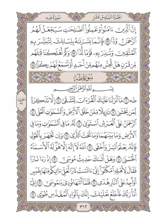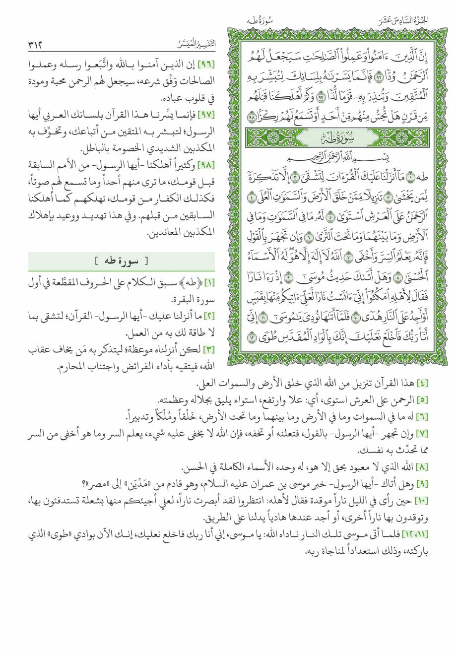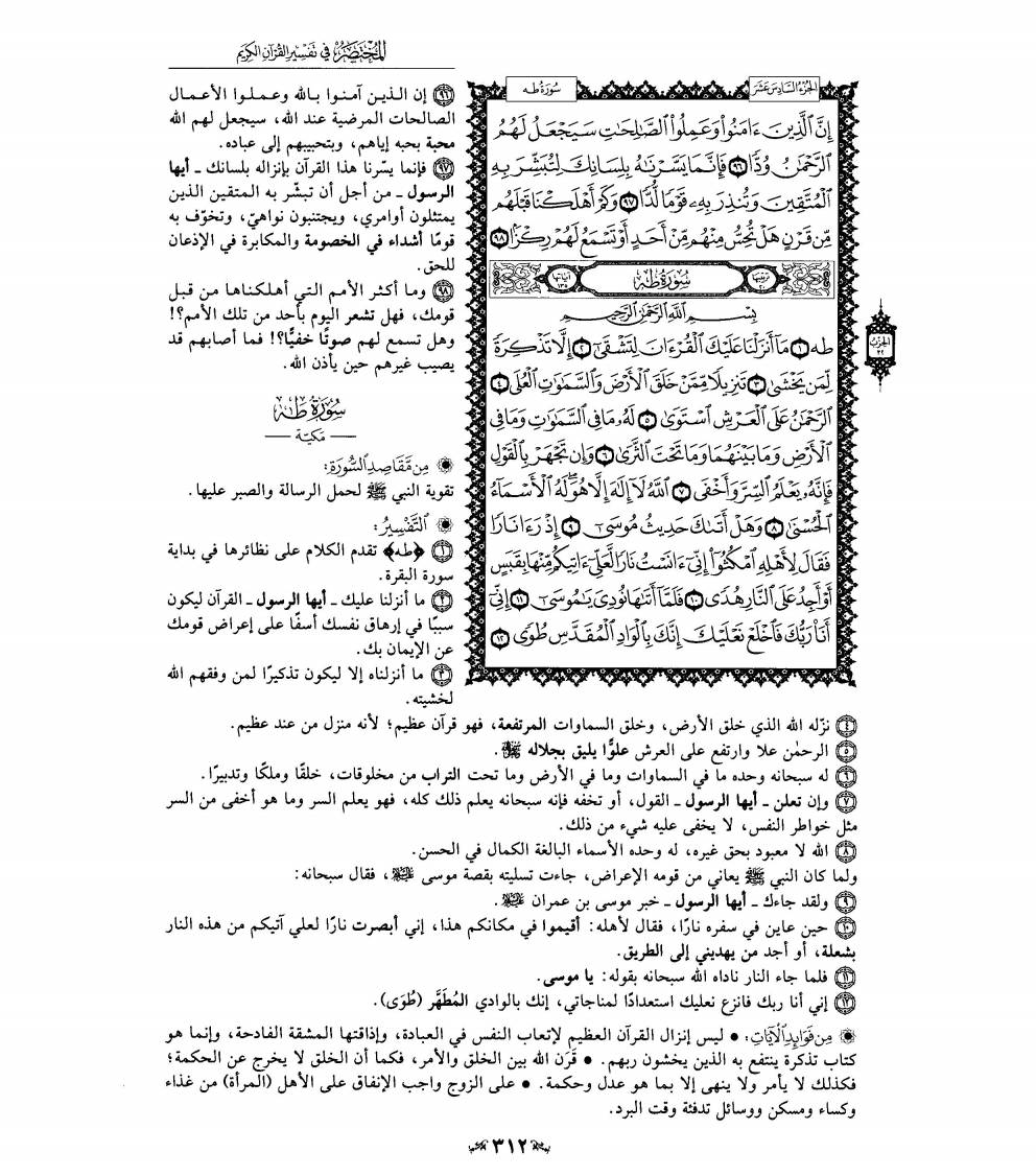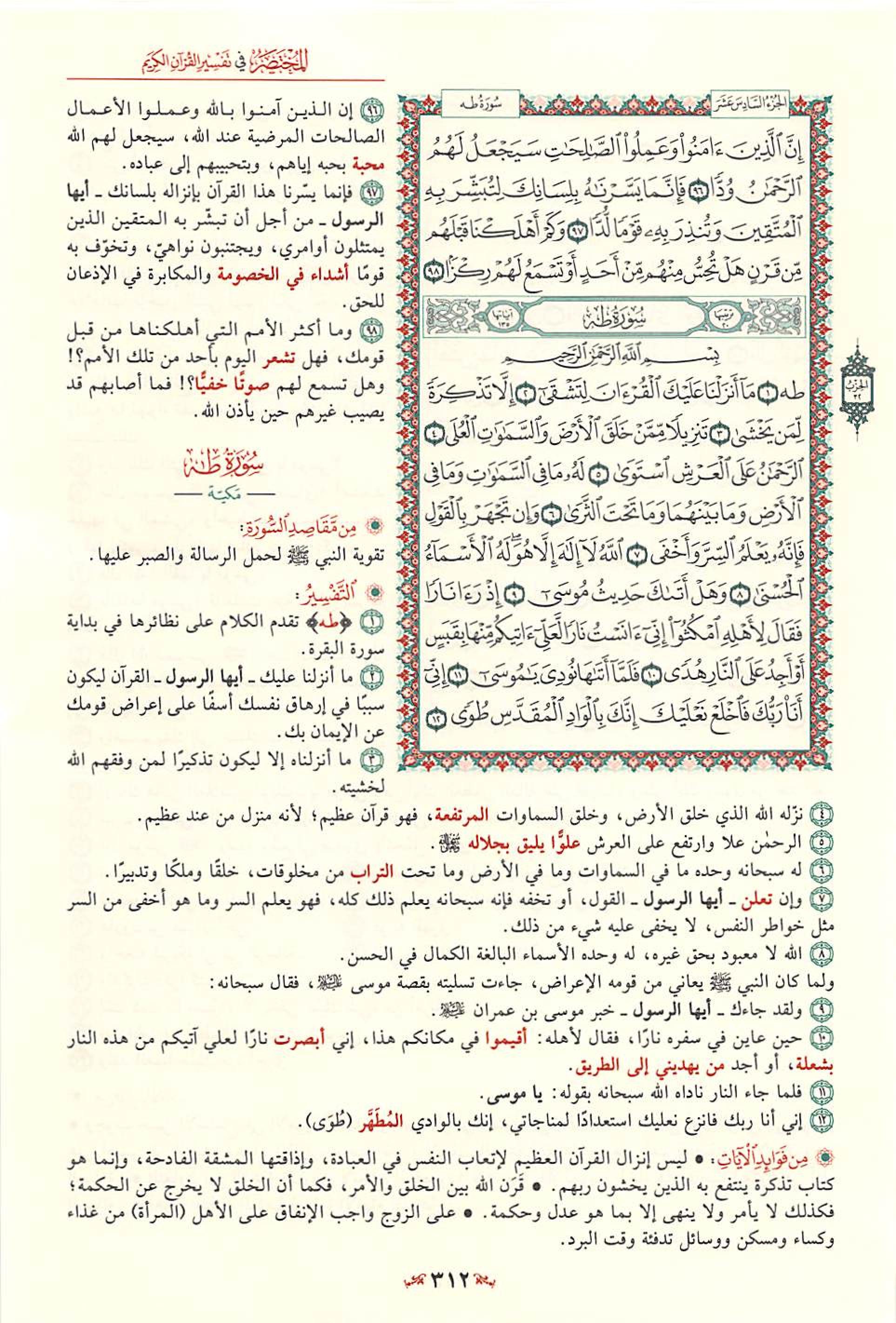 السعدى : { طه } من جملة الحروف المقطعة، المفتتح بها كثير من السور، وليست اسما للنبي صلى الله عليه وسلم. الوسيط لطنطاوي : تعريف بسورة طه 1- سورة «طه» من السور المكية. وكان ترتيبها في النزول بعد سورة مريم. قال الآلوسى: «وتسمى- أيضا- بسورة الكليم.. وآياتها- كما قال الداني- مائة وأربعون آية عند الشاميين ومائة وخمس وثلاثون عند الكوفيين، ومائة وأربع وثلاثون عند الحجازيين» . وقال القرطبي: «سورة طه- عليه السلام- مكية في قول الجميع، نزلت قبل إسلام عمر- رضى الله عنه-، فقد قيل له: إن ختنك وأختك قد صبوا- أى: دخلا في الإسلام- فأتاهما وعندهما رجل من المهاجرين.. يقال له: خباب وكانوا يقرءون «طه» ..» . 2- وقد افتتحت السورة الكريمة بخطاب النبي صلّى الله عليه وسلّم وببيان وظيفته، وببيان سمو منزلة القرآن الكريم: الذي أنزله عليه ربه الذي له ما في السموات وما في الأرض وما بينهما وما تحت الثرى. قال- تعالى-: طه. ما أَنْزَلْنا عَلَيْكَ الْقُرْآنَ لِتَشْقى. إِلَّا تَذْكِرَةً لِمَنْ يَخْشى. تَنْزِيلًا مِمَّنْ خَلَقَ الْأَرْضَ وَالسَّماواتِ الْعُلى. الرَّحْمنُ عَلَى الْعَرْشِ اسْتَوى.... 3- ثم فصلت السورة الكريمة الحديث عن قصة موسى- عليه السلام- فبدأت بنداء الله- تعالى- له، وباختياره لحمل رسالته. ثم تحدثت عن تكليفه- سبحانه- لموسى، بالذهاب إلى فرعون. قال- تعالى-: اذْهَبْ إِلى فِرْعَوْنَ إِنَّهُ طَغى قالَ رَبِّ اشْرَحْ لِي صَدْرِي. وَيَسِّرْ لِي أَمْرِي. وَاحْلُلْ عُقْدَةً مِنْ لِسانِي. يَفْقَهُوا قَوْلِي. وَاجْعَلْ لِي وَزِيراً مِنْ أَهْلِي. هارُونَ أَخِي. اشْدُدْ بِهِ أَزْرِي. وَأَشْرِكْهُ فِي أَمْرِي. 4- ثم حكت السورة ما دار بين موسى وبين فرعون من مناقشات ومجادلات، وكذلك ما دار بين موسى وبين السحرة الذين جمعهم فرعون لمنازلة موسى- عليه السلام- وكيف أن السحرة انتهى أمرهم بالإيمان، وبقولهم لفرعون: لَنْ نُؤْثِرَكَ عَلى ما جاءَنا مِنَ الْبَيِّناتِ وَالَّذِي فَطَرَنا فَاقْضِ ما أَنْتَ قاضٍ إِنَّما تَقْضِي هذِهِ الْحَياةَ الدُّنْيا. إِنَّا آمَنَّا بِرَبِّنا لِيَغْفِرَ لَنا خَطايانا، وَما أَكْرَهْتَنا عَلَيْهِ مِنَ السِّحْرِ، وَاللَّهُ خَيْرٌ وَأَبْقى. 5- ثم بينت السورة الكريمة ما فعله بنو إسرائيل في غيبة موسى عنهم، وكيف أن السامري قد أضلهم بأن جعلهم يعبدون عجلا له خوار ... وكيف أن موسى رجع إليهم غضبان أسفا.. فحطم العجل وأحرقه وألقاه في اليم وهو يقول: إِنَّما إِلهُكُمُ اللَّهُ الَّذِي لا إِلهَ إِلَّا هُوَ وَسِعَ كُلَّ شَيْءٍ عِلْماً. 6- وبعد أن فصلت السورة الكريمة الحديث عن قصة موسى- عليه السلام- عقبت على ذلك ببيان وظيفة القرآن الكريم، وببيان جانب من أهوال يوم القيامة، وسوء عاقبة الكافرين، وحسن عاقبة المؤمنين. قال- تعالى-: وَعَنَتِ الْوُجُوهُ لِلْحَيِّ الْقَيُّومِ وَقَدْ خابَ مَنْ حَمَلَ ظُلْماً. وَمَنْ يَعْمَلْ مِنَ الصَّالِحاتِ وَهُوَ مُؤْمِنٌ فَلا يَخافُ ظُلْماً وَلا هَضْماً. 7- ثم ساقت السورة في أواخرها جانبا من قصة آدم، فذكرت سجود الملائكة له، ونسيانه لأمر ربه، وقبول الله- تعالى- لتوبة آدم بعد أن وسوس له الشيطان بما وسوس.. قال- تعالى-: وَلَقَدْ عَهِدْنا إِلى آدَمَ مِنْ قَبْلُ فَنَسِيَ وَلَمْ نَجِدْ لَهُ عَزْماً. وَإِذْ قُلْنا لِلْمَلائِكَةِ اسْجُدُوا لِآدَمَ فَسَجَدُوا إِلَّا إِبْلِيسَ أَبى. فَقُلْنا يا آدَمُ إِنَّ هذا عَدُوٌّ لَكَ وَلِزَوْجِكَ فَلا يُخْرِجَنَّكُما مِنَ الْجَنَّةِ فَتَشْقى. 8- ثم ختمت السورة الكريمة بأمر النبي صلّى الله عليه وسلّم بالصبر وبالإكثار من ذكر الله- تعالى- وبعدم التطلع إلى زهرة الحياة الدنيا، وبأمر أهله بالصلاة. وبالرد على مزاعم المشركين، وبتهديدهم بسوء العاقبة إذا ما استمروا على ضلالهم.. قال- تعالى-: قُلْ كُلٌّ مُتَرَبِّصٌ فَتَرَبَّصُوا، فَسَتَعْلَمُونَ مَنْ أَصْحابُ الصِّراطِ السَّوِيِّ وَمَنِ اهْتَدى. 9- هذا عرض إجمالى لأهم المقاصد التي اشتملت عليها سورة طه. وم