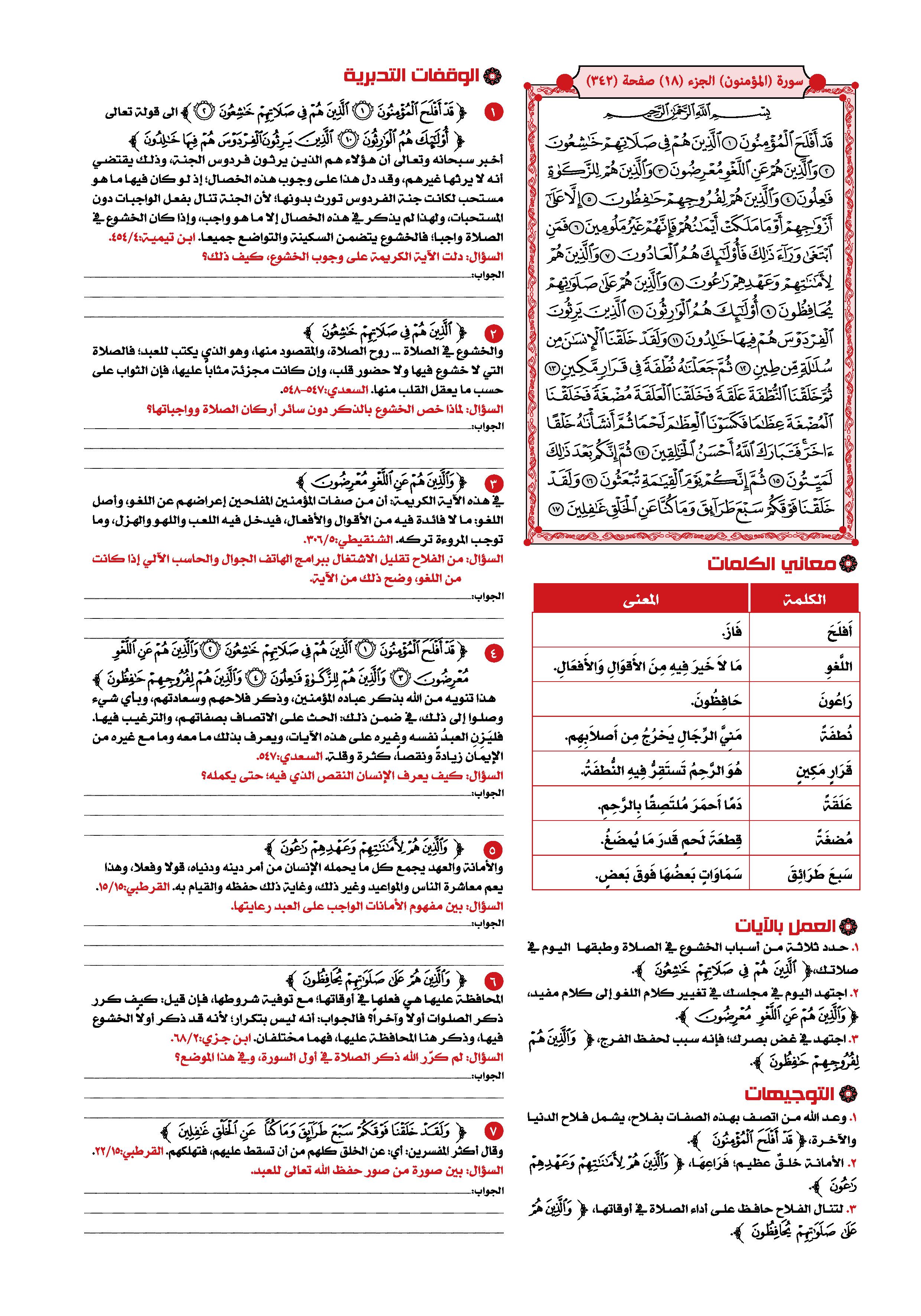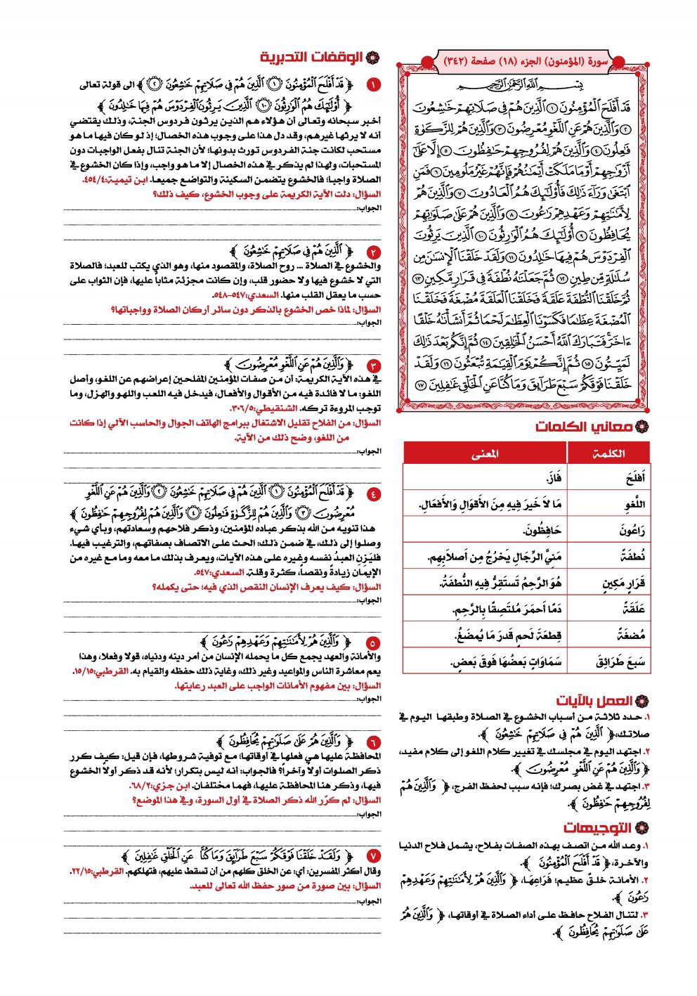 2- وقد افتتحت السورة الكريمة بالحديث عن الصفات الكريمة التي وصف الله- تعالى- بها عباده المؤمنين، فذكر منها أنهم في صلاتهم خاشعون وأنهم للزكاة فاعلون ...