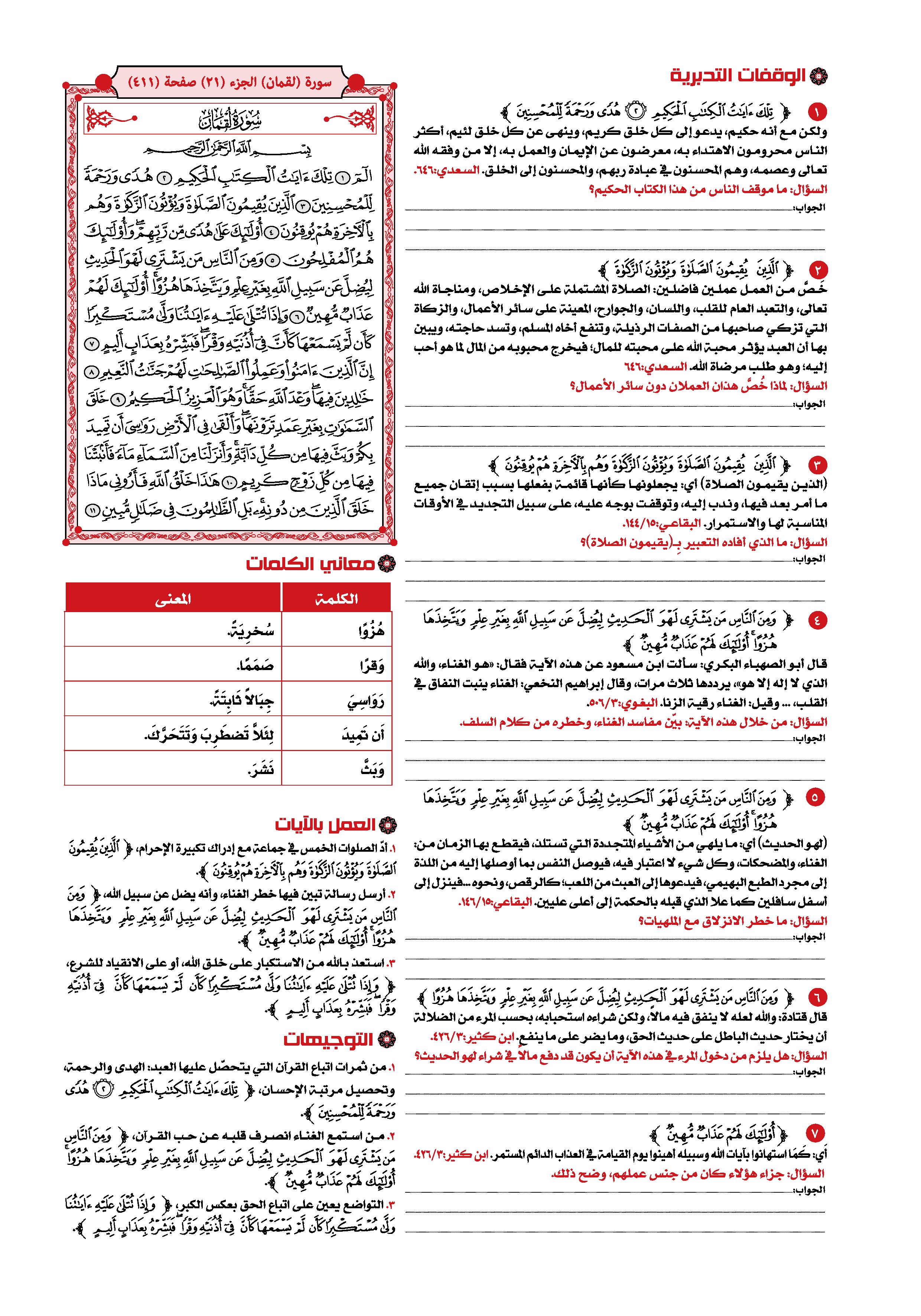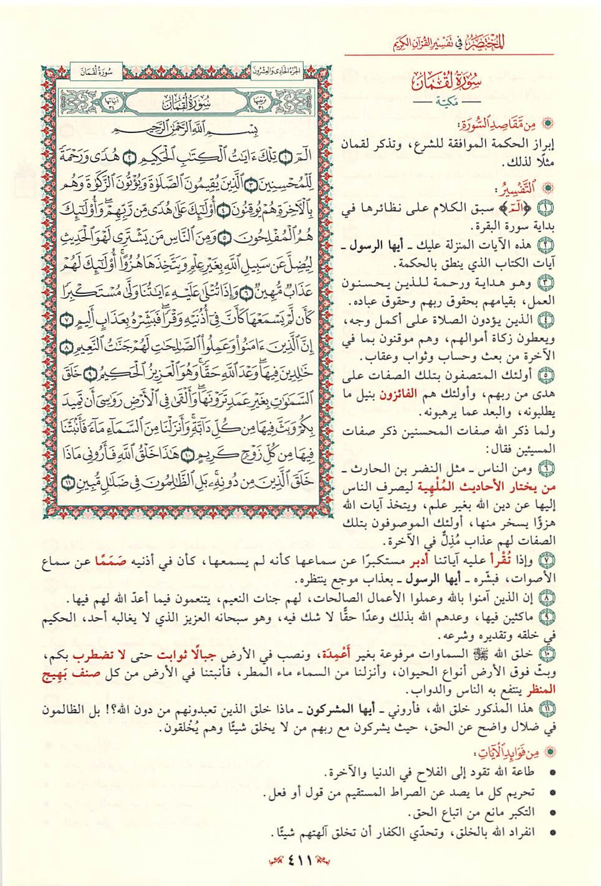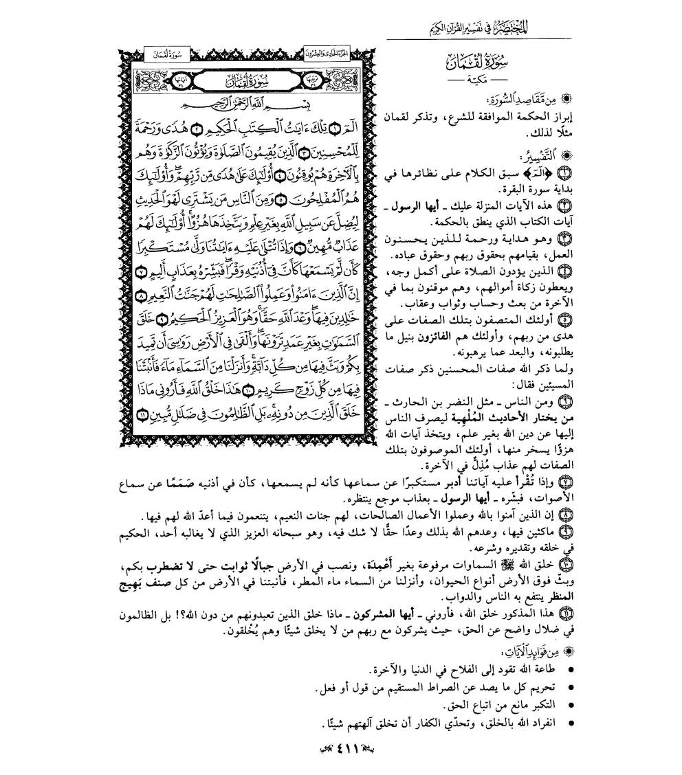 السعدى : تقدم الكلام عن الحروف المقطعة الوسيط لطنطاوي : مقدّمة 1- سورة لقمان هي السورة الحادية والثلاثون في ترتيب المصحف، أما ترتيبها في النزول فهي السورة السادسة والخمسون من بين السور المكية، وكان نزولها بعد سورة الصافات «1» . وعدد آياتها: أربع وثلاثون آية. وقد ذكر الإمام ابن كثير وغيره أنها مكية، دون أن يستثنى شيئا منها. وقال الآلوسى ما ملخصه: أخرج ابن الضريس، وابن مردويه، عن ابن عباس أنه قال: أنزلت سورة لقمان بمكة ... وفي رواية عنه: أنها مكية إلا ثلاث آيات تبدأ بقوله- تعالى-: وَلَوْ أَنَّما فِي الْأَرْضِ مِنْ شَجَرَةٍ أَقْلامٌ «2» . 2- وتبدأ السورة الكريمة، بالثناء على القرآن الكريم، وعلى المؤمنين الذين يقيمون الصلاة، ويؤتون الزكاة، وهم بالآخرة هم يوقنون. ثم تنتقل إلى الحديث عن جانب من صفات المشركين، الذين يستهزئون بآيات الله- تعالى-، ويعرضون عنها، وَإِذا تُتْلى عَلَيْهِ آياتُنا وَلَّى مُسْتَكْبِراً كَأَنْ لَمْ يَسْمَعْها، كَأَنَّ فِي أُذُنَيْهِ وَقْراً، فَبَشِّرْهُ بِعَذابٍ أَلِيمٍ. ثم ساقت أدلة متعددة على وحدانية الله- تعالى- وقدرته، قال- تعالى-: خَلَقَ السَّماواتِ بِغَيْرِ عَمَدٍ تَرَوْنَها، وَأَلْقى فِي الْأَرْضِ رَواسِيَ أَنْ تَمِيدَ بِكُمْ، وَبَثَّ فِيها مِنْ كُلِّ دابَّةٍ، وَأَنْزَلْنا مِنَ السَّماءِ ماءً فَأَنْبَتْنا فِيها مِنْ كُلِّ زَوْجٍ كَرِيمٍ. هذا خَلْقُ اللَّهِ فَأَرُونِي ماذا خَلَقَ الَّذِينَ مِنْ دُونِهِ، بَلِ الظَّالِمُونَ فِي ضَلالٍ مُبِينٍ. 3- ثم قص علينا- سبحانه- تلك الوصايا الحكيمة، التي أوصى بها لقمان ابنه، والتي اشتملت على ما يهدى إلى العقيدة السليمة، وإلى الأخلاق الكريمة، وإلى مراقبة الخالق- عز وجل- وإلى أداء العبادات التي كلفنا- سبحانه- بها. ومن هذه الوصايا قوله- سبحانه-: يا بُنَيَّ أَقِمِ الصَّلاةَ، وَأْمُرْ بِالْمَعْرُوفِ وَانْهَ عَنِ الْمُنْكَرِ، وَاصْبِرْ عَلى ما أَصابَكَ، إِنَّ ذلِكَ مِنْ عَزْمِ الْأُمُورِ. وَلا تُصَعِّرْ خَدَّكَ لِلنَّاسِ وَلا تَمْشِ فِي الْأَرْضِ مَرَحاً، إِنَّ اللَّهَ لا يُحِبُّ كُلَّ مُخْتالٍ فَخُورٍ. وَاقْصِدْ فِي مَشْيِكَ، وَاغْضُضْ مِنْ صَوْتِكَ، إِنَّ أَنْكَرَ الْأَصْواتِ لَصَوْتُ الْحَمِيرِ. 4- ثم بين- سبحانه- ألوانا من نعمه على عباده، منها ما يتعلق بخلق السموات، ومنها ما يتعلق بخلق الأرض، كما بين- عز وجل- أن علمه محيط بكل شيء، وأنه لا نهاية له.. قال- تعالى-: وَلَوْ أَنَّما فِي الْأَرْضِ مِنْ شَجَرَةٍ أَقْلامٌ وَالْبَحْرُ يَمُدُّهُ مِنْ بَعْدِهِ سَبْعَةُ أَبْحُرٍ، ما نَفِدَتْ كَلِماتُ اللَّهِ، إِنَّ اللَّهَ عَزِيزٌ حَكِيمٌ. ما خَلْقُكُمْ وَلا بَعْثُكُمْ إِلَّا كَنَفْسٍ واحِدَةٍ، إِنَّ اللَّهَ سَمِيعٌ بَصِيرٌ. 5- ثم ختم- سبحانه- السورة الكريمة، بدعوة الناس جميعا إلى تقواه- عز وجل- وإلى بيان الأمور الخمسة التي لا يعلمها إلا هو- سبحانه- فقال: يا أَيُّهَا النَّاسُ اتَّقُوا رَبَّكُمْ وَاخْشَوْا يَوْماً لا يَجْزِي والِدٌ عَنْ وَلَدِهِ، وَلا مَوْلُودٌ هُوَ جازٍ عَنْ والِدِهِ شَيْئاً، إِنَّ وَعْدَ اللَّهِ حَقٌّ، فَلا تَغُرَّنَّكُمُ الْحَياةُ الدُّنْيا، وَلا يَغُرَّنَّكُمْ بِاللَّهِ الْغَرُورُ. إِنَّ اللَّهَ عِنْدَهُ عِلْمُ السَّاعَةِ، وَيُنَزِّلُ الْغَيْثَ، وَيَعْلَمُ ما فِي الْأَرْحامِ، وَما تَدْرِي نَفْسٌ ماذا تَكْسِبُ غَداً، وَما تَدْرِي نَفْسٌ بِأَيِّ أَرْضٍ تَمُوتُ، إِنَّ اللَّهَ عَلِيمٌ خَبِيرٌ. 6- هذا، والمتأمل في هذه السورة الكريمة، يراها قد خاطبت النفس البشرية، بما من شأنه أن يسعدها ويحييها حياة طيبة. إنها قد بينت أوصاف المؤمنين الصادقين، وأوصاف أعدائهم: وبينت عاقبة الأخيار وعاقبة الأشرار، ووضحت تلك الوصايا الحكيمة التي أوصى بها لقمان ابنه وأحب الناس إليه، وساقت أنواعا من النعم التي أنعم بها- سبحانه- على عباده، وبينت أن هناك أمورا لا يعلمها إلا الله- تعالى- وحده. وقد ساق