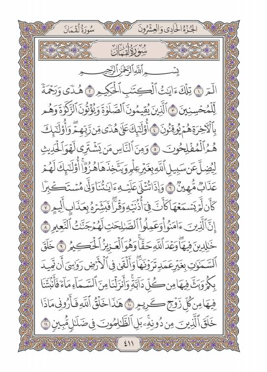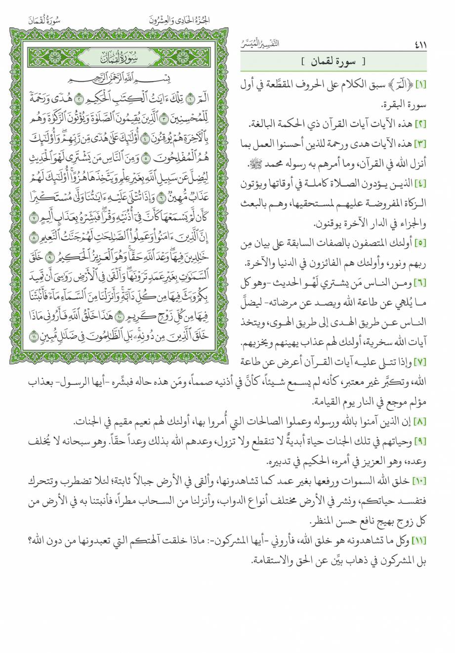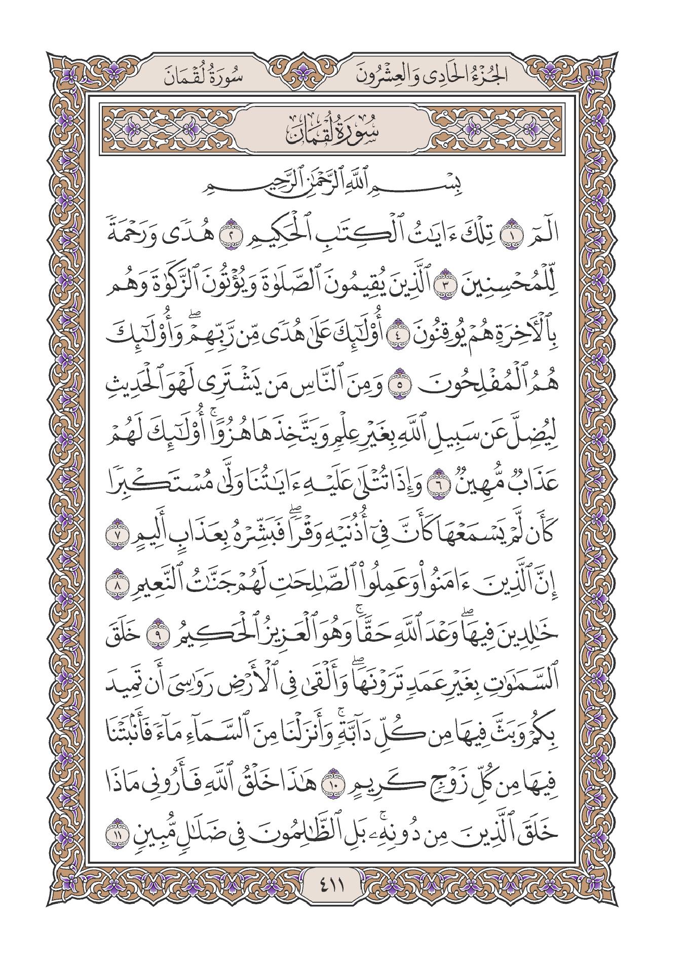 السعدى : تقدم الكلام عن الحروف المقطعة الوسيط لطنطاوي : مقدّمة 1- سورة لقمان هي السورة الحادية والثلاثون في ترتيب المصحف، أما ترتيبها في النزول فهي السورة السادسة والخمسون من بين السور المكية، وكان نزولها بعد سورة الصافات «1» . وعدد آياتها: أربع وثلاثون آية. وقد ذكر الإمام ابن كثير وغيره أنها مكية، دون أن يستثنى شيئا منها. وقال الآلوسى ما ملخصه: أخرج ابن الضريس، وابن مردويه، عن ابن عباس أنه قال: أنزلت سورة لقمان بمكة ... وفي رواية عنه: أنها مكية إلا ثلاث آيات تبدأ بقوله- تعالى-: وَلَوْ أَنَّما فِي الْأَرْضِ مِنْ شَجَرَةٍ أَقْلامٌ «2» . 2- وتبدأ السورة الكريمة، بالثناء على القرآن الكريم، وعلى المؤمنين الذين يقيمون الصلاة، ويؤتون الزكاة، وهم بالآخرة هم يوقنون. ثم تنتقل إلى الحديث عن جانب من صفات المشركين، الذين يستهزئون بآيات الله- تعالى-، ويعرضون عنها، وَإِذا تُتْلى عَلَيْهِ آياتُنا وَلَّى مُسْتَكْبِراً كَأَنْ لَمْ يَسْمَعْها، كَأَنَّ فِي أُذُنَيْهِ وَقْراً، فَبَشِّرْهُ بِعَذابٍ أَلِيمٍ. ثم ساقت أدلة متعددة على وحدانية الله- تعالى- وقدرته، قال- تعالى-: خَلَقَ السَّماواتِ بِغَيْرِ عَمَدٍ تَرَوْنَها، وَأَلْقى فِي الْأَرْضِ رَواسِيَ أَنْ تَمِيدَ بِكُمْ، وَبَثَّ فِيها مِنْ كُلِّ دابَّةٍ، وَأَنْزَلْنا مِنَ السَّماءِ ماءً فَأَنْبَتْنا فِيها مِنْ كُلِّ زَوْجٍ كَرِيمٍ. هذا خَلْقُ اللَّهِ فَأَرُونِي ماذا خَلَقَ الَّذِينَ مِنْ دُونِهِ، بَلِ الظَّالِمُونَ فِي ضَلالٍ مُبِينٍ. 3- ثم قص علينا- سبحانه- تلك الوصايا الحكيمة، التي أوصى بها لقمان ابنه، والتي اشتملت على ما يهدى إلى العقيدة السليمة، وإلى الأخلاق الكريمة، وإلى مراقبة الخالق- عز وجل- وإلى أداء العبادات التي كلفنا- سبحانه- بها. ومن هذه الوصايا قوله- سبحانه-: يا بُنَيَّ أَقِمِ الصَّلاةَ، وَأْمُرْ بِالْمَعْرُوفِ وَانْهَ عَنِ الْمُنْكَرِ، وَاصْبِرْ عَلى ما أَصابَكَ، إِنَّ ذلِكَ مِنْ عَزْمِ الْأُمُورِ. وَلا تُصَعِّرْ خَدَّكَ لِلنَّاسِ وَلا تَمْشِ فِي الْأَرْضِ مَرَحاً، إِنَّ اللَّهَ لا يُحِبُّ كُلَّ مُخْتالٍ فَخُورٍ. وَاقْصِدْ فِي مَشْيِكَ، وَاغْضُضْ مِنْ صَوْتِكَ، إِنَّ أَنْكَرَ الْأَصْواتِ لَصَوْتُ الْحَمِيرِ. 4- ثم بين- سبحانه- ألوانا من نعمه على عباده، منها ما يتعلق بخلق السموات، ومنها ما يتعلق بخلق الأرض، كما بين- عز وجل- أن علمه محيط بكل شيء، وأنه لا نهاية له.. قال- تعالى-: وَلَوْ أَنَّما فِي الْأَرْضِ مِنْ شَجَرَةٍ أَقْلامٌ وَالْبَحْرُ يَمُدُّهُ مِنْ بَعْدِهِ سَبْعَةُ أَبْحُرٍ، ما نَفِدَتْ كَلِماتُ اللَّهِ، إِنَّ اللَّهَ عَزِيزٌ حَكِيمٌ. ما خَلْقُكُمْ وَلا بَعْثُكُمْ إِلَّا كَنَفْسٍ واحِدَةٍ، إِنَّ اللَّهَ سَمِيعٌ بَصِيرٌ. 5- ثم ختم- سبحانه- السورة الكريمة، بدعوة الناس جميعا إلى تقواه- عز وجل- وإلى بيان الأمور الخمسة التي لا يعلمها إلا هو- سبحانه- فقال: يا أَيُّهَا النَّاسُ اتَّقُوا رَبَّكُمْ وَاخْشَوْا يَوْماً لا يَجْزِي والِدٌ عَنْ وَلَدِهِ، وَلا مَوْلُودٌ هُوَ جازٍ عَنْ والِدِهِ شَيْئاً، إِنَّ وَعْدَ اللَّهِ حَقٌّ، فَلا تَغُرَّنَّكُمُ الْحَياةُ الدُّنْيا، وَلا يَغُرَّنَّكُمْ بِاللَّهِ الْغَرُورُ. إِنَّ اللَّهَ عِنْدَهُ عِلْمُ السَّاعَةِ، وَيُنَزِّلُ الْغَيْثَ، وَيَعْلَمُ ما فِي الْأَرْحامِ، وَما تَدْرِي نَفْسٌ ماذا تَكْسِبُ غَداً، وَما تَدْرِي نَفْسٌ بِأَيِّ أَرْضٍ تَمُوتُ، إِنَّ اللَّهَ عَلِيمٌ خَبِيرٌ. 6- هذا، والمتأمل في هذه السورة الكريمة، يراها قد خاطبت النفس البشرية، بما من شأنه أن يسعدها ويحييها حياة طيبة. إنها قد بينت أوصاف المؤمنين الصادقين، وأوصاف أعدائهم: وبينت عاقبة الأخيار وعاقبة الأشرار، ووضحت تلك الوصايا الحكيمة التي أوصى بها لقمان ابنه وأحب الناس إليه، وساقت أنواعا من النعم التي أنعم بها- سبحانه- على عباده، وبينت أن هناك أمورا لا يعلمها إلا الله- تعالى- وحده. وقد ساق