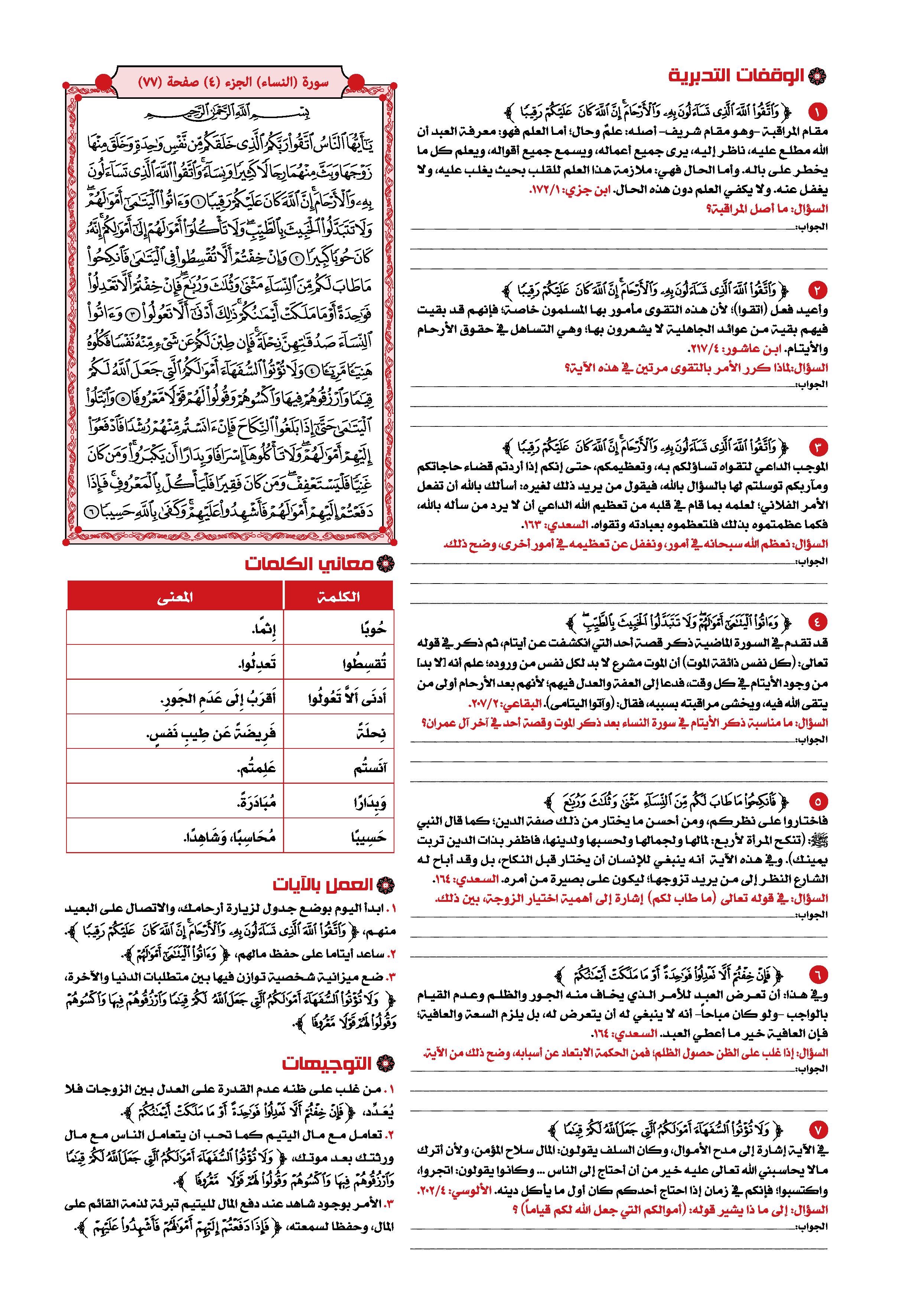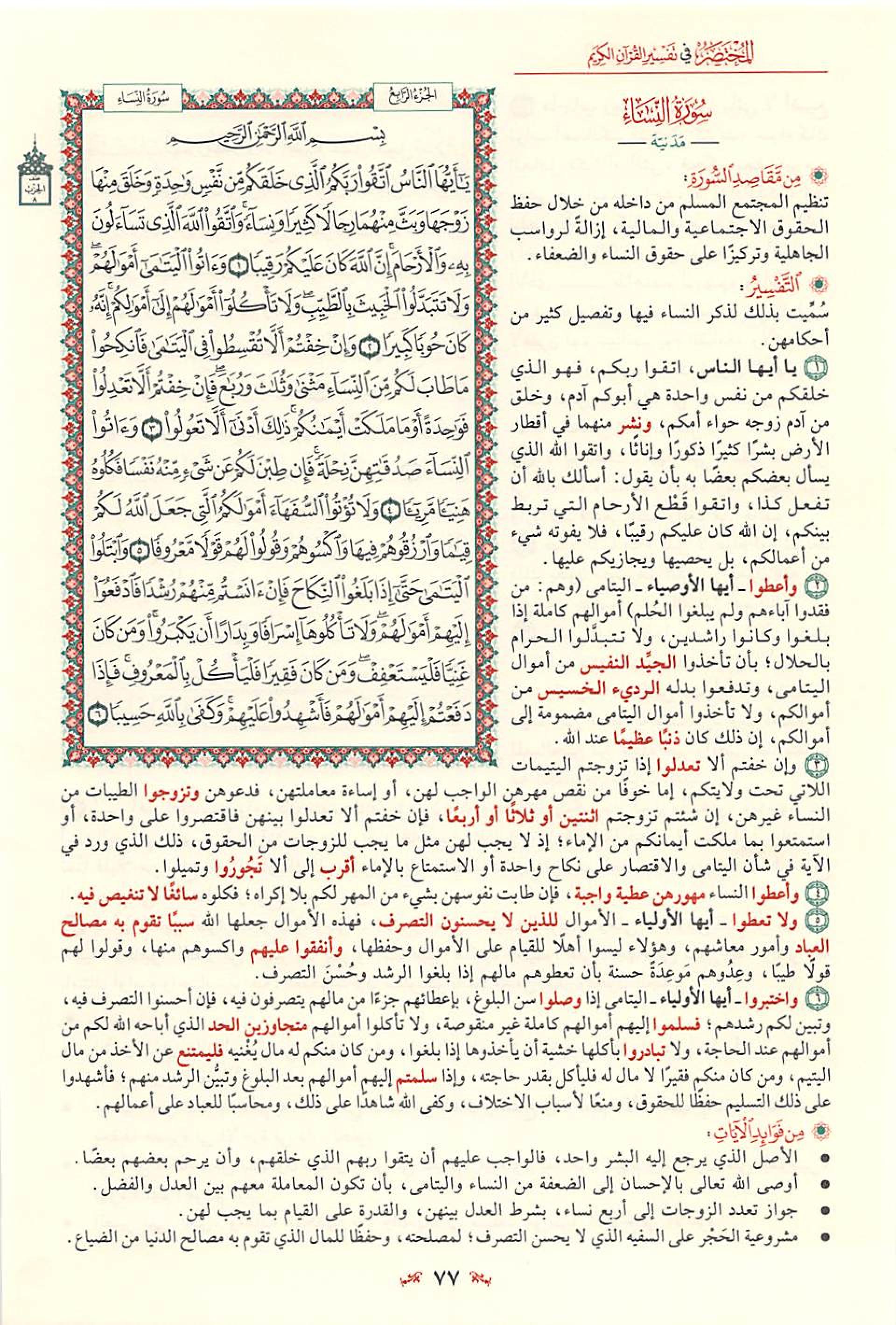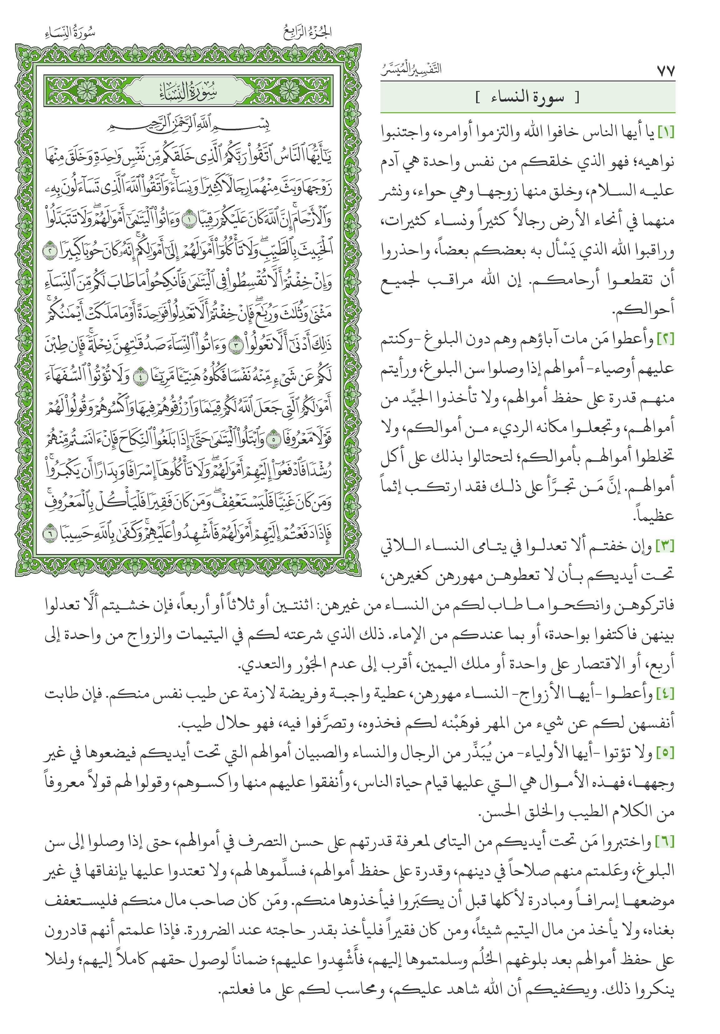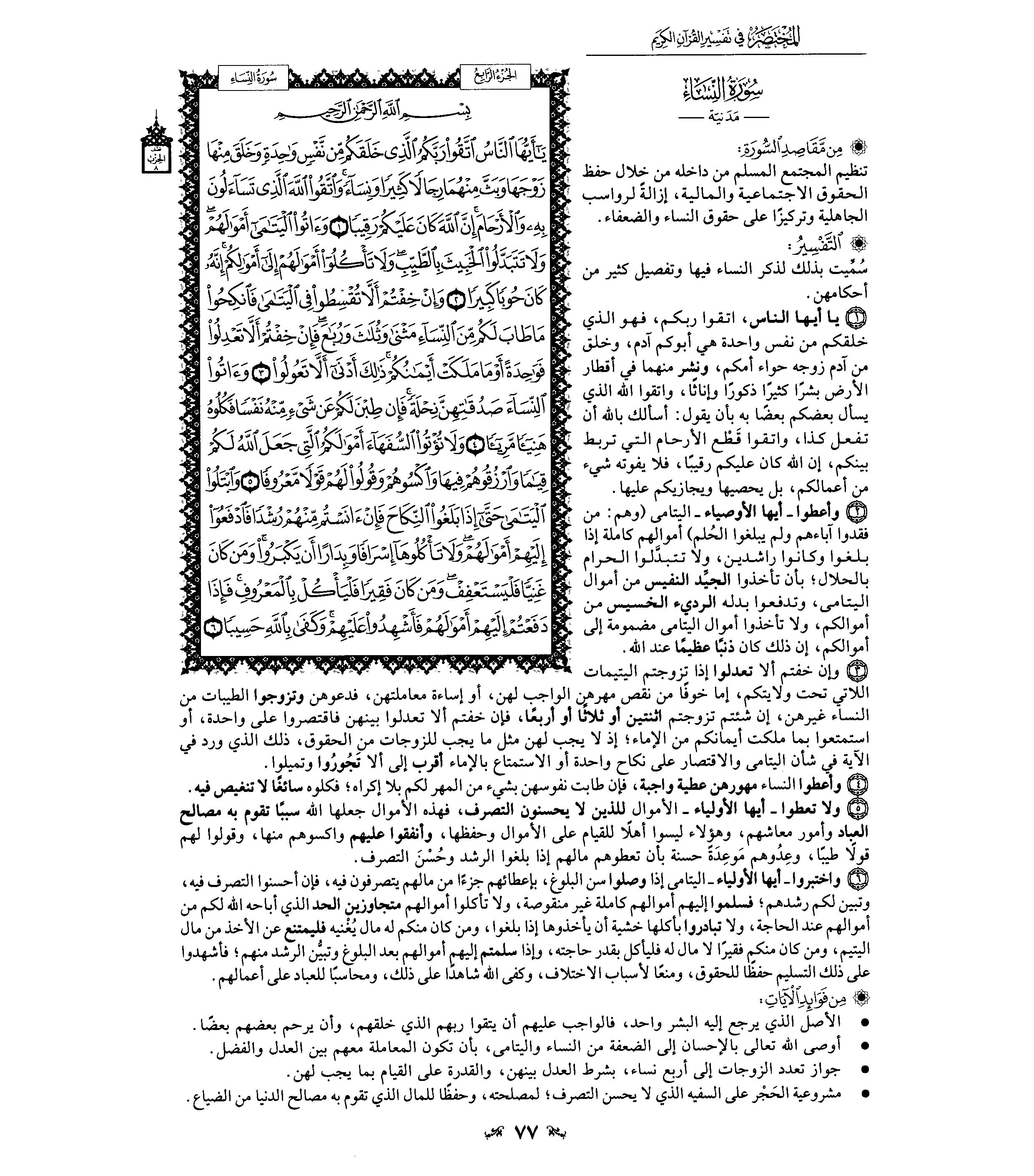 السعدى : افتتح تعالى هذه السورة بالأمر بتقواه، والحث على عبادته، والأمر بصلة الأرحام، والحث على ذلك. وبيَّن السبب الداعي الموجب لكل من ذلك، وأن الموجب لتقواه لأنه { رَبَّكُمُ الَّذِي خَلَقَكُمْ } ورزقكم، ورباكم بنعمه العظيمة، التي من جملتها خلقكم { مِن نَّفْسٍ وَاحِدَةٍ وَخَلَقَ مِنْهَا زَوْجَهَا } ليناسبها، فيسكن إليها، وتتم بذلك النعمة، ويحصل به السرور، وكذلك من الموجب الداعي لتقواه تساؤلكم به وتعظيمكم، حتى إنكم إذا أردتم قضاء حاجاتكم ومآربكم، توسلتم بـها بالسؤال بالله. فيقول من يريد ذلك لغيره: أسألك بالله أن تفعل الأمر الفلاني؛ لعلمه بما قام في قلبه من تعظيم الله الداعي أن لا يرد من سأله بالله، فكما عظمتموه بذلك فلتعظموه بعبادته وتقواه. وكذلك الإخبار بأنه رقيب، أي: مطلع على العباد في حال حركاتـهم وسكونـهم، وسرهم وعلنهم، وجميع أحوالهم، مراقبا لهم فيها مما يوجب مراقبته، وشدة الحياء منه، بلزوم تقواه. وفي الإخبار بأنه خلقهم من نفس واحدة، وأنه بثهم في أقطار الأرض، مع رجوعهم إلى أصل واحد -ليعطف بعضهم على بعض، ويرقق بعضهم على بعض. وقرن الأمر بتقواه بالأمر ببر الأرحام والنهي عن قطيعتها، ليؤكد هذا الحق، وأنه كما يلزم القيام بحق الله، كذلك يجب القيام بحقوق الخلق، خصوصا الأقربين منهم، بل القيام بحقوقهم هو من حق الله الذي أمر به. وتأمل كيف افتتح هذه السورة بالأمر بالتقوى، وصلة الأرحام والأزواج عموما، ثم بعد ذلك فصل هذه الأمور أتم تفصيل، من أول السورة إلى آخرها. فكأنـها مبنية على هذه الأمور المذكورة، مفصلة لما أجمل منها، موضحة لما أبهم. وفي قوله: { وخلق مِنْهَا زَوْجَهَا } تنبيه على مراعاة حق الأزواج والزوجات والقيام به، لكون الزوجات مخلوقات من الأزواج، فبينهم وبينهن أقرب نسب وأشد اتصال، وأقرب علاقة. الوسيط لطنطاوي : سورة النساء بسم الله الرّحمن الرّحيم مقدّمة الحمد لله رب العالمين، والصلاة والسلام على أفضل المرسلين، سيدنا محمد وعلى آله وأصحابه وأتباعه ومن دعا بدعوته إلى يوم الدين. وبعد: فإن خير ما اشتغل به العقلاء، هو خدمة كتاب الله- تعالى-، الذي أنزله- سبحانه- على قلب نبيه محمد- صلى الله عليه وسلم- لكي يخرج الناس من الظلمات إلى النور. ولقد عنى المسلمون منذ فجر الإسلام عناية كبرى بشأن القرآن الكريم. وقد شملت هذه العناية جميع نواحيه، وأحاطت بكل ما يتصل به، وكان لها آثارها المباركة النافعة التي استفاد منها كل مظهر من مظاهر النشاط الفكرى والعملي عرفه الناس في حياتهم الروحية والمادية. وكان من أبرز مظاهر هذه العناية بشأن القرآن الكريم، الاشتغال بتفسيره وتأويله على قدر الطاقة البشرية. ولقد سبق لي أن كتبت تفسيرا وسيطا لسور: الفاتحة، والبقرة، وآل عمران. ويسعدني أن أتبع ذلك بتفسير لسورة النساء، حاولت فيه أن أكتب عما اشتملت عليه هذه السورة الكريمة من هدايات جامعة، وتشريعات حكيمة وتوجيهات رشيدة، وآداب سامية، من شأنها أن توصل المتمسكين بها إلى طريق السعادة في دنياهم وآخرتهم. وقبل أن أبدأ في تفسير آيات هذه السورة الكريمة بالتفصيل والتحليل. رأيت من الخير أن أسوق بين يديها تعريفا بها، يتناول زمان نزولها، وعدد آياتها، وسبب تسميتها بهذا الاسم، ومناسبتها لما قبلها، والمقاصد الإجمالية التي اشتملت عليها. والله نسأل أن يوفقنا لخدمة كتابه، وأن يجعل هذا العمل خالصا لوجهه، ونافعا لعباده، إنه أكرم مسئول وأعظم مأمول. وصلى الله على سيدنا محمد وعلى آله وصحبه وسلم. تمهيد بين يدي السورة 1- سورة النساء هي الرابعة في ترتيب المصحف. فقد سبقتها سورة الفاتحة، والبقرة، وآل عمران. ويبلغ عدد آياتها خمسا وسبعين ومائة آية عند علماء الحجاز والبصريين، ويرى الكوفيون أن عدد آياتها ست وسبعون ومائة آية، لأنهم عدوا قوله- تعالى- أَنْ تَضِلُّوا السَّبِيلَ آية. ويرى الشاميون أن عدد آياتها سبع وسبعون ومائة آية، لأنهم عدوا قوله- تعالى- وَأَمَّا الَّذِينَ اسْتَنْكَفُوا وَاسْتَكْبَرُوا فَيُعَذِّبُهُمْ عَذابا