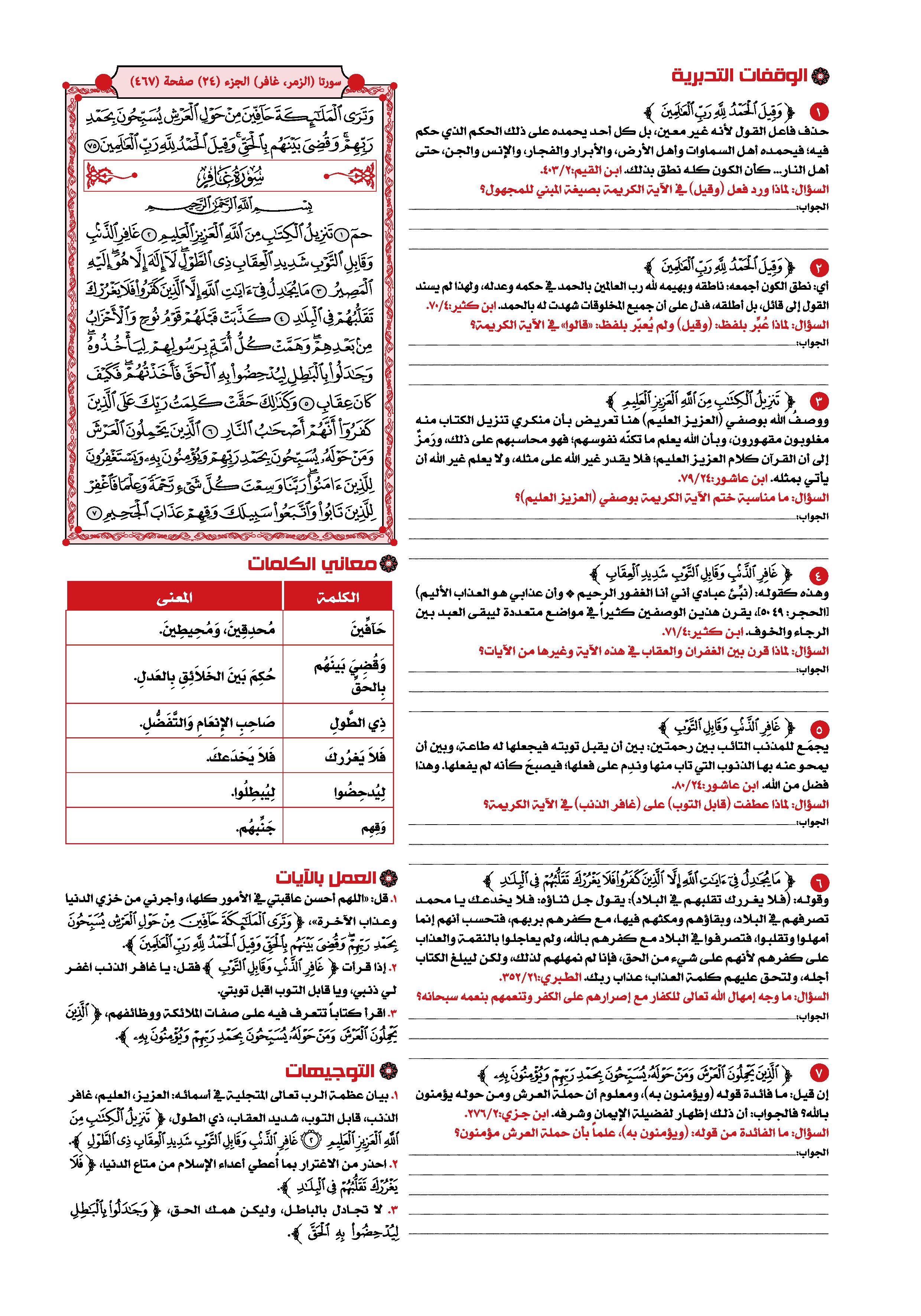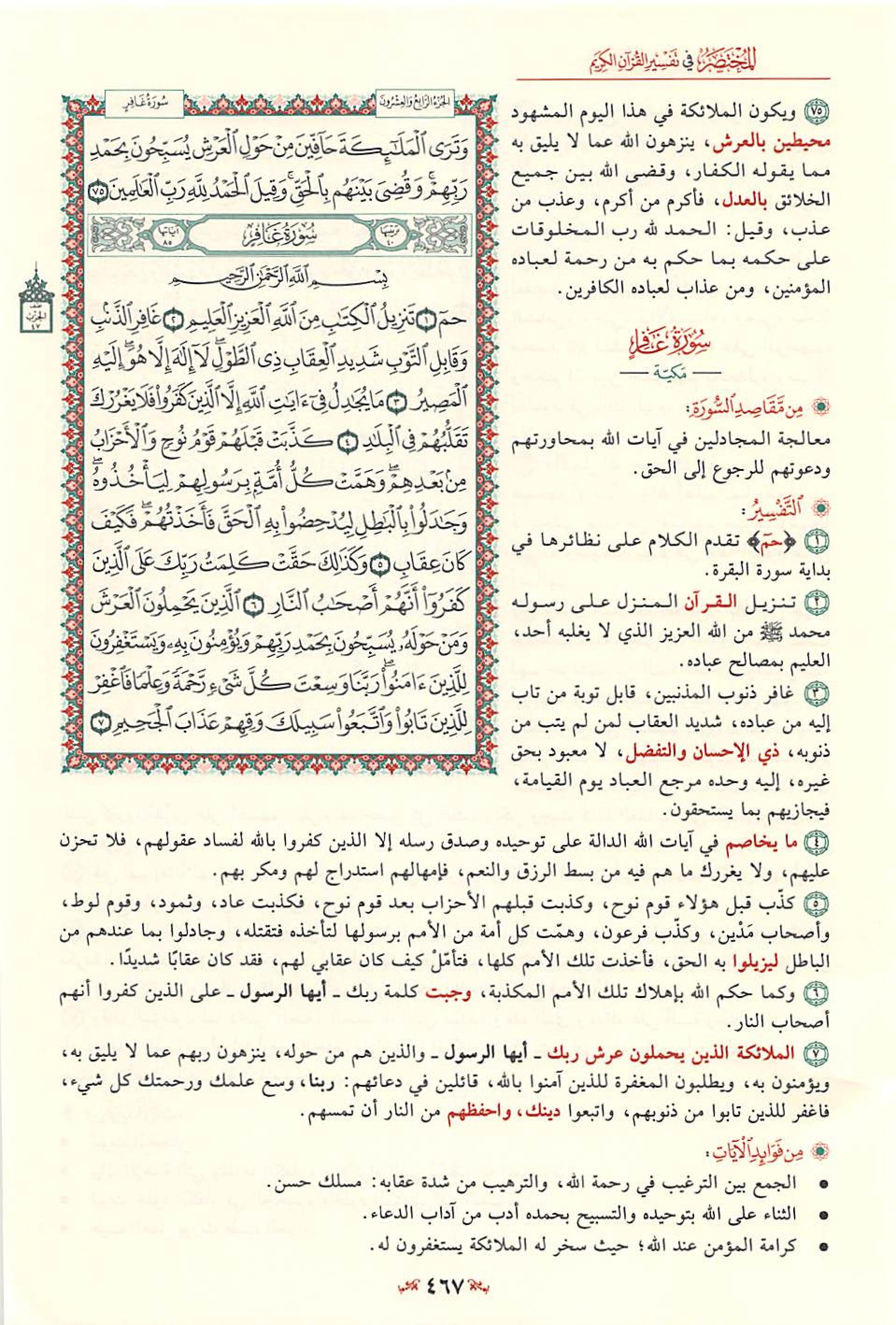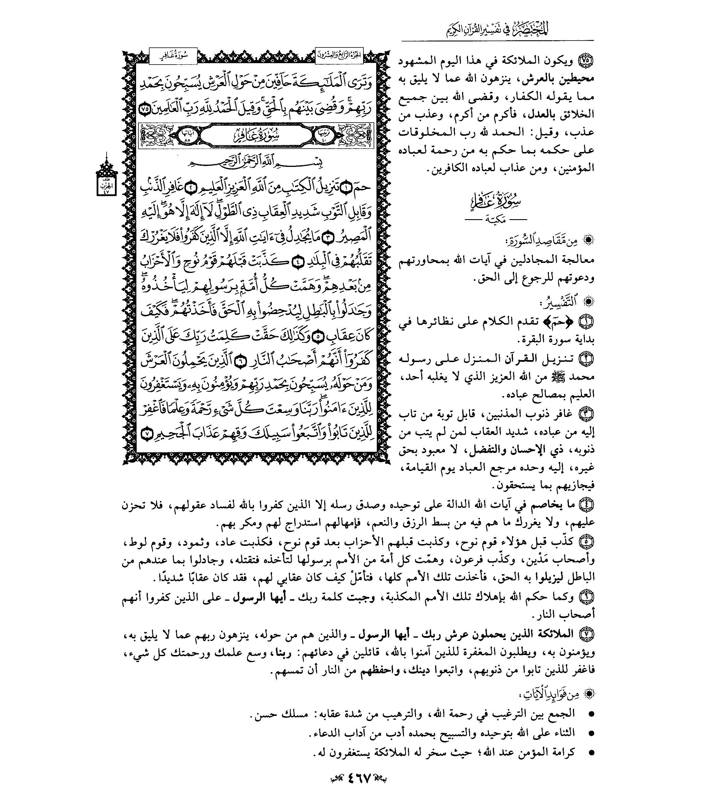 السعدى : تقدم تفسير الحروف المقطعة الوسيط لطنطاوي : مقدمة وتمهيد 1- سورة «غافر» هي السورة الأربعون في ترتيب المصحف أما ترتيبها في النزول فهي السورة التاسعة والخمسون من السور المكية، وكان نزولها بعد سورة «الزمر» . ويبدو- والله أعلم- أن الحواميم، كان نزولها على حسب ترتيبها في المصحف، فقد ذكر صاحب الإتقان عند حديثه عن المكي والمدني من القرآن، وعن ترتيب السور على حسب النزول.. ذكر سورة الزمر، ثم غافر، ثم فصلت، ثم الشورى، ثم الزخرف، ثم الدخان، ثم الجاثية، ثم الأحقاف «1» . 2- والمحققون من العلماء على أن سورة «غافر» من السور المكية الخالصة، وقد حكى أبو حيان الإجماع على ذلك، كما أن الإمام ابن كثير قال عنها بأنها مكية دون أن يستثنى منها شيئا. وقيل: كلها مكية إلا قوله- تعالى-: إِنَّ الَّذِينَ يُجادِلُونَ فِي آياتِ اللَّهِ بِغَيْرِ سُلْطانٍ أَتاهُمْ، إِنْ فِي صُدُورِهِمْ إِلَّا كِبْرٌ ما هُمْ بِبالِغِيهِ ... الآية. ولكن هذا القيل وغيره لم تنهض له حجة يعتمد عليها، فالرأى الصحيح أنها جميعها مكية. 3- وهذه السورة تسمى- أيضا- بسورة «المؤمن» لاشتمالها على قصة مؤمن آل فرعون. كما تسمى بسورة «الطول» لقوله- تعالى- في أوائلها: غافِرِ الذَّنْبِ، وَقابِلِ التَّوْبِ، شَدِيدِ الْعِقابِ، ذِي الطَّوْلِ.... وعدد آياتها خمس وثمانون آية في المصحف الكوفي والشامي، وأربع وثمانون في الحجازي، واثنتان وثمانون في البصري.. 4- وسورة «غافر» هي أول السور السبعة التي تبدأ بقوله- تعالى- حم والتي يطلق عليها لفظ «الحواميم» . وقد ذكر الإمام ابن كثير جملة من الآثار في فضل هذه السور، منها: ما روى عن ابن مسعود أنه قال: «آل حم» ديباج القرآن.. ومنها ما روى عن ابن عباس أنه قال: «إن لكل شيء لبابا، ولباب القرآن آل حم» أو قال «الحواميم» «1» . 5- وقد افتتحت السورة الكريمة بالثناء على الله- تعالى-، وبتسلية الرسول صلّى الله عليه وسلم عما لقيه من أذى المشركين ومن جدالهم، وببيان وظيفة الملائكة الذين يحملون عرشه- تعالى-، وأن منها الاستغفار للمؤمنين، والدعاء لهم بقولهم- كما حكى القرآن عنهم-: ... رَبَّنا وَسِعْتَ كُلَّ شَيْءٍ رَحْمَةً وَعِلْماً، فَاغْفِرْ لِلَّذِينَ تابُوا وَاتَّبَعُوا سَبِيلَكَ، وَقِهِمْ عَذابَ الْجَحِيمِ. رَبَّنا وَأَدْخِلْهُمْ جَنَّاتِ عَدْنٍ الَّتِي وَعَدْتَهُمْ، وَمَنْ صَلَحَ مِنْ آبائِهِمْ وَأَزْواجِهِمْ وَذُرِّيَّاتِهِمْ، إِنَّكَ أَنْتَ الْعَزِيزُ الْحَكِيمُ. وَقِهِمُ السَّيِّئاتِ، وَمَنْ تَقِ السَّيِّئاتِ يَوْمَئِذٍ فَقَدْ رَحِمْتَهُ، وَذلِكَ هُوَ الْفَوْزُ الْعَظِيمُ. 6- ثم دعا- سبحانه- عباده إلى إخلاص الطاعة له، وذكرهم بأهوال يوم القيامة، وأن الملك في هذا اليوم إنما هو لله- تعالى- وحده. قال- تعالى-: فَادْعُوا اللَّهَ مُخْلِصِينَ لَهُ الدِّينَ وَلَوْ كَرِهَ الْكافِرُونَ، رَفِيعُ الدَّرَجاتِ ذُو الْعَرْشِ يُلْقِي الرُّوحَ مِنْ أَمْرِهِ عَلى مَنْ يَشاءُ مِنْ عِبادِهِ لِيُنْذِرَ يَوْمَ التَّلاقِ. يَوْمَ هُمْ بارِزُونَ لا يَخْفى عَلَى اللَّهِ مِنْهُمْ شَيْءٌ، لِمَنِ الْمُلْكُ الْيَوْمَ لِلَّهِ الْواحِدِ الْقَهَّارِ. 7- وبعد أن وبخ- سبحانه- الغافلين على عدم اعتبارهم بسوء عاقبة من سبقهم من الكافرين، أتبع ذلك بجانب من قصة موسى- عليه السلام- مع فرعون وهامان وقارون، وحكى ما دار بين موسى- عليه السلام- وبين هؤلاء الطغاة من محاورات. كما حكى ما وجهه الرجل المؤمن من آل فرعون إلى قومه من نصائح حكيمة، منها قوله- كما حكى القرآن عنه-: وَقالَ الَّذِي آمَنَ يا قَوْمِ إِنِّي أَخافُ عَلَيْكُمْ مِثْلَ يَوْمِ الْأَحْزابِ. مِثْلَ دَأْبِ قَوْمِ نُوحٍ وَعادٍ وَثَمُودَ وَالَّذِينَ مِنْ بَعْدِهِمْ، وَمَا اللَّهُ يُرِيدُ ظُلْماً لِلْعِبادِ. وَيا قَوْمِ إِنِّي أَخافُ عَلَيْكُمْ يَوْمَ التَّنادِ. يَوْمَ تُوَلُّونَ مُدْبِرِينَ ما لَكُمْ مِنَ اللَّهِ مِنْ عاصِمٍ، وَمَنْ يُضْلِلِ اللَّهُ فَما لَهُ مِنْ هادٍ. 8- وبعد أن سا