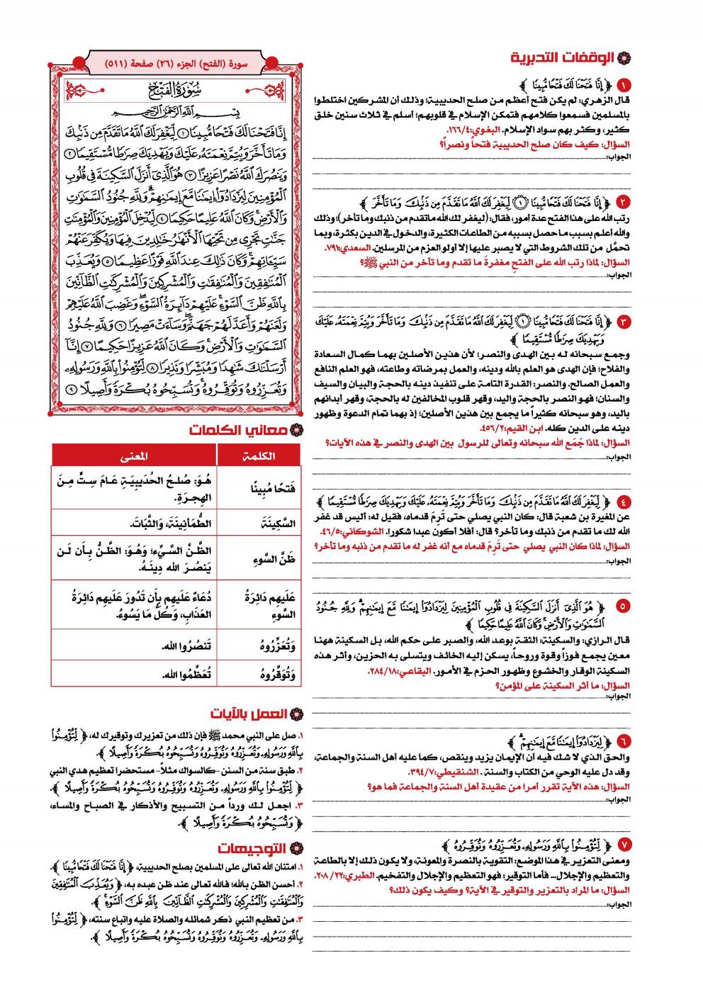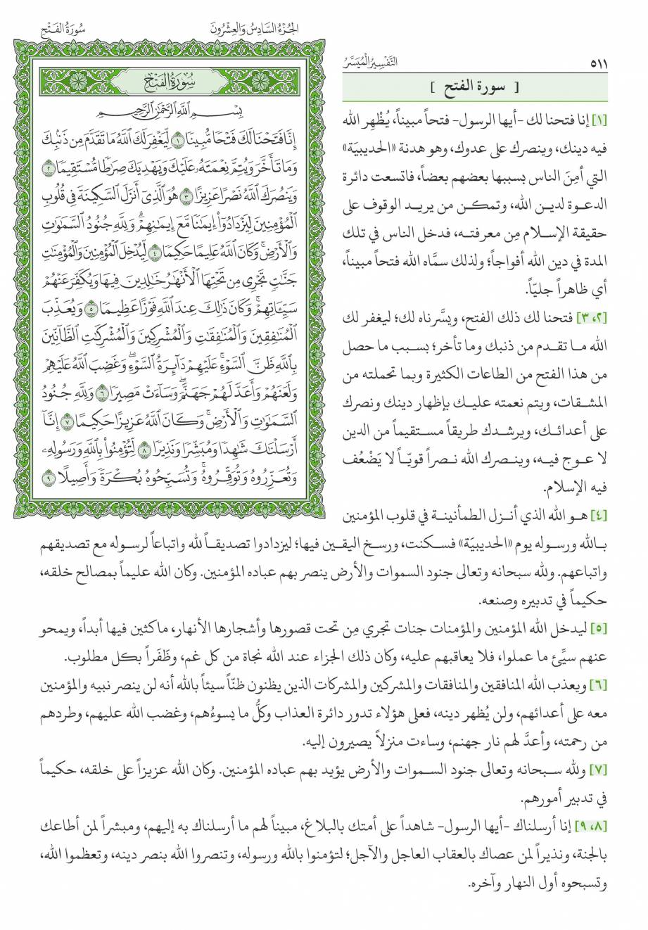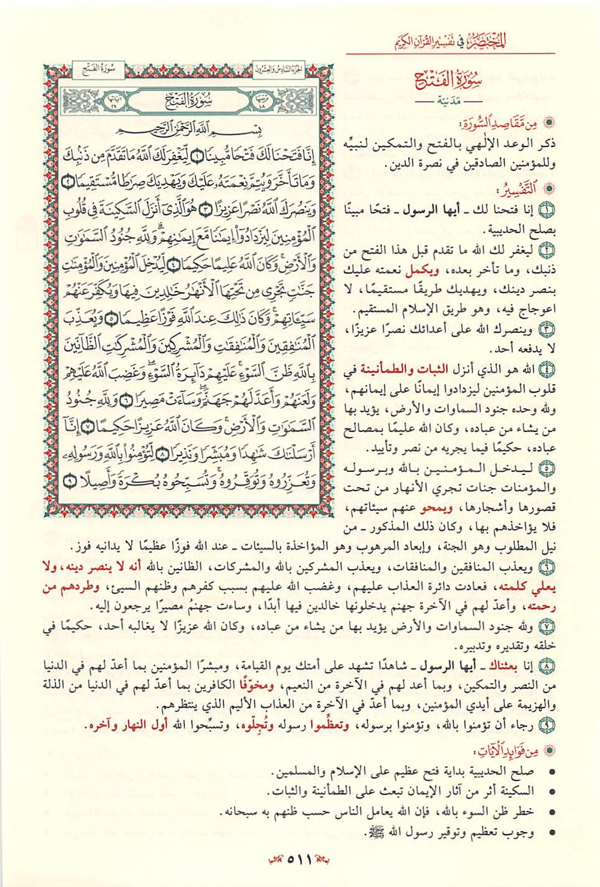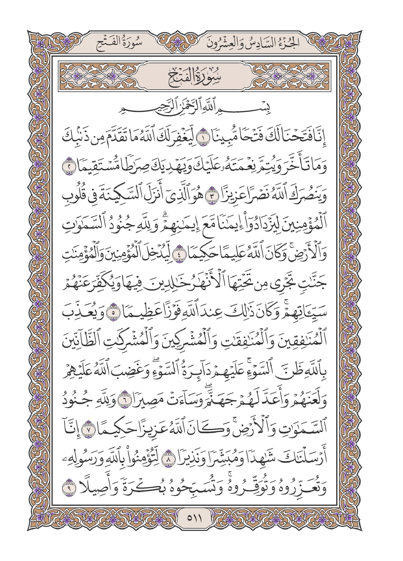 بسم الله الرحمن الرحيم ( إنا فتحنا لك فتحا مبينا ( 1 ) ليغفر لك الله ما تقدم من ذنبك وما تأخر ويتم نعمته عليك ويهديك صراطا مستقيما ( 2 ) وينصرك الله نصرا عزيزا ( 3 ) ) .