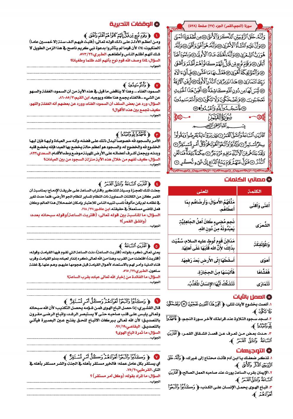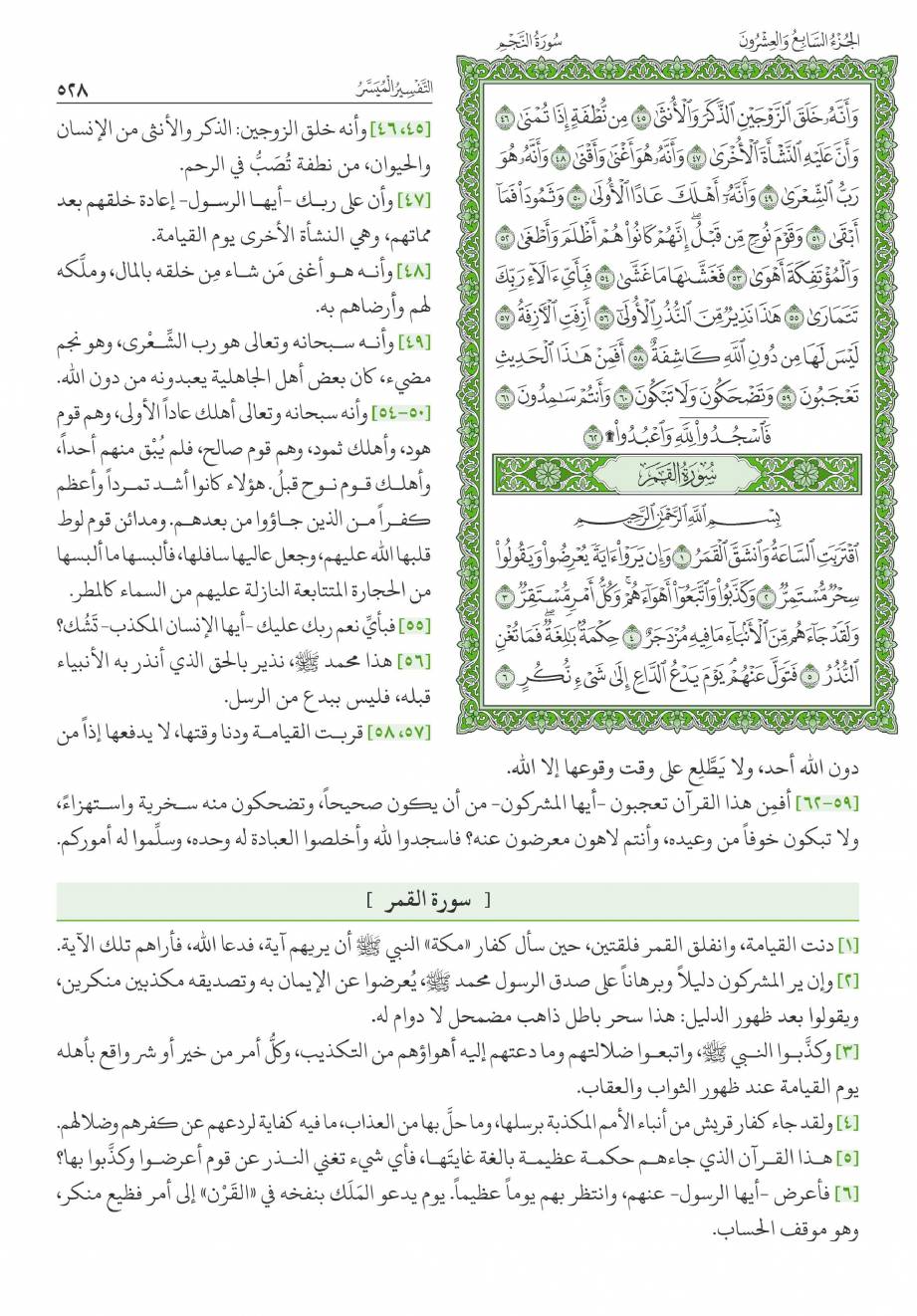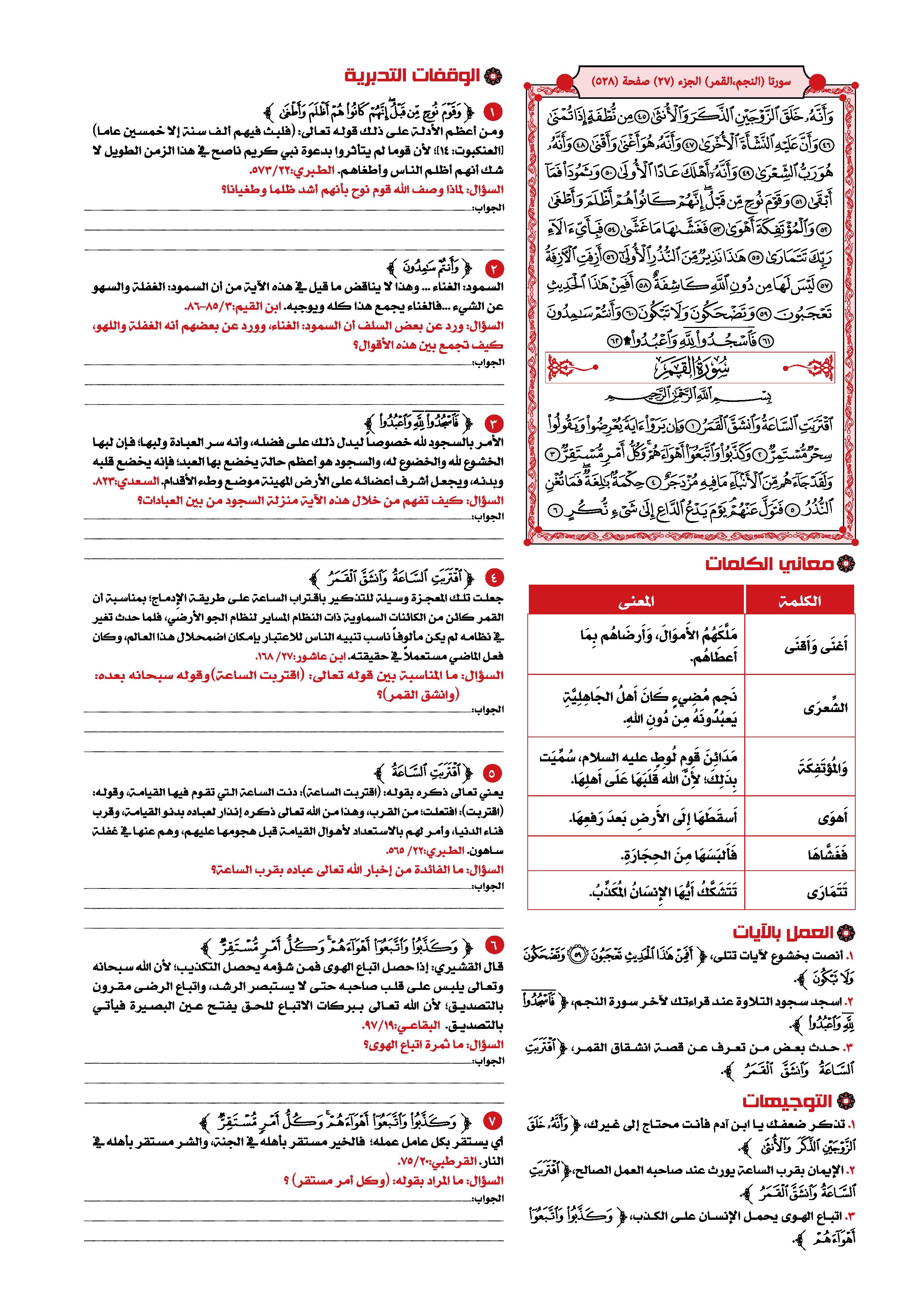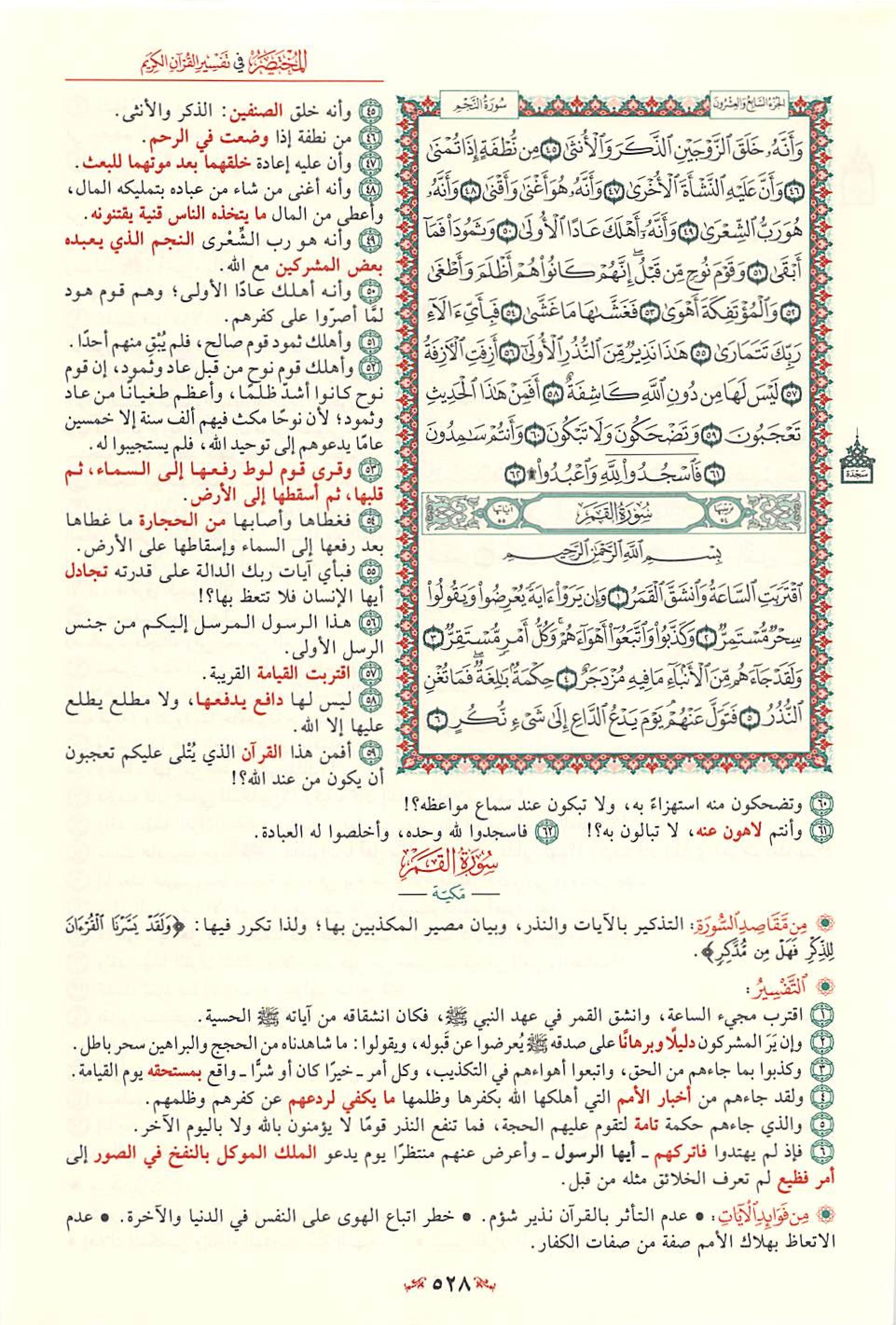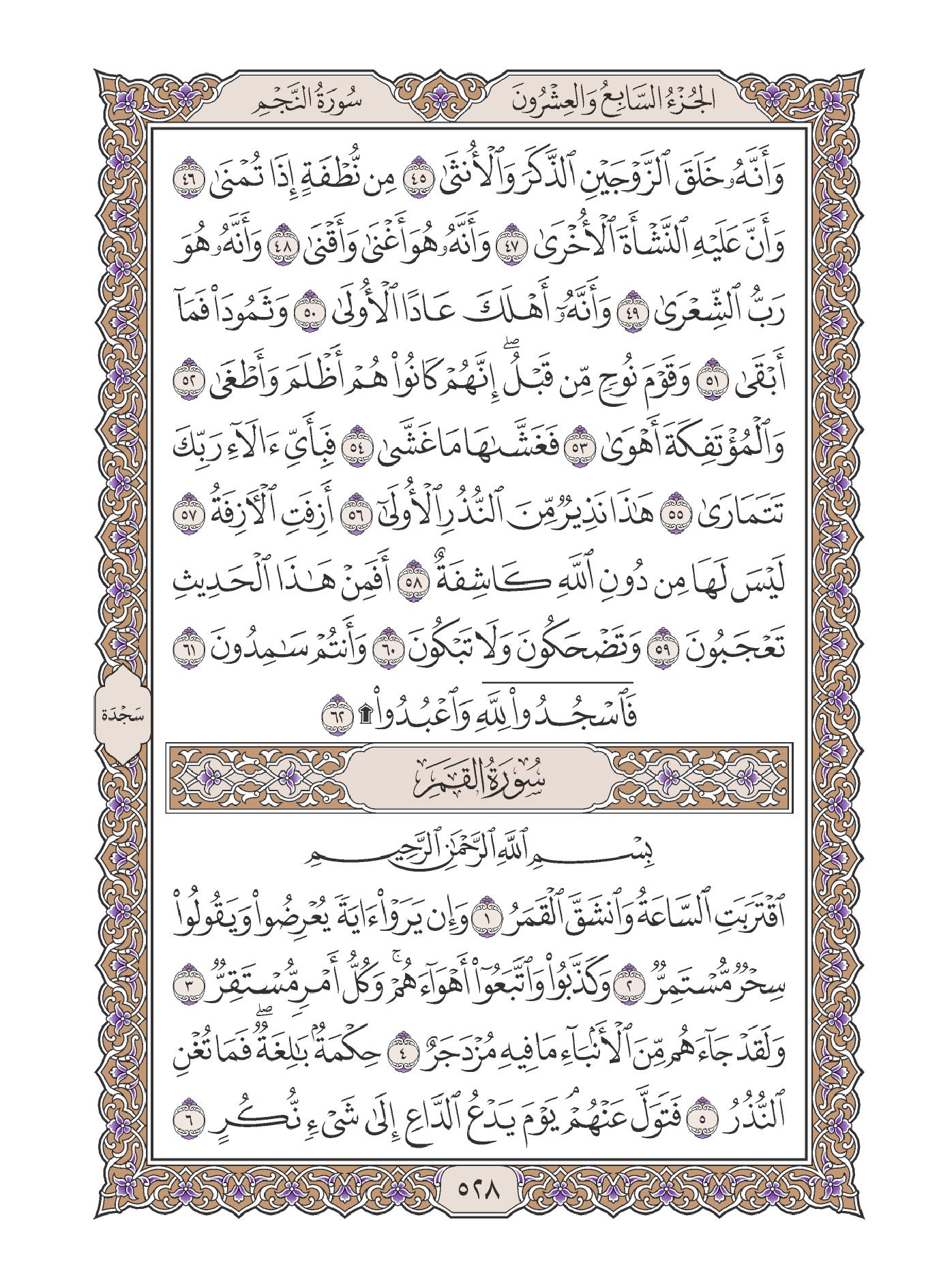 1- سورة القمر: هي السورة الرابعة والخمسون في ترتيب المصحف، أما ترتيبها في النزول فكان بعد سورة الطارق، وقبل سورة «ص» .