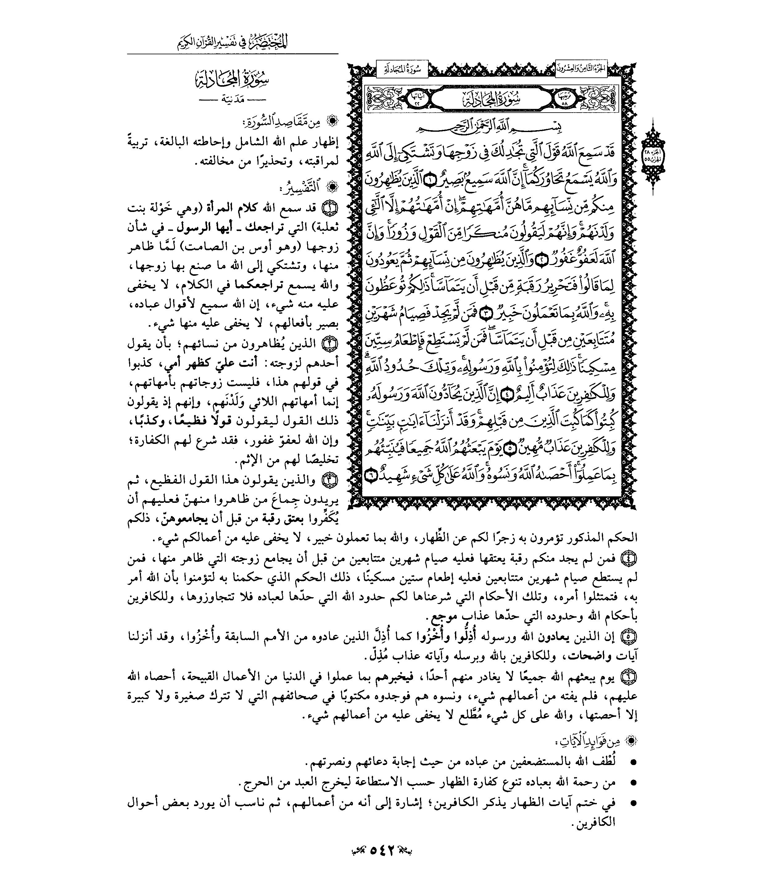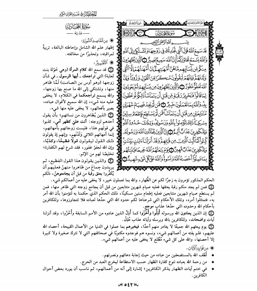3- وقد افتتحت سورة «المجادلة» بالحديث عن المرأة التي جادلت النبي صلى الله عليه وسلم في شأن زوجها، وقد أصدر- سبحانه- حكمه العادل في مسألتها، مبينا حكم الظهار فقال- تعالى-: وَالَّذِينَ يُظاهِرُونَ مِنْ نِسائِهِمْ ثُمَّ يَعُودُونَ لِما قالُوا فَتَحْرِيرُ رَقَبَةٍ مِنْ قَبْلِ أَنْ يَتَمَاسَّا، ذلِكُمْ تُوعَظُونَ بِهِ، وَاللَّهُ بِما تَعْمَلُونَ خَبِيرٌ. فَمَنْ لَمْ يَجِدْ فَصِيامُ شَهْرَيْنِ مُتَتابِعَيْنِ مِنْ قَبْلِ أَنْ يَتَمَاسَّا، فَمَنْ لَمْ يَسْتَطِعْ فَإِطْعامُ سِتِّينَ مِسْكِيناً، ذلِكَ لِتُؤْمِنُوا بِاللَّهِ وَرَسُولِهِ، وَتِلْكَ حُدُودُ اللَّهِ، وَلِلْكافِرِينَ عَذابٌ أَلِيمٌ.
