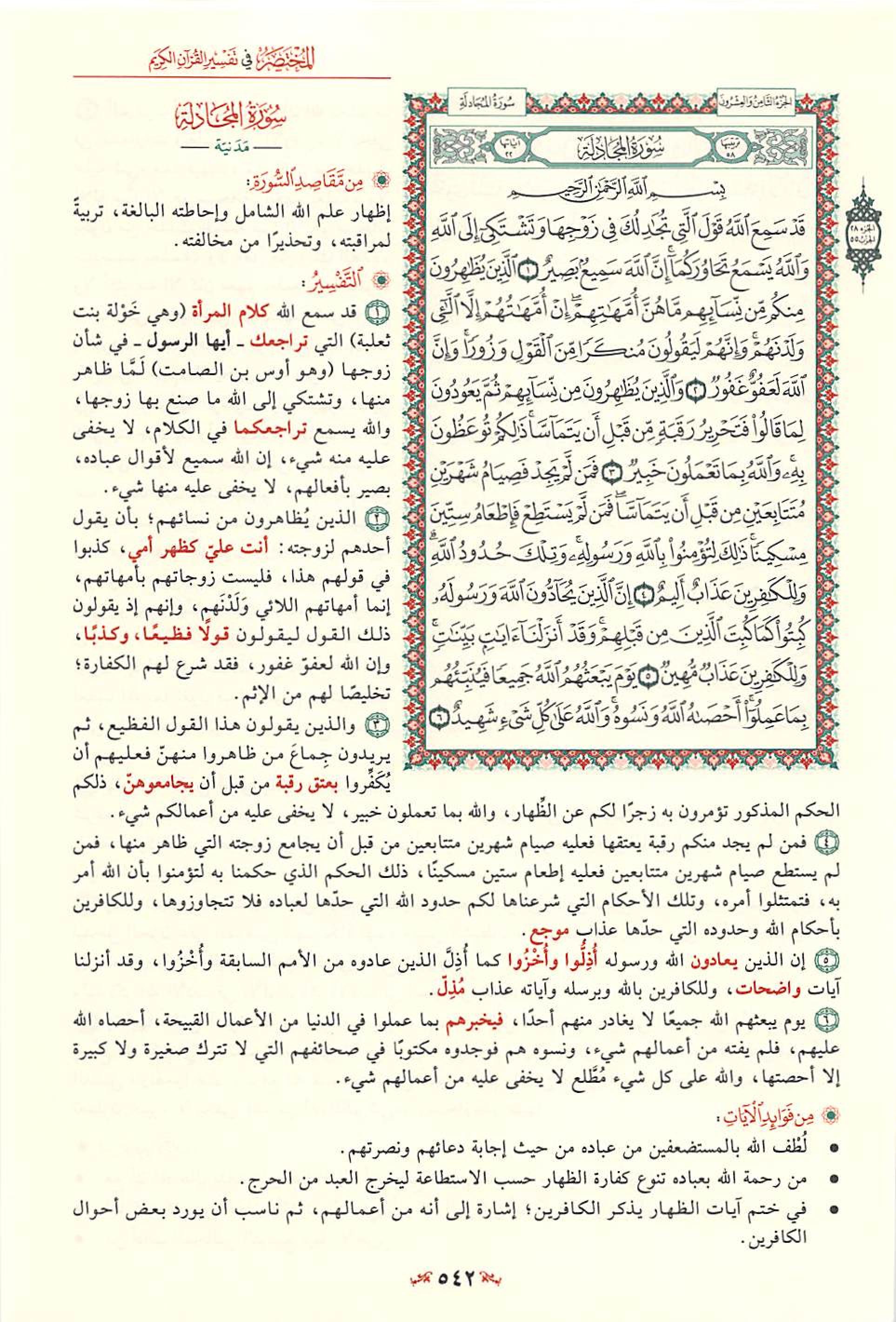 كوردى - برهان محمد أمين : ئهی محمد صلی الله علیه وسلم بێگومان خوا بیستی و وهریگرت وتووێژی ئهو ئافرهتهی که گفتوگۆت لهگهلدا دهکات دهربارهی هاوسهرهکهی سکاڵای خۆیشی بۆلای خوا دهبات خوایش گوێی له گفتوگۆکهتان بوو بهڕاستی خوا بیسهرو بینایه چوار ئایهتی سهرهتای ئهم سوورهته دهربارهی خهولهی کچی ثهعلهبهو مێردهکهی هاتۆته خوارهوه ڕۆژێک مێردهکهی لێی تووڕه دهبێت و پێی دهڵێت تۆ لهجێگهی دایکمی خهوله دێت بۆ خزمهتی پێغهمبهر صلی الله علیه وسلم باسهکهی بۆ دهگێڕێتهوه دوای تاوێک حالهتی وهحی بهسهر پێغهمبهردا دێت و چوار ئایهتی سهرهتای ئهم سوورهته دادهبهزێت