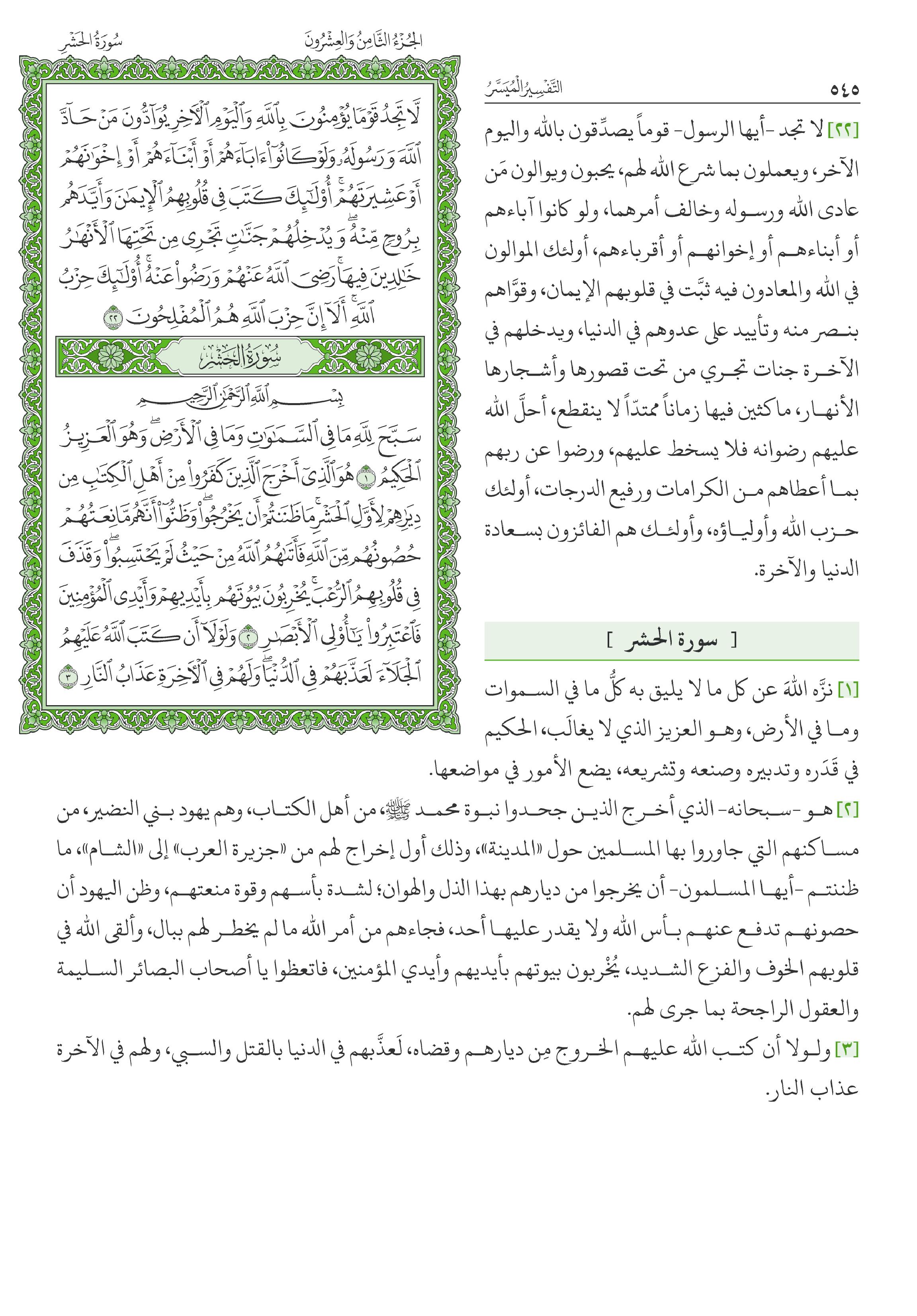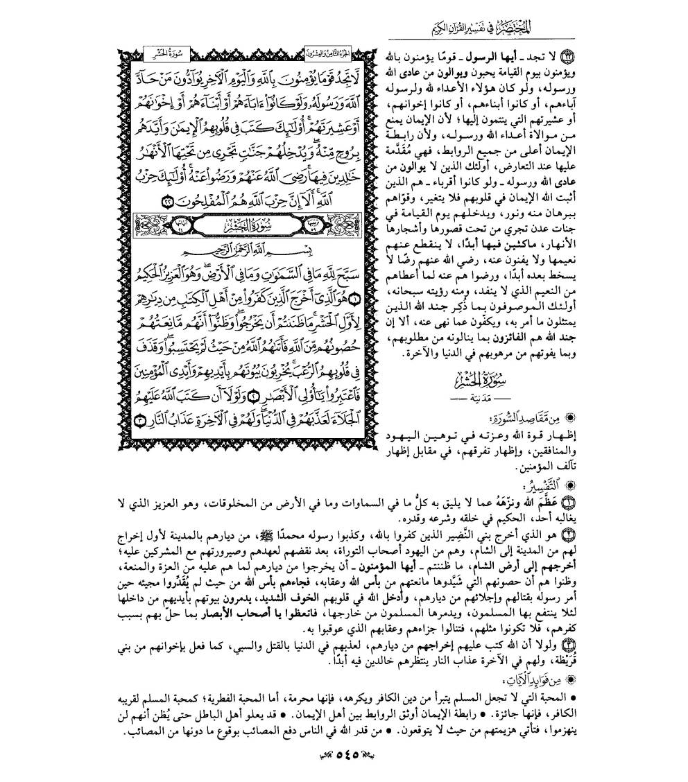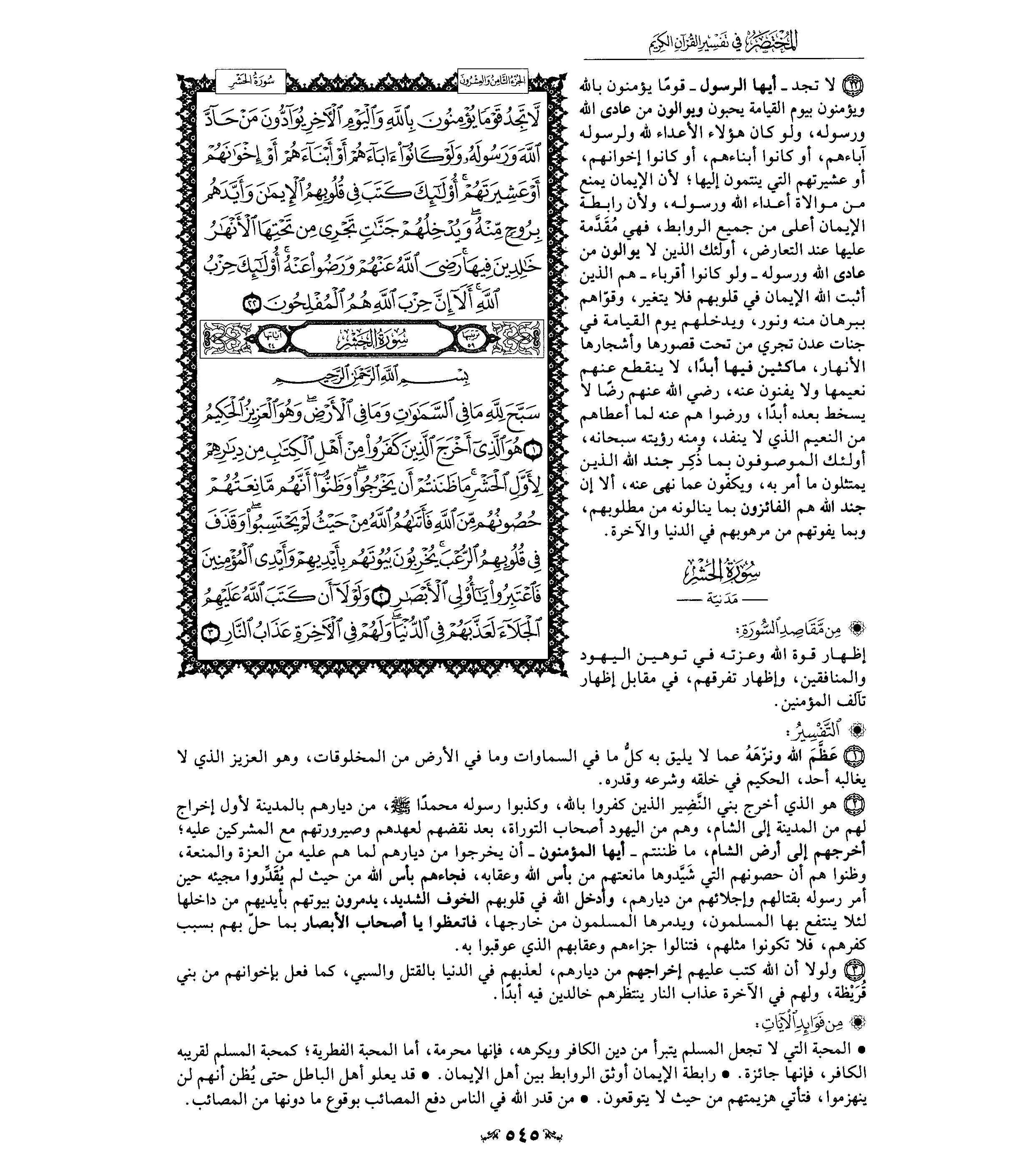 Все обитатели небес и земли славят Аллаха, восхваляют Его безупречные качества, поклоняются Ему и смиряются пред Его могуществом. Среди Его прекрасных имен - Могущественный, Мудрый. Все сущее подчинено Его власти, и для Него нет ничего трудного и невозможного. Его творения и повеления преисполнены мудрости, поскольку Он ничего не творит ради забавы, ниспосылает только полезные предписания и вершит только то, чего требует Его божественная мудрость. Эта сура также получила название «Бану Надыр». Так называлось крупное иудейское племя, жившее недалеко от Медины задолго до того, как Пророк Мухаммад, да благословит его Аллах и приветствует, начал свою пророческую миссию. Когда же он переселился в Медину, то это племя, как и многие другие иудейские племена, отказалось уверовать в Единого Аллаха и Его посланника, да благословит его Аллах и приветствует. Тогда он заключил мирный договор с иудеями, которые были соседями мусульман в Медине. Спустя шесть месяцев после битвы при Бадре Пророк приехал в поселения племени Надыр и попросил их помочь мусульманам заплатить выкуп за Амра б. Умейу ад-Дамри, который убил нескольких людей из племени аль-Киляб. Иудеи сказали: «Мы поможем вам, Абу аль-Касым. Посиди здесь, пока мы не решим твой вопрос». Когда же они уединились для совместного принятия решения, сатана подтолкнул их на тяжкое преступление, дабы обрушить на них предписанное им несчастье. Они сговорились убить Пророка и сказали: «Кто возьмет этот камень и сбросит ее так, чтобы разбить ему голову?» Несчастный грешник по имени Амр б. Джуххаш вызвался на это дело. Тогда Салам б. Мишкам сказал: «Не делайте этого. Клянусь Аллахом, его оповестят о вашем заговоре, и тогда мы первыми разорвем заключенный с ним договор». Господь тотчас ниспослал Пророку, да благословит его Аллах и приветствует, откровение о планах иудеев. Посланник Аллаха, да благословит его Аллах и приветствует, встал и спешно отправился в Медину. Сподвижники догнали его и сказали: «Ты встал так, что мы даже не заметили этого». Он поведал им о заговоре иудеев, а затем отправил к ним послание со следующим повелением: «Покиньте Медину и никогда более не поселяйтесь в ней. Я даю вам десять дней, и если обнаружу вас здесь по истечении этого срока, то отрублю вам головы». В течение нескольких дней иудеи готовились к переселению. Но затем один из лицемеров по имени Абдуллах б. Убей б. Салул отправил им письмо, в котором написал: «Не покидайте своих домов. У меня есть две тысячи человек, которые готовы укрыться в вашей крепости и умереть за вас. Племя Курейза и ваши союзники из племени Гатфан также готовы помочь вам». Старейшина племени Надыр Хуай б. Ахтаб понадеялся на обещанную ему поддержку и написал посланнику Аллаха, да благословит его Аллах и приветствует, следующее послание: «Мы не оставим своих домов, посему делай все, что тебе вздумается». Услышав об этом, посланник Аллаха возвеличил Аллаха, а его сподвижники тотчас приготовились к сражению. Знамя мусульман понес Али б. Абу Талиб. Иудеи обосновались в своих крепостях, отбиваясь камнями и стрелами. Курейзиты, сторонники Абдуллаха б. Убейа и союзники из Гатфана предательски отвернулись от них. Посланник Аллаха, да благословит его Аллах и приветствует, окружил поселения иудеев и приказал своим сподвижникам начать вырубать и сжигать их паль