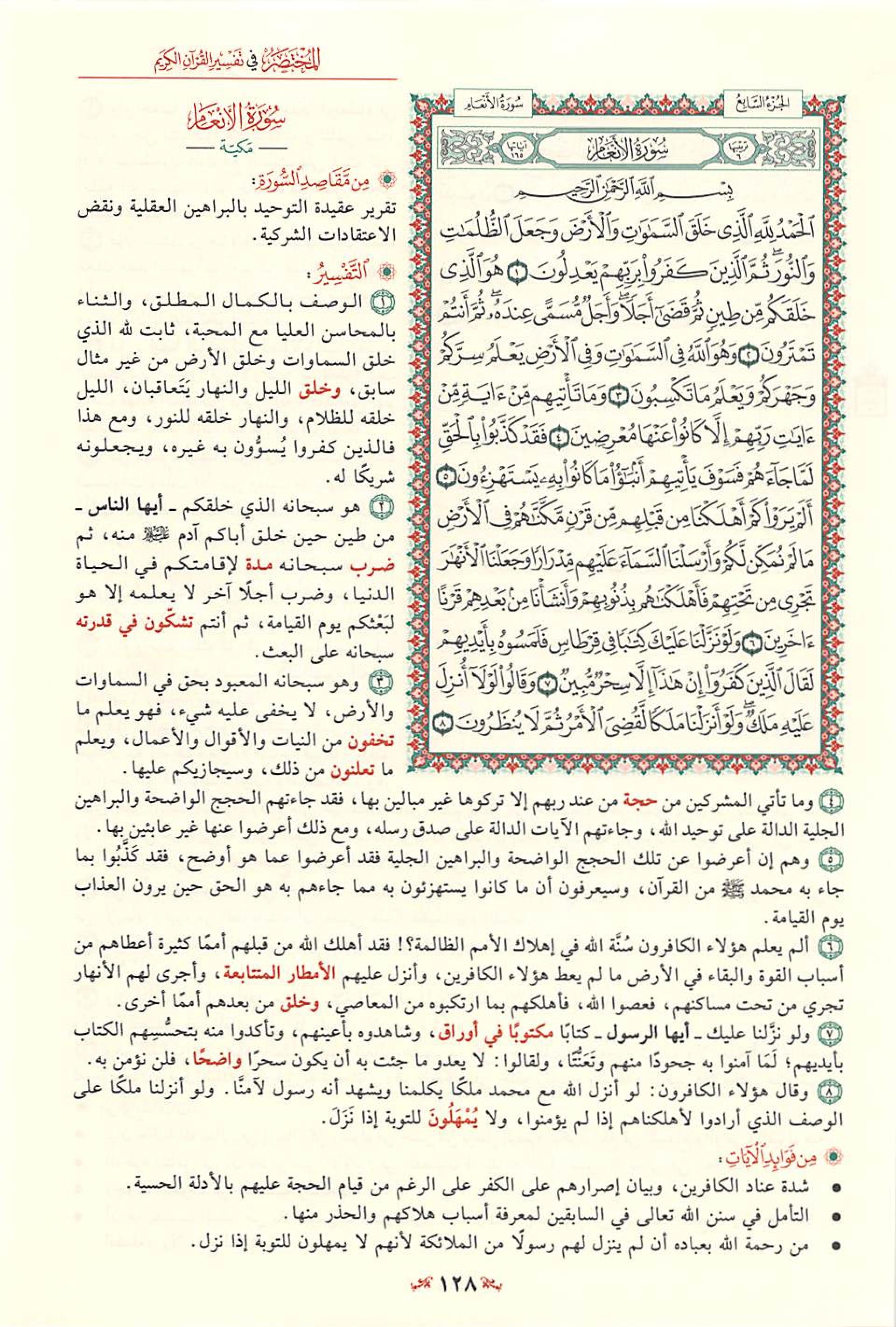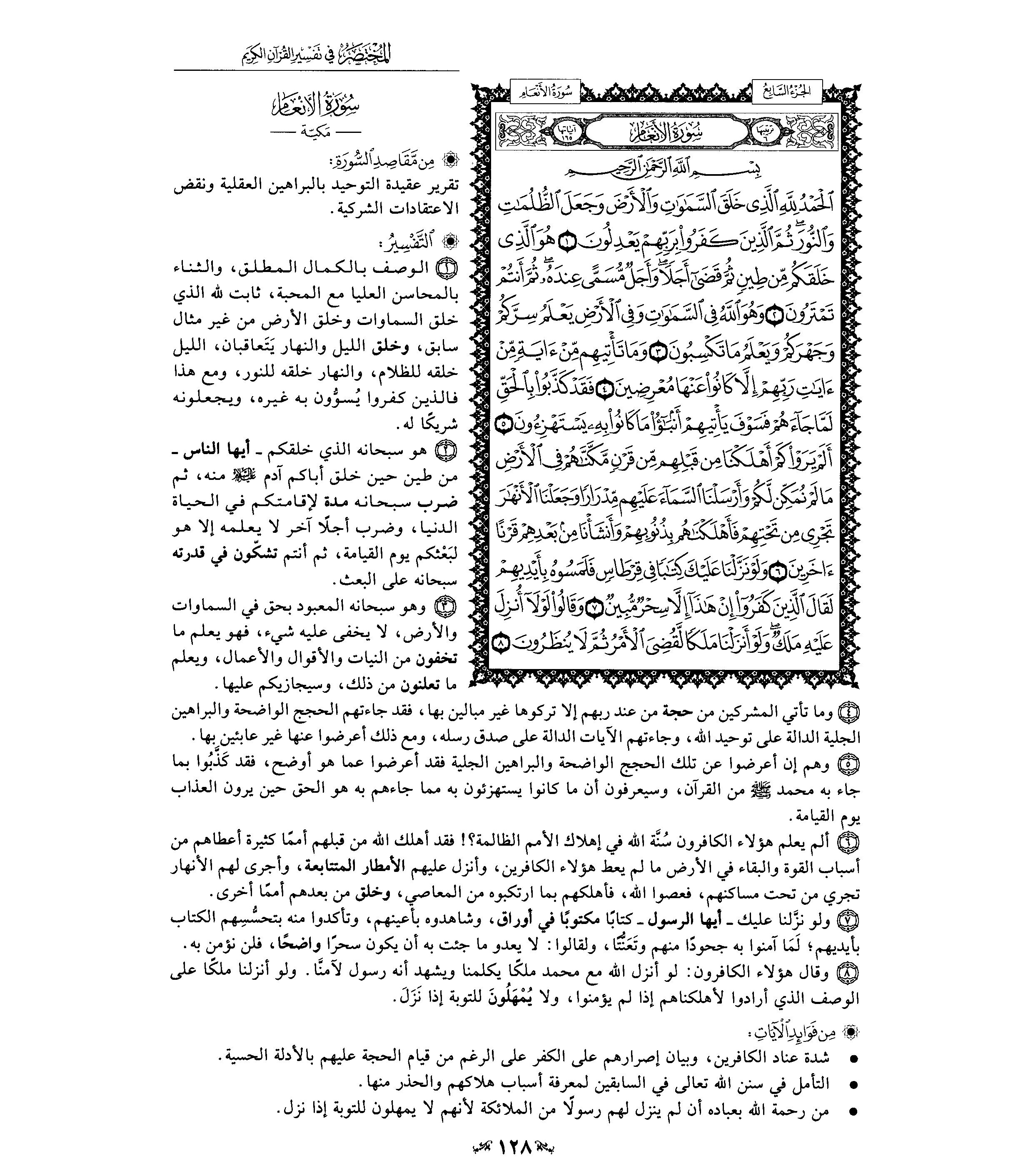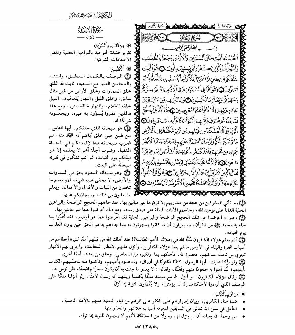 (د) الذي يقرأ سورة الأنعام بتدبر يجد فيها سمات القرآن المكي واضحة جلية، فهي تتحدث باستفاضة عن وحدانية الله، وعن مظاهر قدرته، وعن صدق النبي صلى الله عليه وسلم في دعوته، وعن الأدلة الدامغة التي تؤيد صحة البعث والثواب والعقاب يوم القيامة، إلى غير ذلك من المقاصد التي كثر الحديث عنها في القرآن المكي.