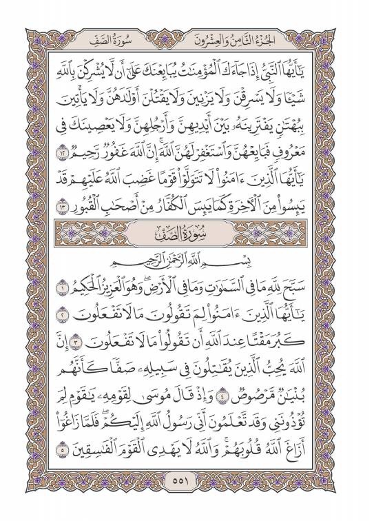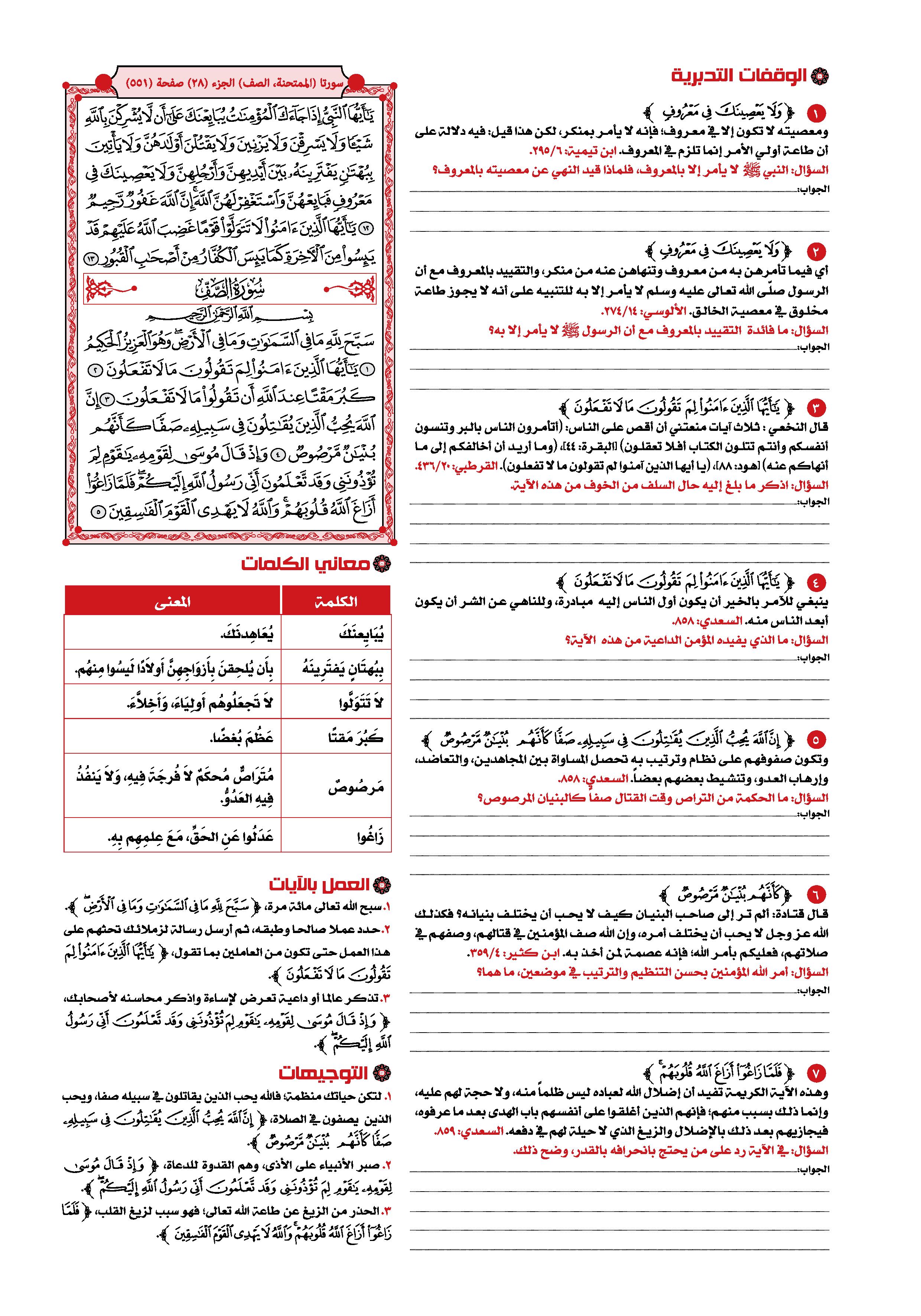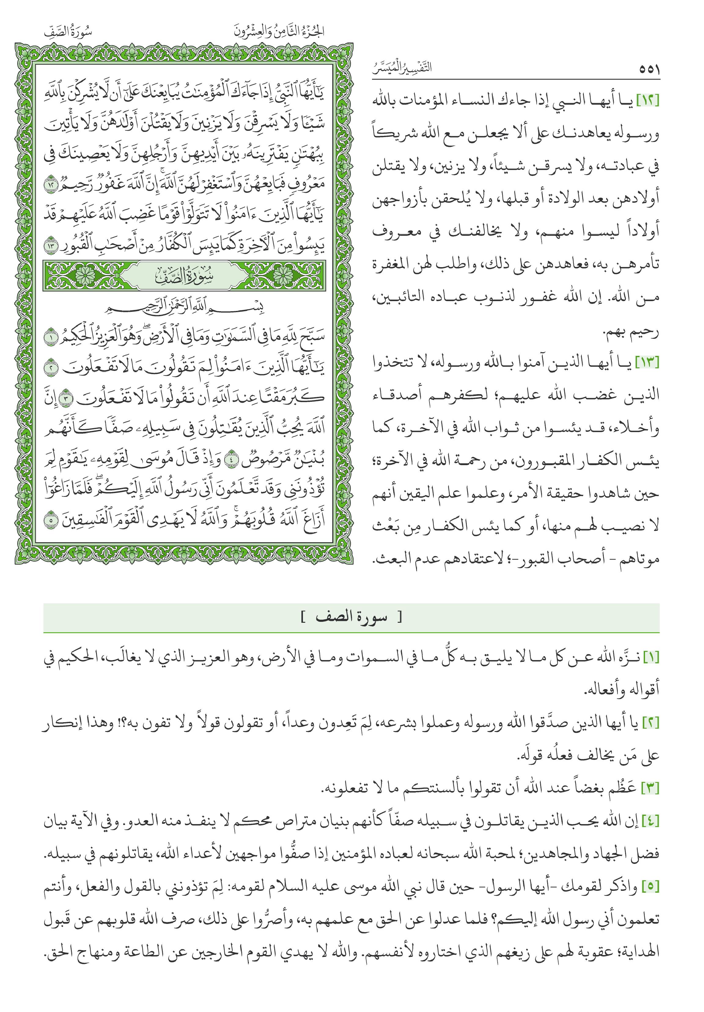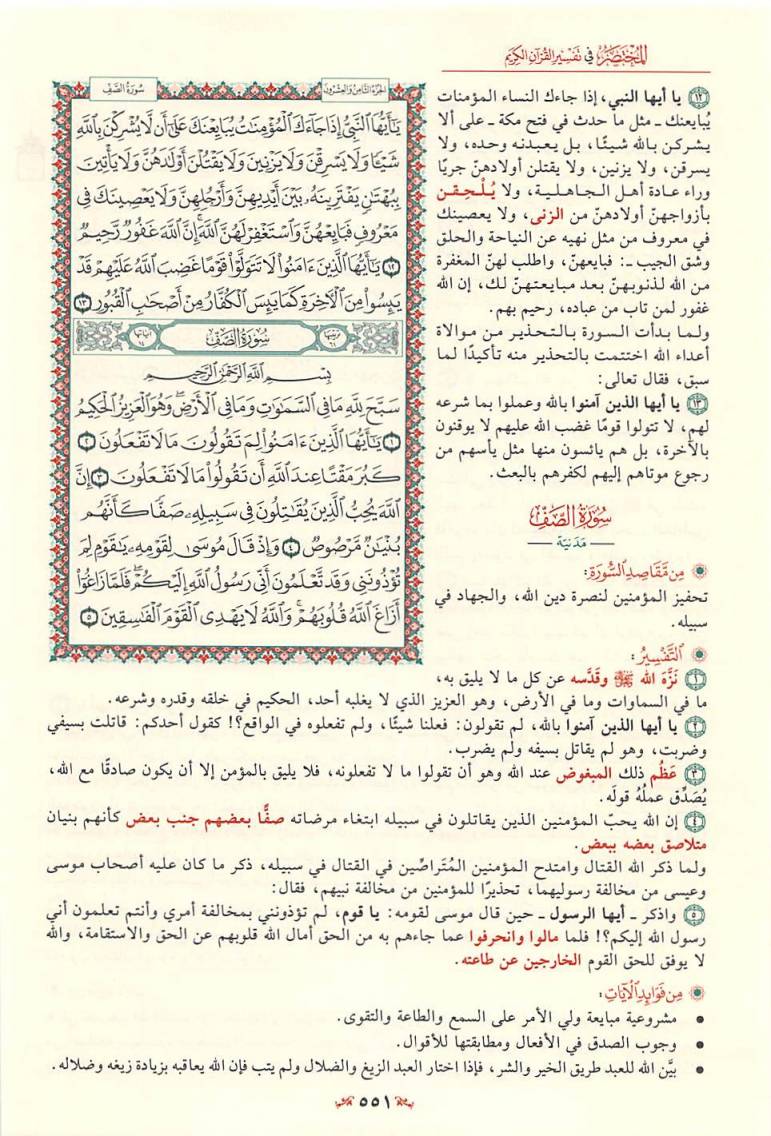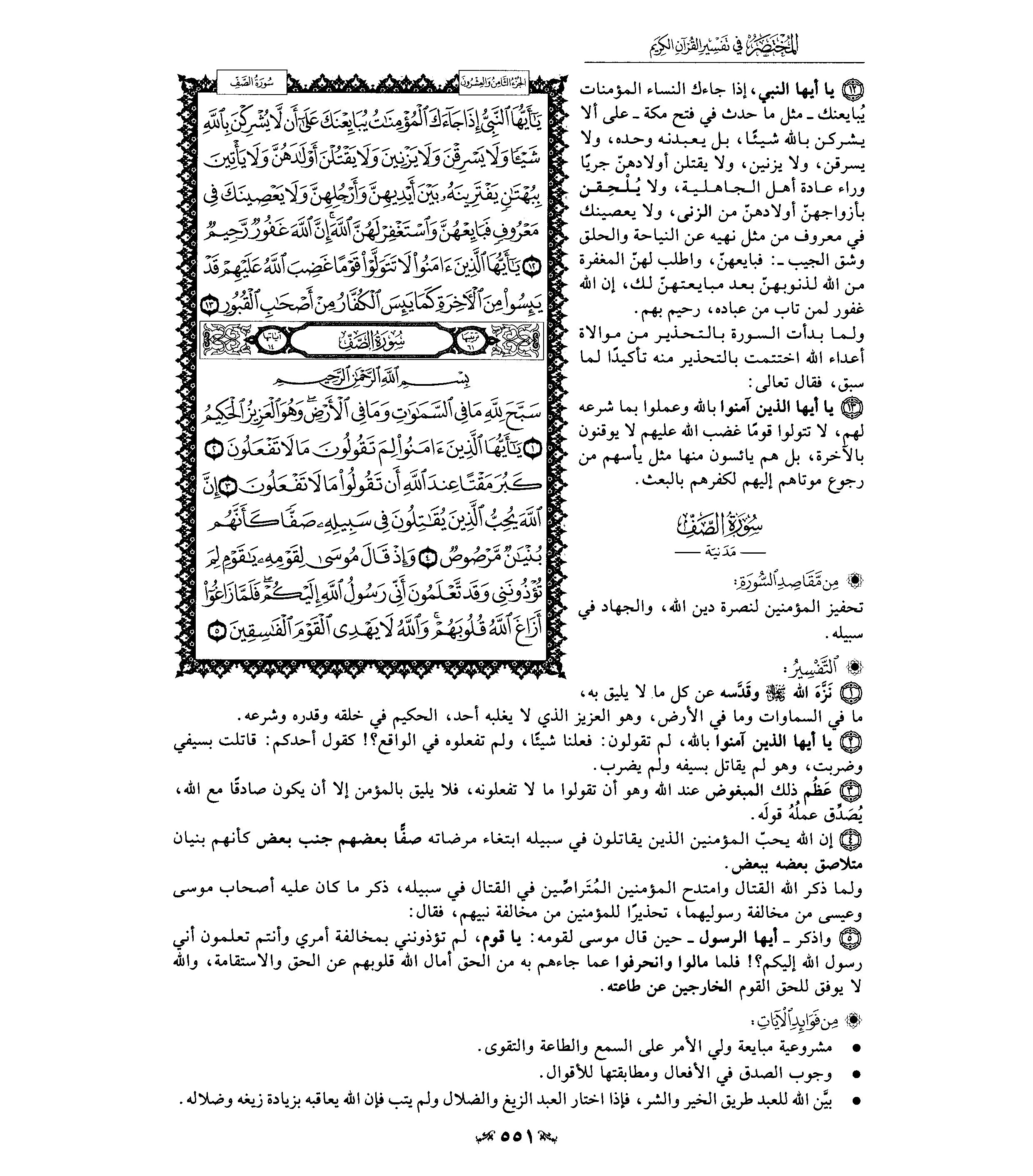 2- وقد افتتحت بتسبيح الله- تعالى- عن كل ما لا يليق به، ثم وجهت نداء إلى المؤمنين نهتهم فيه أن يقولوا قولا لم تطابقه أفعالهم، فقال- تعالى- يا أَيُّهَا الَّذِينَ آمَنُوا لِمَ تَقُولُونَ ما لا تَفْعَلُونَ. كَبُرَ مَقْتاً عِنْدَ اللَّهِ أَنْ تَقُولُوا ما لا تَفْعَلُونَ.