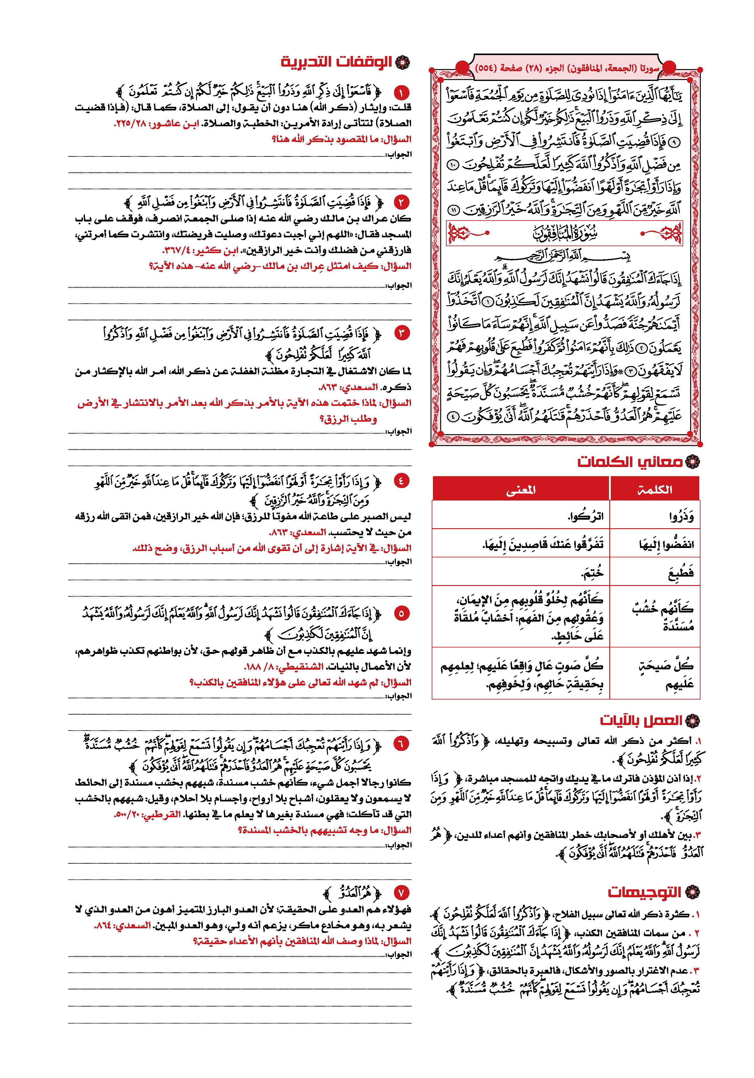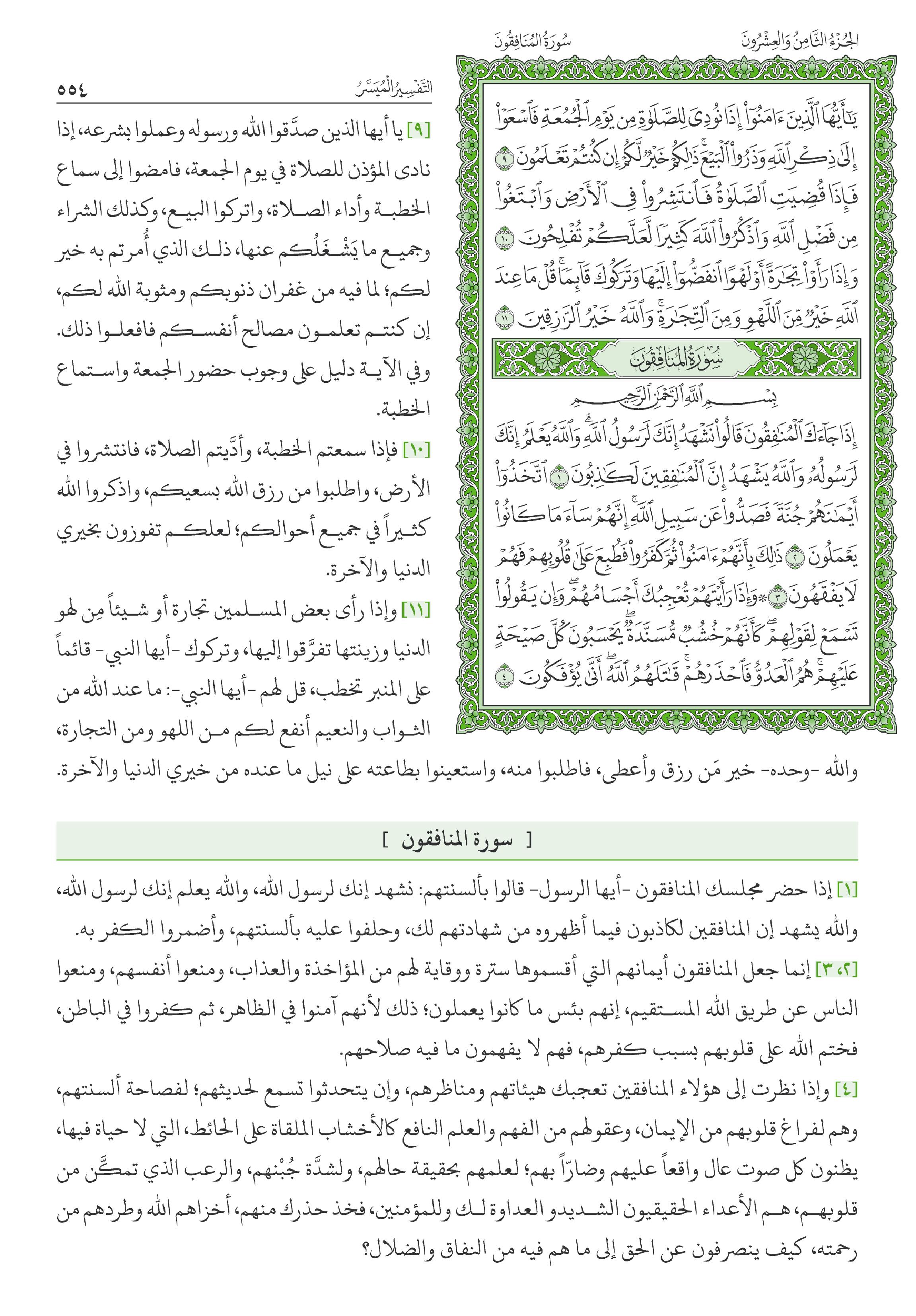 وقال الآلوسى: أخرج سعيد بن منصور، والطبراني في الأوسط- بسند حسن- عن أبى هريرة، قال: كان رسول الله صلى الله عليه وسلم يقرأ في صلاة الجمعة في الركعة الأولى بسورة الجمعة، فيحرض بها المؤمنين ويقرأ في الركعة الثانية بسورة المنافقين، فيقرع بها المنافقين.