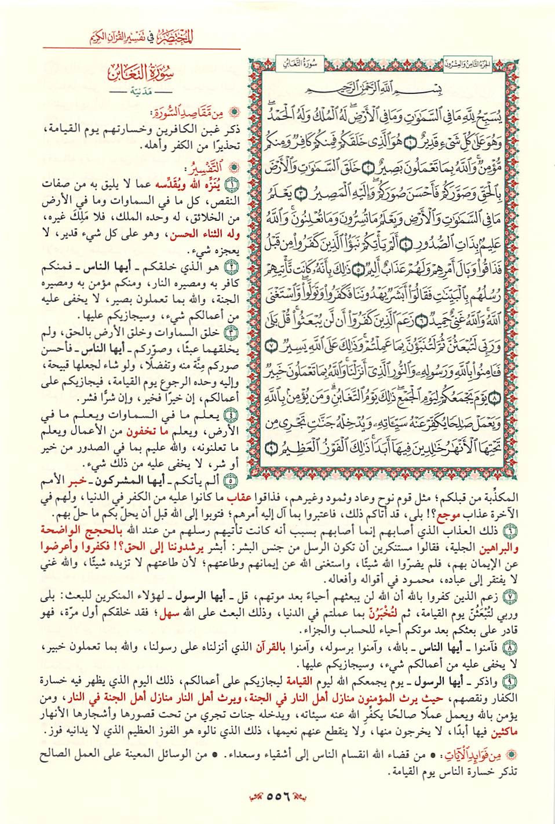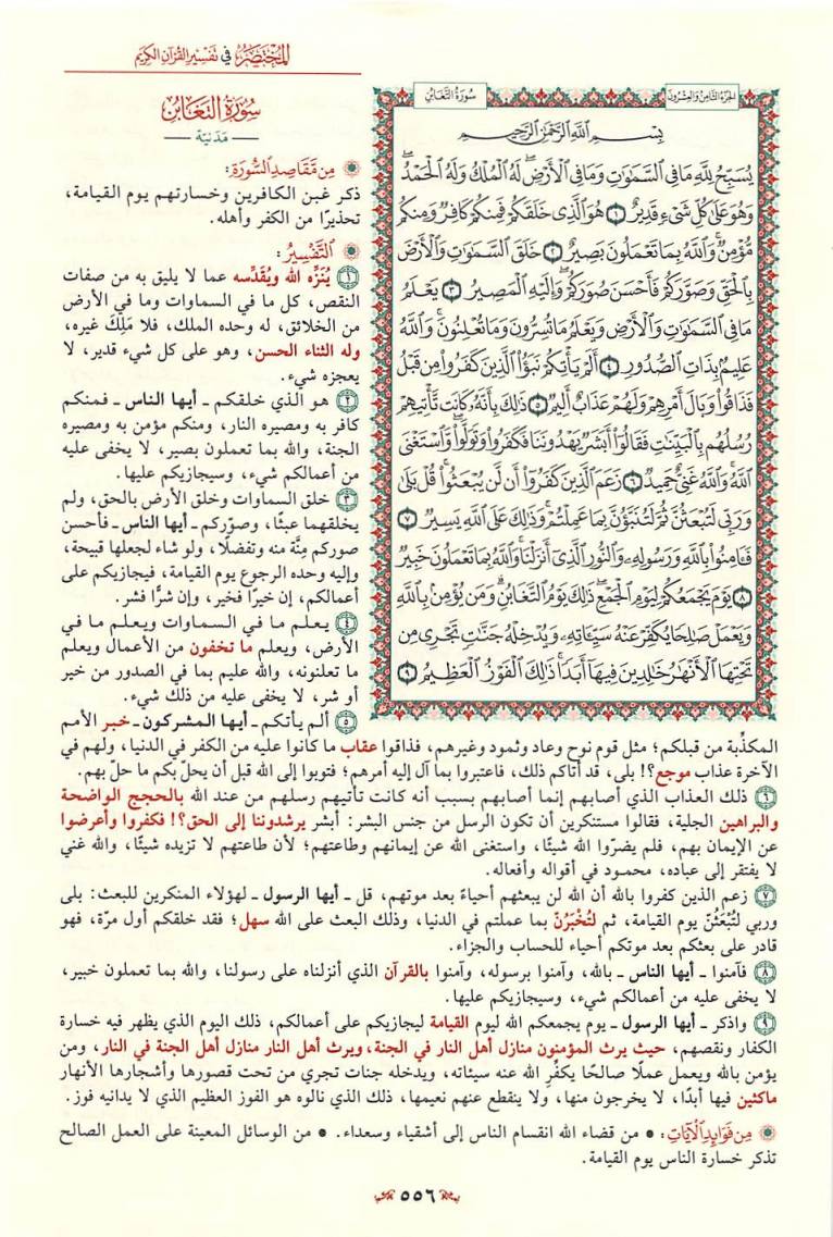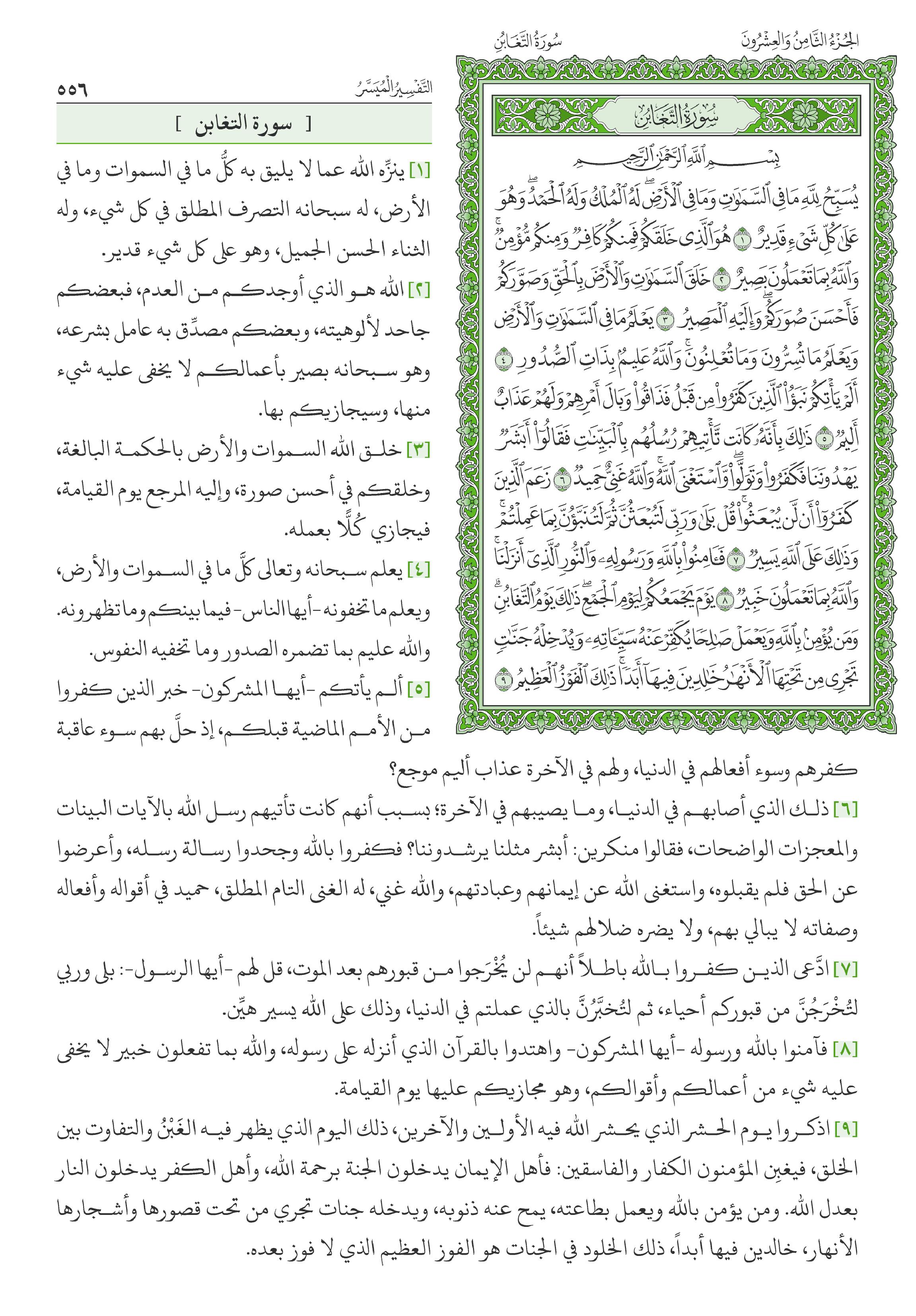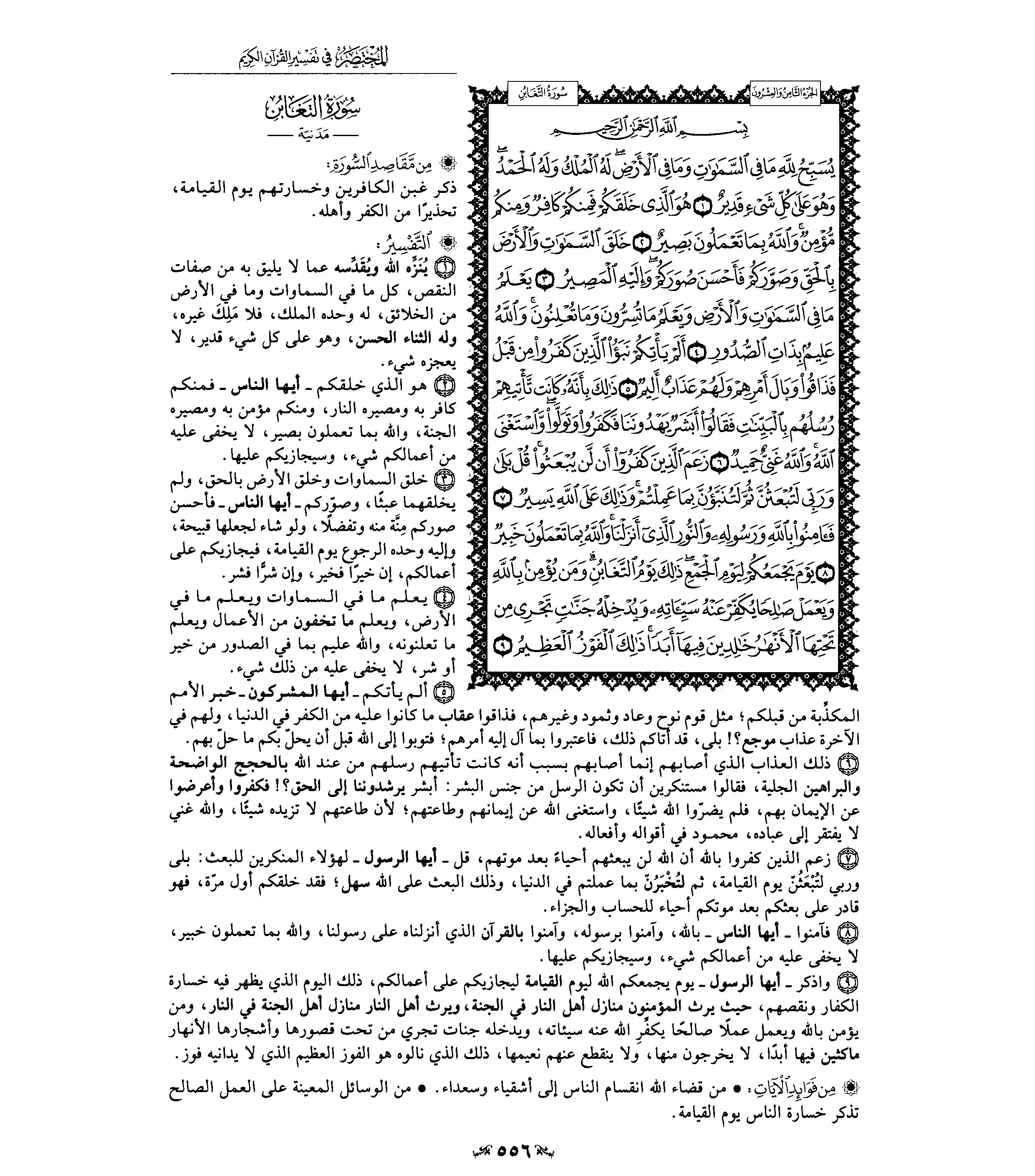السعدى : هذه الآيات [الكريمات]، مشتملات على جملة كثيرة واسعة، من أوصاف الباري العظيمة، فذكر كمال ألوهيته تعالى، وسعة غناه، وافتقار جميع الخلائق إليه، وتسبيح من في السماوات والأرض بحمد ربها، وأن الملك كله لله، فلا يخرج مخلوق عن ملكه، والحمد كله له، حمد على ما له من صفات الكمال، وحمد على ما أوجده من الأشياء، وحمد على ما شرعه من الأحكام، وأسداه من النعم. وقدرته شاملة، لا يخرج عنها موجود، فلا يعجزه شيء يريده. الوسيط لطنطاوي : مقدمة وتمهيد 1- سورة التغابن هي السورة الرابعة والستون في ترتيب المصحف، أما نزولها على النبي صلى الله عليه وسلم فكان- كما ذكره صاحب الإتقان بعد سورة «الجمعة» وقبل سورة «الصف» . وعدد آياتها ثماني عشرة آية. 2- وجمهور المفسرين على أنها من السور المدنية. قال الشوكانى: وهي مدنية في قول الأكثر، وقال الضحاك: هي مكية، وقال الكلبي: هي مكية ومدنية. أخرج ابن الضريس عن ابن عباس أنه قال: نزلت سورة التغابن بالمدينة. وفي رواية أخرى عنه: أنها نزلت بمكة إلا آيات من آخرها نزلن بالمدينة في عوف بن مالك الأشجعى، شكا إلى رسول الله صلى الله عليه وسلم جفاء أهله وولده، فأنزل الله- تعالى- يا أَيُّهَا الَّذِينَ آمَنُوا إِنَّ مِنْ أَزْواجِكُمْ وَأَوْلادِكُمْ عَدُوًّا لَكُمْ فَاحْذَرُوهُمْ.. إلى آخر السورة «1» . ويبدو لنا أن بعض آيات هذه السورة يغلب عليها طابع القرآن المكي، كالآيات التي تتحدث عن مظاهر قدرة الله- تعالى- وعن إنكار المشركين للبعث والرد عليهم. لذا نرجح- والله أعلم- أن النصف الأول منها من القرآن المكي، والنصف الأخير من القرآن المدني. 3- والسورة الكريمة بعد ذلك من أهم مقاصدها: تنزيه الله- تعالى- عن الشريك أو الولد، وبيان ألوان من مظاهر قدرته ومننه على خلقه، والرد على المشركين الذين زعموا أنهم لن يبعثوا، والمقارنة بين حسن عاقبة الأخيار وسوء عاقبة الأشرار، وبيان أن كل شيء يقع في ذا الكون هو بقضاء الله وقدره. وتحريض المؤمنين على تقوى الله- تعالى- وعلى إيثار ما عنده على كل شيء من شهوات هذه الدنيا. وصلى الله على سيدنا محمد وعلى آله وصحبه وسلم. سورة " التغابن " هى آخر السور المفتتحة بالتسبيح ، فقد قال - سبحانه - فى مطلعها . ( يُسَبِّحُ لِلَّهِ مَا فِي السماوات وَمَا فِي الأرض . . . ) أى : ينزه الله - تعالى - عن كل نقص ، ويجله عن كل مالا يليق به ، جميع الكائنات التى فى سماواته - سبحانه - وفى أرضه ، كما قال - عز وجل - : ( تُسَبِّحُ لَهُ السماوات السبع والأرض وَمَن فِيهِنَّ وَإِن مِّن شَيْءٍ إِلاَّ يُسَبِّحُ بِحَمْدِهِ ولكن لاَّ تَفْقَهُونَ تَسْبِيحَهُمْ إِنَّهُ كَانَ حَلِيماً غَفُوراً ) وجىء هنا وفى سورة الجمعة بصيغة المضارع ( يُسَبِّحُ ) للدلالة على تجدد هذا التسبيح ، وحدوثه فى كل وقت وآن . وجىء فى سورة الحديد ، والصف ، بصيغة الماضى ( سَبَّحَ ) . للدلالة على أن التسبيح قد استقر وثبت لله - تعالى - وحده ، من قديم الزمان . وقوله - سبحانه - : ( لَهُ الملك وَلَهُ الحمد وَهُوَ على كُلِّ شَيْءٍ قَدِيرٌ ) مؤكد لما قبله ، من بيان أن جميع الكائنات تسبح لله - تعالى - لأنه مالكها وصاحب الفضل المطلق عليها . وتقديم الجار والمجرور ( لَهُ ) لإفادة الاختصاص والقصر . أى : له - سبحانه - وحده ملك هذا الكون ، وله وحده الحمد التام المطلق من جميع مخلوقاته ، وليس لغيره شىء منهما ، وإذا وجد شىء منهما لغيره فهو من فيضه وعطائه ، إذ هو - سبحانه - القدير الذى لا يقف فى وجه قدرته وإرادته شىء . البغوى : مدنية قال عطاء هي مكية إلا ثلاث آيات من قوله: "يا أيها الذين آمنوا إن من أزواجكم وأولادكم" إلى آخرهن. "يسبح لله ما في السموات وما في الأرض له الملك وله الحمد وهو على كل شيء قدير". ابن كثير : تفسير سورة التغابن وهي مدنية ، وقيل : مكية . قال الطبراني : حدثنا محمد بن هارون بن محمد بن بكار الدمشقي ، حدثنا العباس بن الوليد الخلال ، حدثنا الوليد بن الوليد ، حدثنا ابن ثوبان ، عن عطاء بن أبي رباح ، عن عبد الله بن عمرو رضي الله عنه ، قال : قال رسول الله - صلى الله عل