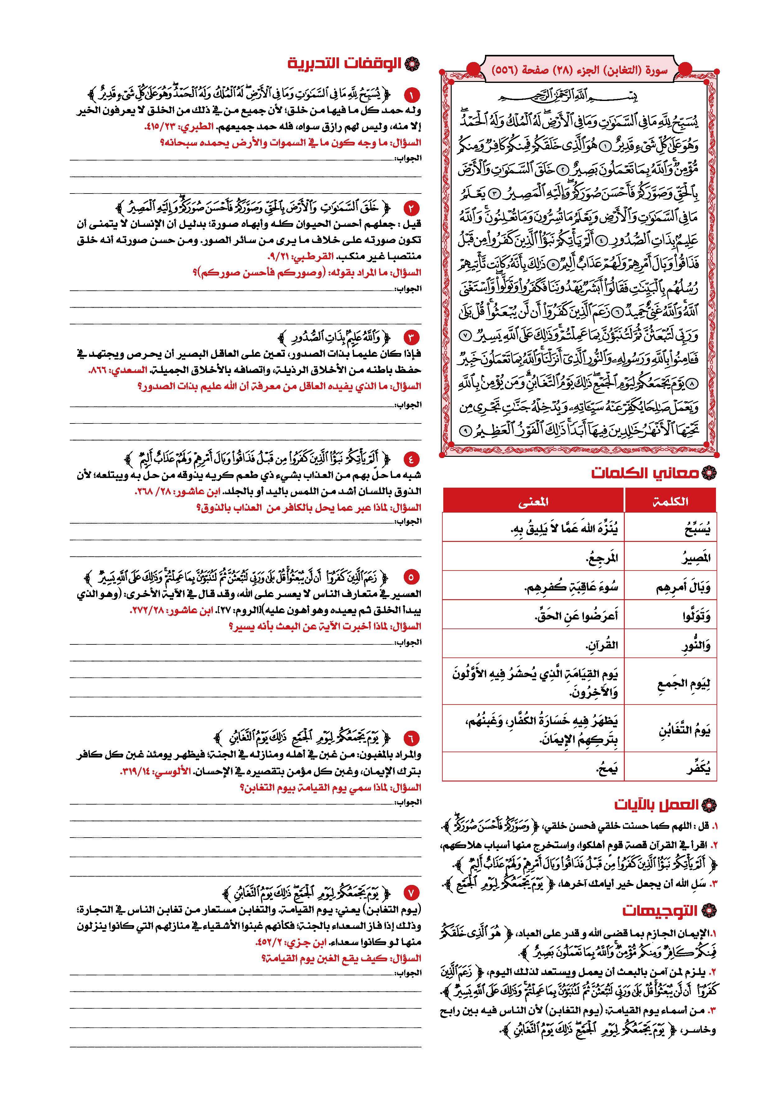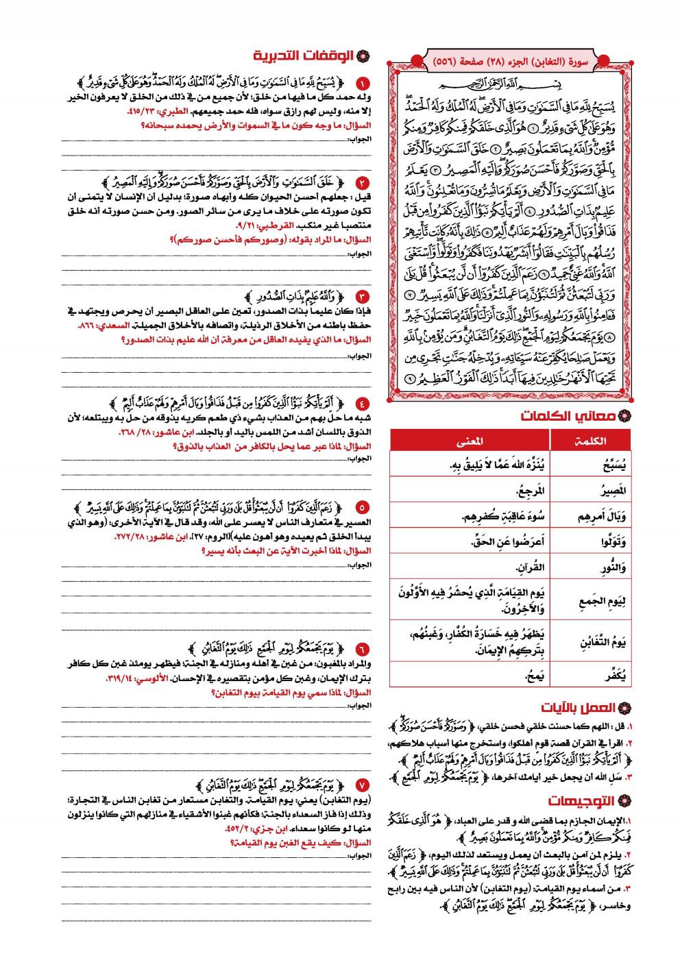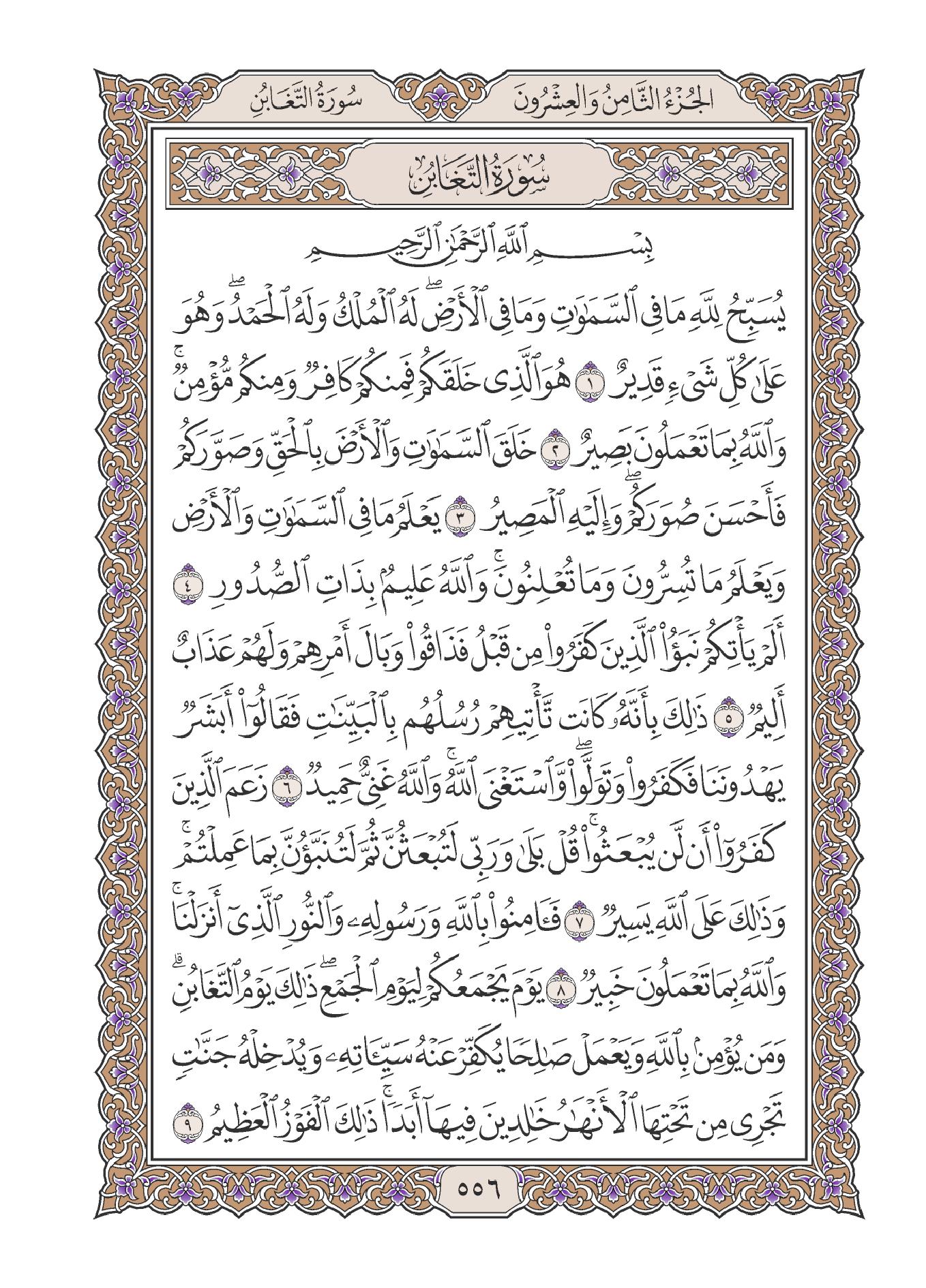 السعدى : هذه الآيات [الكريمات]، مشتملات على جملة كثيرة واسعة، من أوصاف الباري العظيمة، فذكر كمال ألوهيته تعالى، وسعة غناه، وافتقار جميع الخلائق إليه، وتسبيح من في السماوات والأرض بحمد ربها، وأن الملك كله لله، فلا يخرج مخلوق عن ملكه، والحمد كله له، حمد على ما له من صفات الكمال، وحمد على ما أوجده من الأشياء، وحمد على ما شرعه من الأحكام، وأسداه من النعم. وقدرته شاملة، لا يخرج عنها موجود، فلا يعجزه شيء يريده. الوسيط لطنطاوي : مقدمة وتمهيد 1- سورة التغابن هي السورة الرابعة والستون في ترتيب المصحف، أما نزولها على النبي صلى الله عليه وسلم فكان- كما ذكره صاحب الإتقان بعد سورة «الجمعة» وقبل سورة «الصف» . وعدد آياتها ثماني عشرة آية. 2- وجمهور المفسرين على أنها من السور المدنية. قال الشوكانى: وهي مدنية في قول الأكثر، وقال الضحاك: هي مكية، وقال الكلبي: هي مكية ومدنية. أخرج ابن الضريس عن ابن عباس أنه قال: نزلت سورة التغابن بالمدينة. وفي رواية أخرى عنه: أنها نزلت بمكة إلا آيات من آخرها نزلن بالمدينة في عوف بن مالك الأشجعى، شكا إلى رسول الله صلى الله عليه وسلم جفاء أهله وولده، فأنزل الله- تعالى- يا أَيُّهَا الَّذِينَ آمَنُوا إِنَّ مِنْ أَزْواجِكُمْ وَأَوْلادِكُمْ عَدُوًّا لَكُمْ فَاحْذَرُوهُمْ.. إلى آخر السورة «1» . ويبدو لنا أن بعض آيات هذه السورة يغلب عليها طابع القرآن المكي، كالآيات التي تتحدث عن مظاهر قدرة الله- تعالى- وعن إنكار المشركين للبعث والرد عليهم. لذا نرجح- والله أعلم- أن النصف الأول منها من القرآن المكي، والنصف الأخير من القرآن المدني. 3- والسورة الكريمة بعد ذلك من أهم مقاصدها: تنزيه الله- تعالى- عن الشريك أو الولد، وبيان ألوان من مظاهر قدرته ومننه على خلقه، والرد على المشركين الذين زعموا أنهم لن يبعثوا، والمقارنة بين حسن عاقبة الأخيار وسوء عاقبة الأشرار، وبيان أن كل شيء يقع في ذا الكون هو بقضاء الله وقدره. وتحريض المؤمنين على تقوى الله- تعالى- وعلى إيثار ما عنده على كل شيء من شهوات هذه الدنيا. وصلى الله على سيدنا محمد وعلى آله وصحبه وسلم. سورة " التغابن " هى آخر السور المفتتحة بالتسبيح ، فقد قال - سبحانه - فى مطلعها . ( يُسَبِّحُ لِلَّهِ مَا فِي السماوات وَمَا فِي الأرض . . . ) أى : ينزه الله - تعالى - عن كل نقص ، ويجله عن كل مالا يليق به ، جميع الكائنات التى فى سماواته - سبحانه - وفى أرضه ، كما قال - عز وجل - : ( تُسَبِّحُ لَهُ السماوات السبع والأرض وَمَن فِيهِنَّ وَإِن مِّن شَيْءٍ إِلاَّ يُسَبِّحُ بِحَمْدِهِ ولكن لاَّ تَفْقَهُونَ تَسْبِيحَهُمْ إِنَّهُ كَانَ حَلِيماً غَفُوراً ) وجىء هنا وفى سورة الجمعة بصيغة المضارع ( يُسَبِّحُ ) للدلالة على تجدد هذا التسبيح ، وحدوثه فى كل وقت وآن . وجىء فى سورة الحديد ، والصف ، بصيغة الماضى ( سَبَّحَ ) . للدلالة على أن التسبيح قد استقر وثبت لله - تعالى - وحده ، من قديم الزمان . وقوله - سبحانه - : ( لَهُ الملك وَلَهُ الحمد وَهُوَ على كُلِّ شَيْءٍ قَدِيرٌ ) مؤكد لما قبله ، من بيان أن جميع الكائنات تسبح لله - تعالى - لأنه مالكها وصاحب الفضل المطلق عليها . وتقديم الجار والمجرور ( لَهُ ) لإفادة الاختصاص والقصر . أى : له - سبحانه - وحده ملك هذا الكون ، وله وحده الحمد التام المطلق من جميع مخلوقاته ، وليس لغيره شىء منهما ، وإذا وجد شىء منهما لغيره فهو من فيضه وعطائه ، إذ هو - سبحانه - القدير الذى لا يقف فى وجه قدرته وإرادته شىء . البغوى : مدنية قال عطاء هي مكية إلا ثلاث آيات من قوله: "يا أيها الذين آمنوا إن من أزواجكم وأولادكم" إلى آخرهن. "يسبح لله ما في السموات وما في الأرض له الملك وله الحمد وهو على كل شيء قدير". ابن كثير : تفسير سورة التغابن وهي مدنية ، وقيل : مكية . قال الطبراني : حدثنا محمد بن هارون بن محمد بن بكار الدمشقي ، حدثنا العباس بن الوليد الخلال ، حدثنا الوليد بن الوليد ، حدثنا ابن ثوبان ، عن عطاء بن أبي رباح ، عن عبد الله بن عمرو رضي الله عنه ، قال : قال رسول الله - صلى الله عل