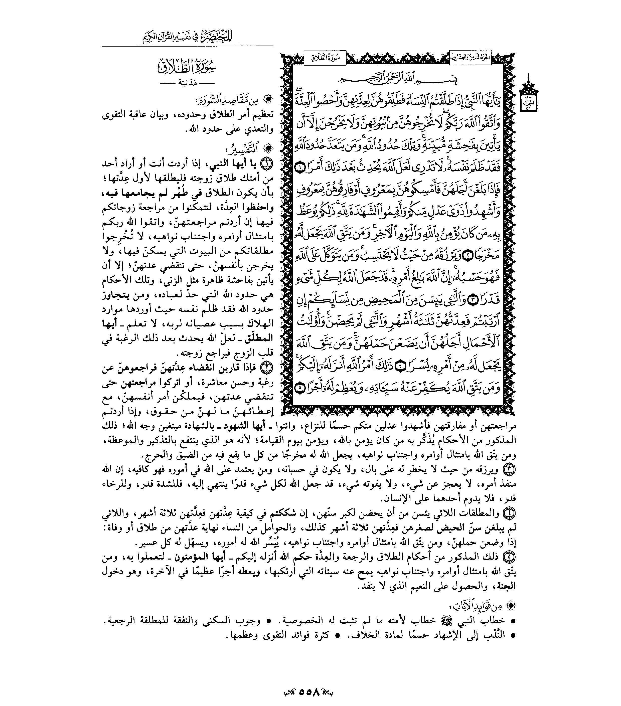 1- سورة «الطلاق» من السور المدنية الخالصة، وقد سماها عبد الله بن مسعود بسورة النساء القصرى، أما سورة النساء الكبرى فهي التي بعد سورة آل عمران.