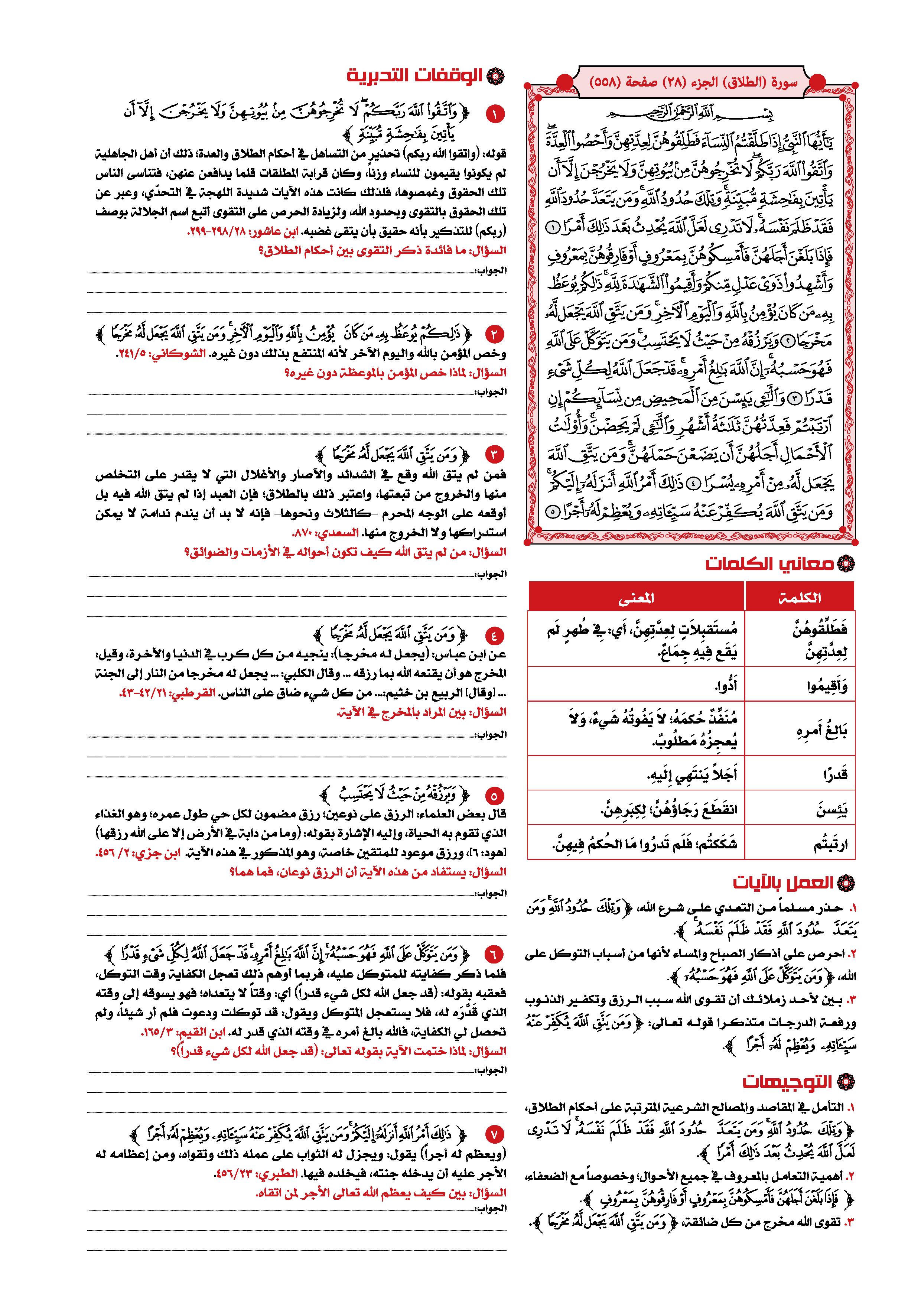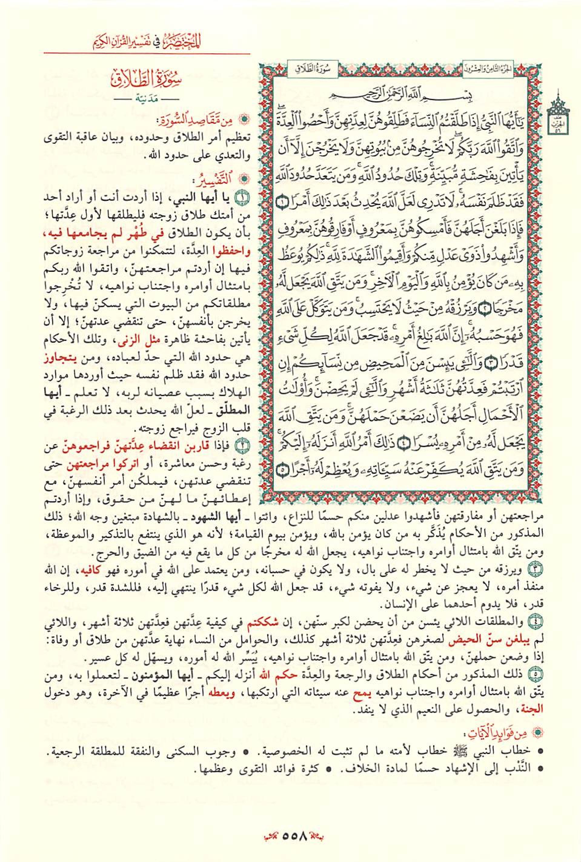 عربى - التفسير الميسر : يا أيها النبي إذا أردتم- أنت والمؤمنون- أن تطلِّقوا نساءكم فطلقوهن مستقبلات لعدتهن -أي في طهر لم يقع فيه جماع، أو في حَمْل ظاهر- واحفظوا العدة؛ لتعلموا وقت الرجعة إن أردتم أن تراجعوهن، وخافوا الله ربكم، لا تخرجوا المطلقات من البيوت التي يسكنَّ فيها إلى أن تنقضي عدتهن، وهي ثلاث حيضات لغير الصغيرة والآيسة والحامل، ولا يجوز لهن الخروج منها بأنفسهن، إلا إذا فعلن فعلة منكرة ظاهرة كالزنى، وتلك أحكام الله التي شرعها لعباده، ومن يتجاوز أحكام الله فقد ظلم نفسه، وأوردها مورد الهلاك. لا تدري- أيها المطلِّق-: لعل الله يحدث بعد ذلك الطلاق أمرًا لا تتوقعه فتراجعها.