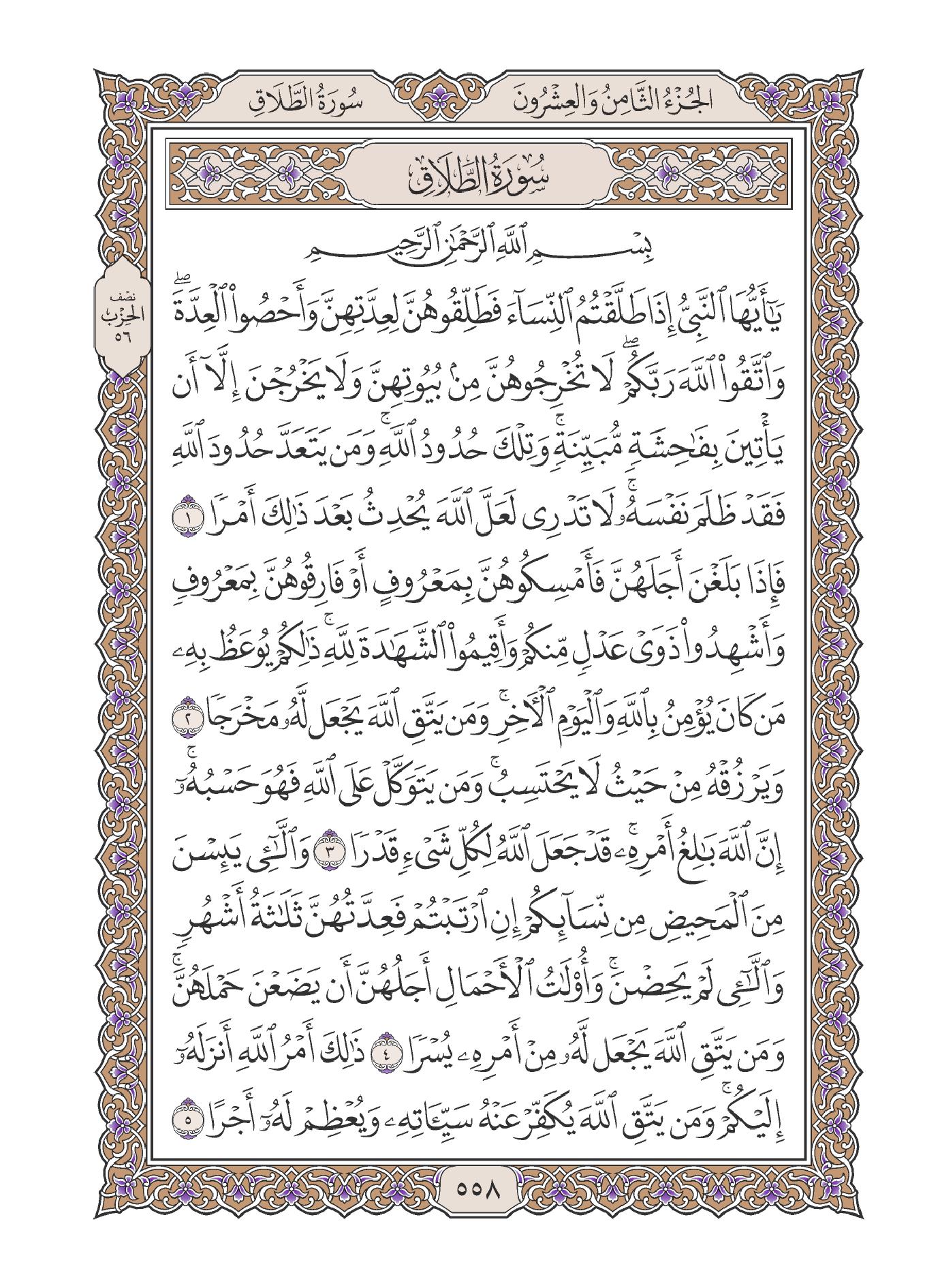 Kur'an-ı Kerim'in İngilizcesi Cevriyazımı - English (Transliteration) of the Holy Quran - اللغة الإنجليزية (الترجمة الصوتية) للقرآن الكريم Ya ayyuha annabiyyu ithatallaqtumu annisaa fatalliqoohunnaliAAiddatihinna waahsoo alAAiddata wattaqoo Allaharabbakum la tukhrijoohunna min buyootihinna walayakhrujna illa an ya'teena bifahishatinmubayyinatin watilka hudoodu Allahi wamanyataAAadda hudooda Allahi faqad thalamanafsahu la tadree laAAalla Allaha yuhdithubaAAda thalika amra
