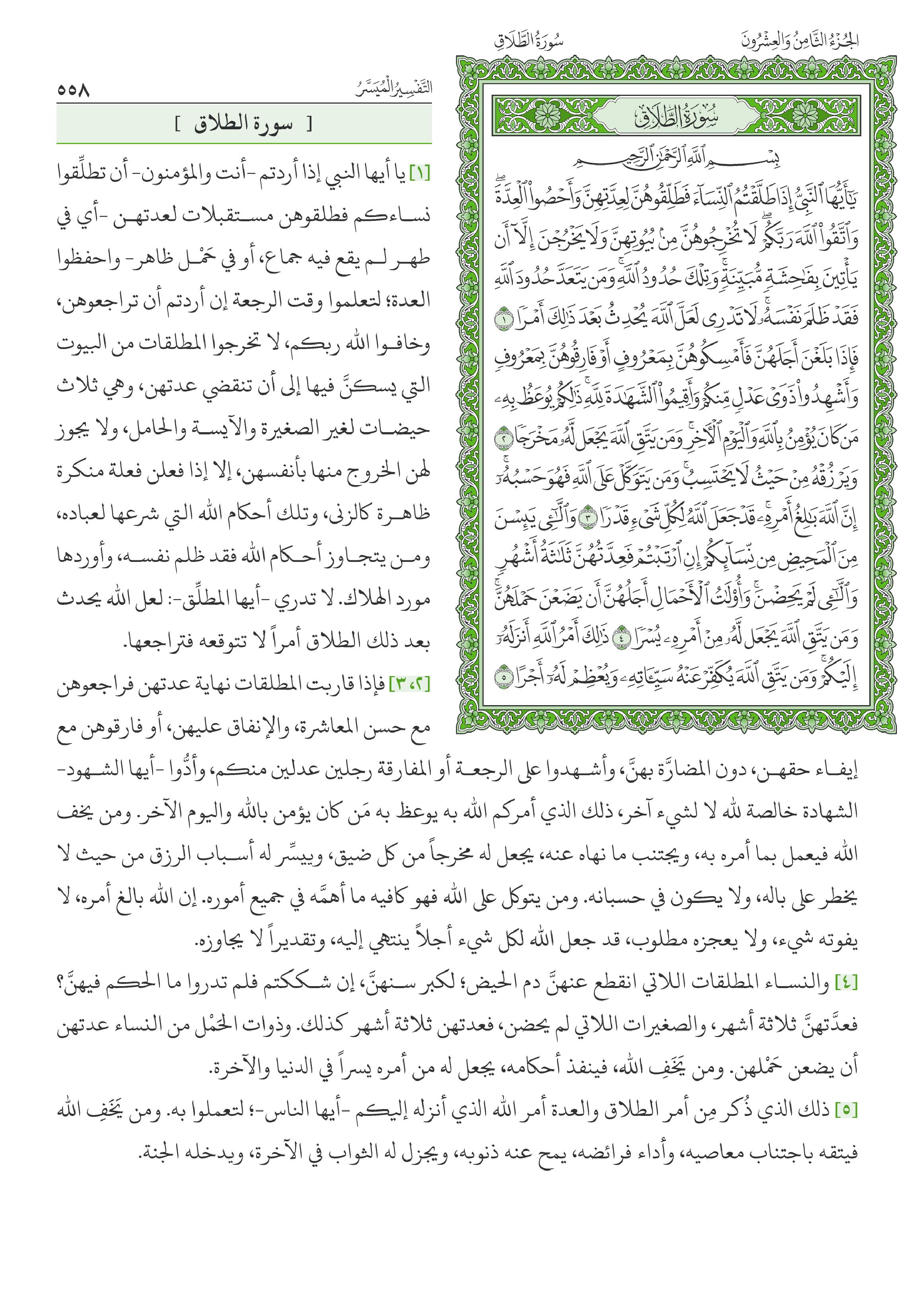 Всевышний обратился к Своему пророку и ко всем правоверным и возвестил, что если они вознамерятся развестись со своими женами, то могут сделать это. Однако не следует спешить с разводом, даже когда на то есть причины, и разводиться надлежит законным образом в соответствии с предписаниями Аллаха. Муж и жена будут разведены по истечении установленного срока. А начать отсчитывать этот срок можно только в том случае, если муж дал своей жене развод тогда, когда она была очищена от месячных кровотечений, и если он не имел с ней половой близости после последней менструации. Только развод, в котором установленный срок исправно соблюден, разрешается шариатом. Если же муж дал развод жене, когда у нее началась менструация, то срок текущего кровотечения не принимается в расчет и продолжительность установленного для развода срока увеличивается. То же самое относится и к тем случаям, когда муж объявил о разводе в период между двумя менструациями, если он уже вступал со своей женой в половую связь после предыдущего кровотечения. Причина этого в том, что женщина может забеременеть, и поэтому не ясно, какой продолжительности должен быть установленный для развода срок. О правоверные! Ведите счет этому сроку, то есть будьте точны при учете количества месячных кровотечений, если они имеют место, или считайте по месяцам, если менструаций не бывает или жена беременна. Ведя счет установленному для развода сроку, разводящиеся супруги выполняют свои обязанности перед Аллахом и перед человеком, который возьмет в жены эту женщину в будущем. Благодаря этому также соблюдаются права мужа, который в свою очередь берет на себя содержание жены в течение всего установленного для развода срока. Если продолжительность этого срока определена, то обе стороны обязаны выполнять свои обязанности друг перед другом. Обязанность вести счет сроку возлагается на мужа и совершеннолетнюю жену. Если же жена не достигла совершеннолетия, то эта ответственность ложится на ее поручителя. О правоверные! Страшитесь Аллаха при всех начинаниях, бойтесь Его и соблюдайте права жен, с которыми вы разводитесь. Не выгоняйте их из своих домов в течение установленного срока, потому что до его истечения жена должна оставаться в доме своего мужа. Более того, ей не дозволено покидать этот дом. Аллах запретил выгонять жен из их домов, потому что обеспечение жены жильем входит в обязанности мужа, и она имеет право жить в его доме, пока не истечет установленный для развода срок. Аллах также запретил женам выходить из дома, потому что этим поступком жена попирает права своего мужа и посягает на его честь. Оба этих запрета остаются действительными вплоть до окончания установленного срока. Если же разведенная жена станет совершать отвратительные поступки, то мужу позволяется выгнать ее из дома, потому что в противном случае она может причинить его обитателям зло своими оскорблениями и злодеяниями. Если подобное происходит, то жена сама провоцирует мужа выгнать ее из дома. Предоставляя разведенной жене кров, муж пытается утешить ее и сделать для нее доброе дело, и если в ответ она начинает бесчинствовать, то причиняет вред самой себе. Все это относится к женам, разведенным неокончательно, когда муж еще может восстановить брак до истечения срока. Что же касается жен, разведенных окончательно, 