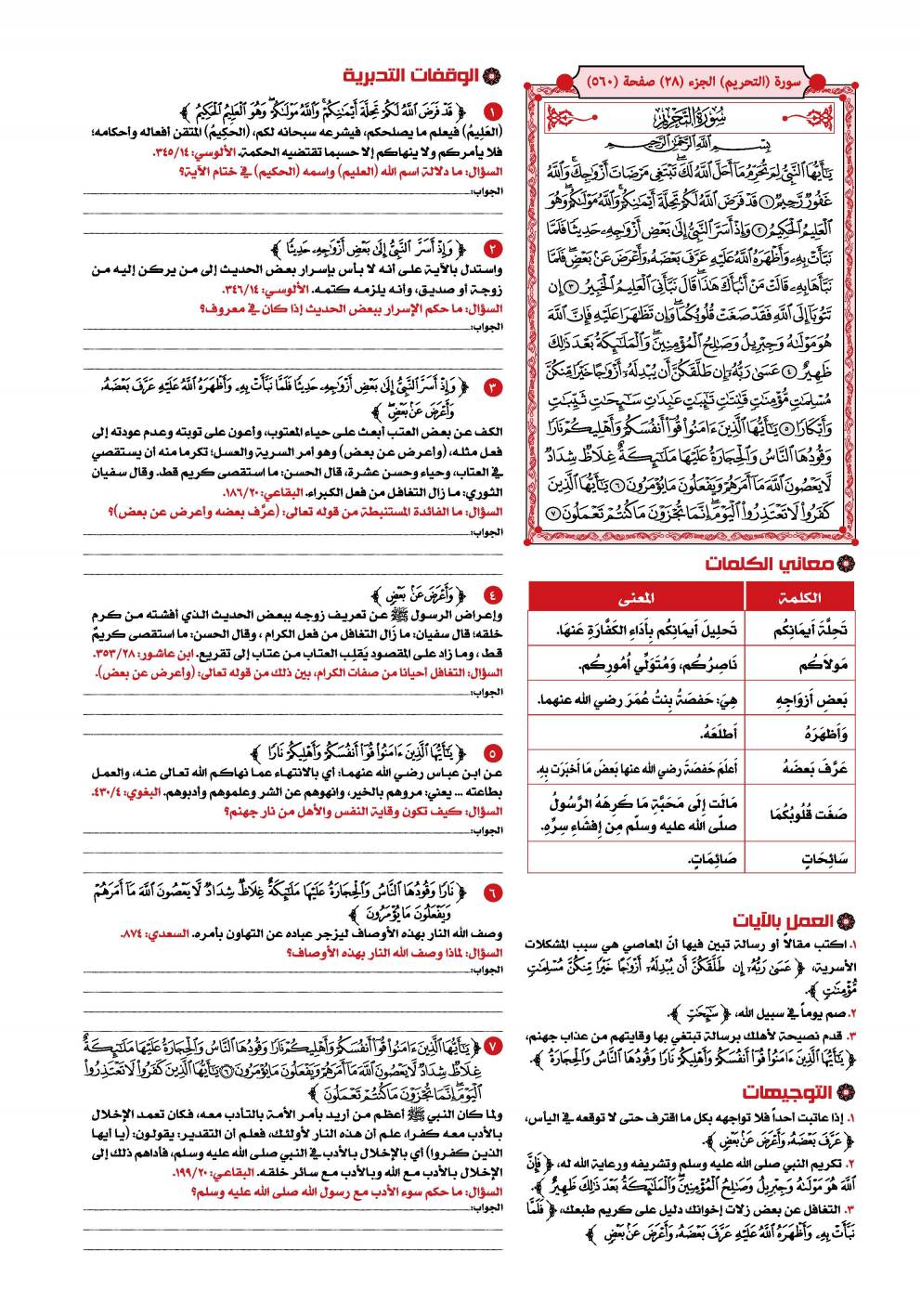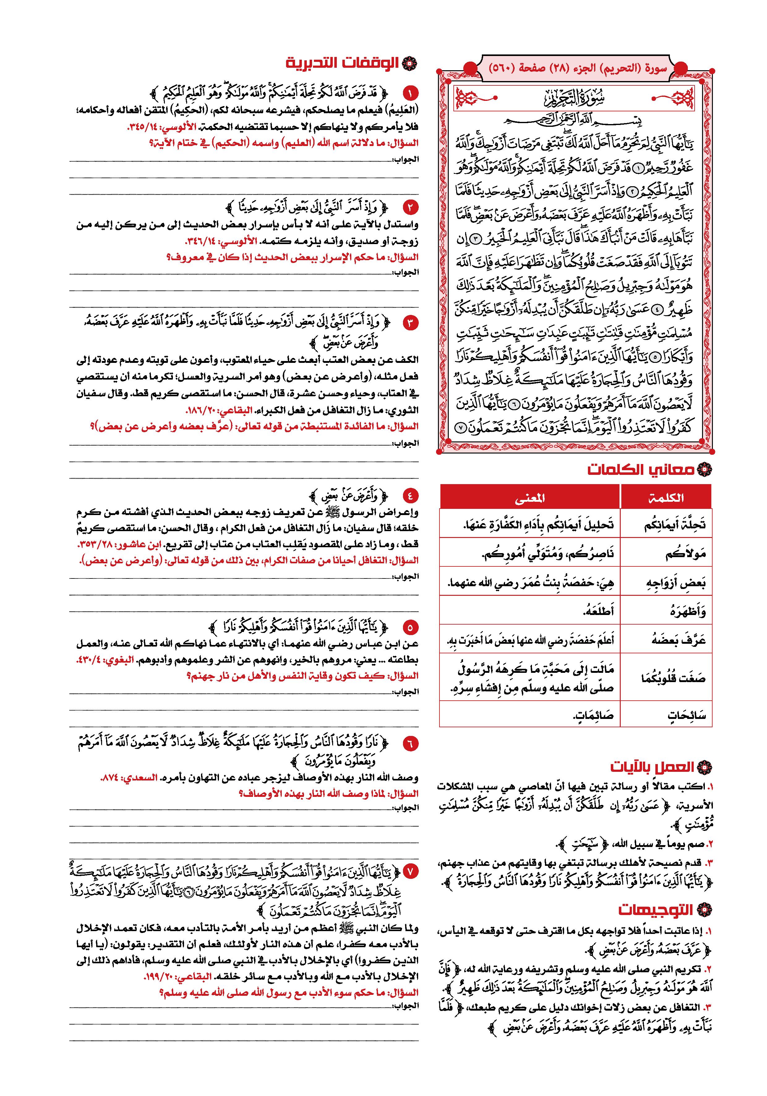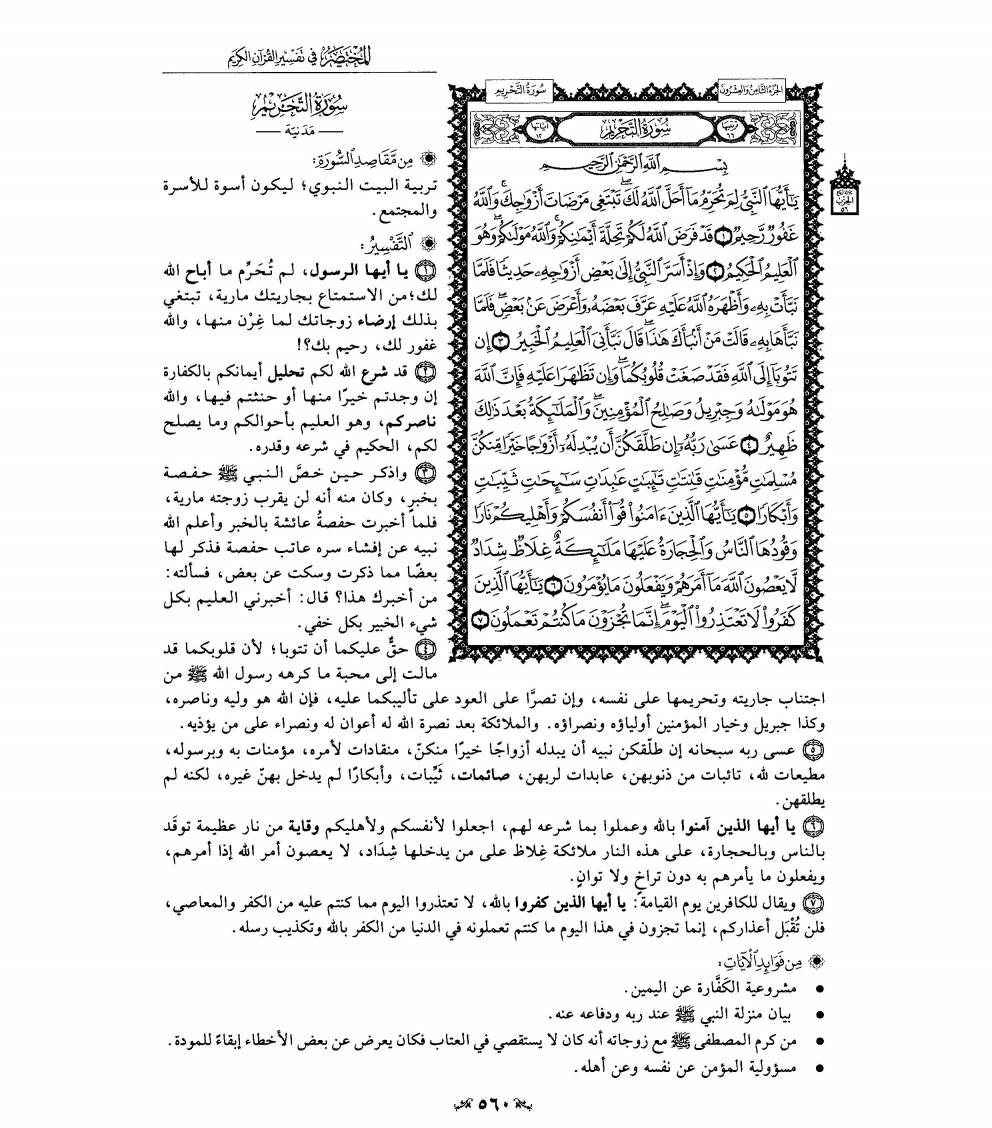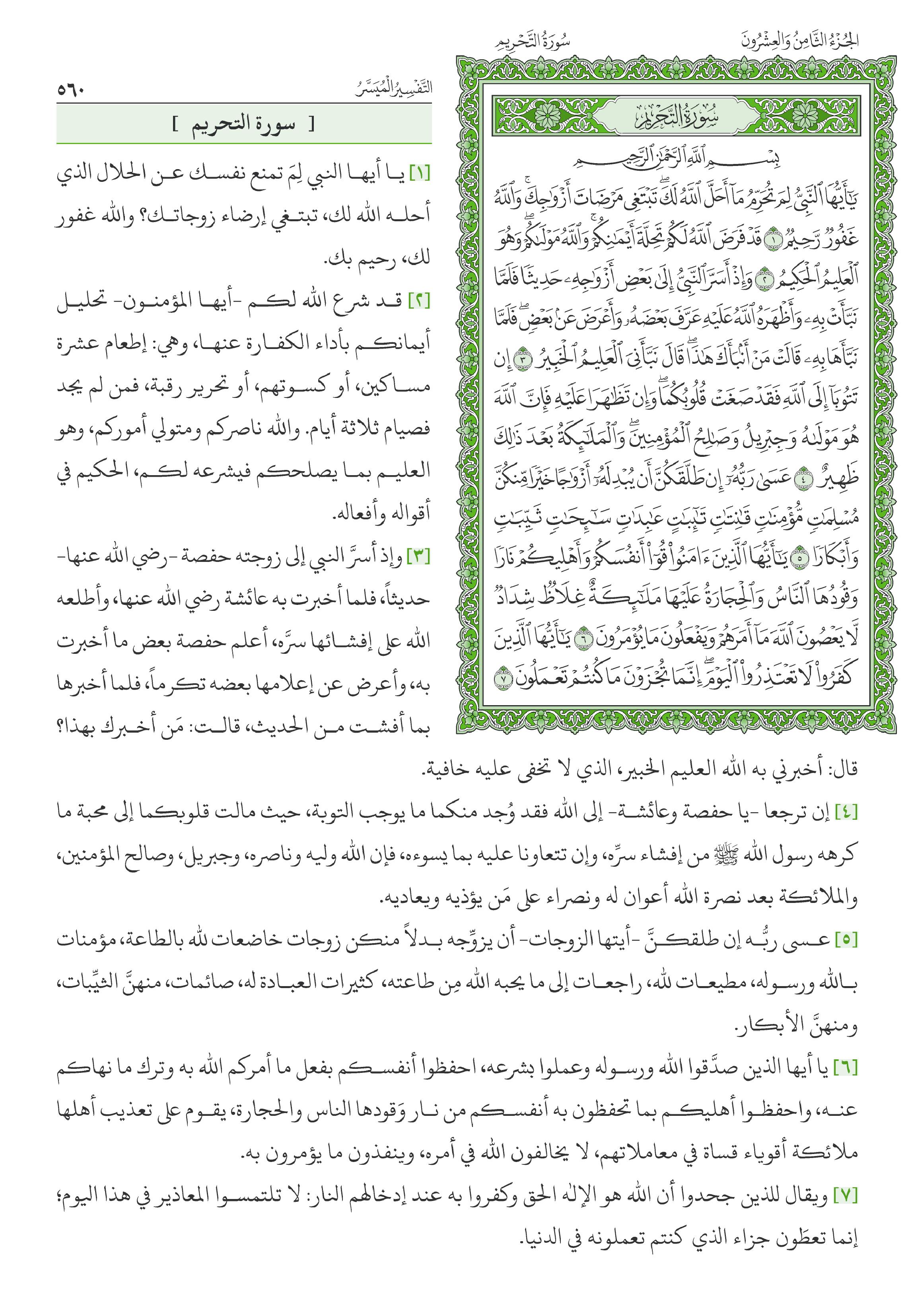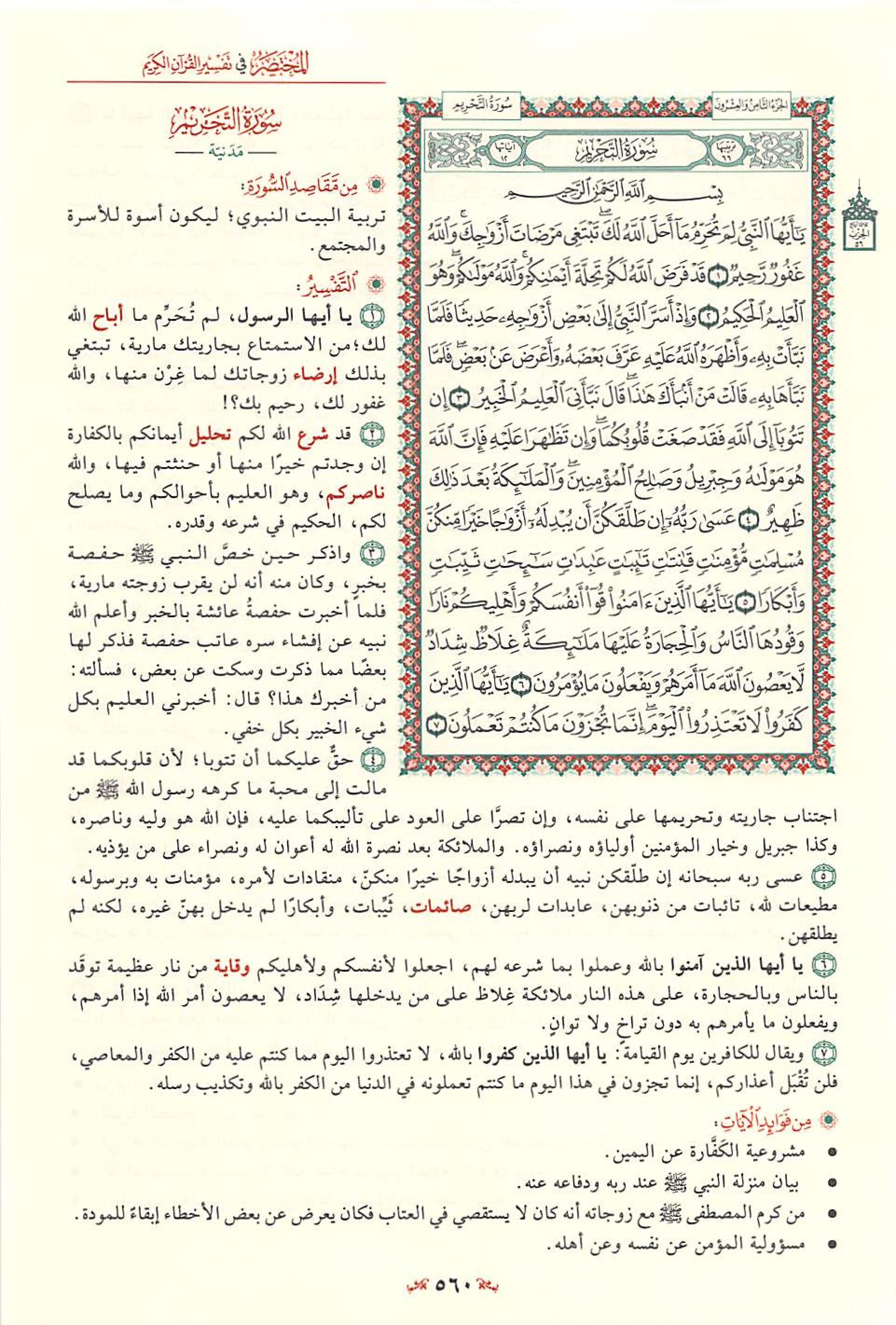 1- سورة «التحريم» من السور المدنية الخالصة، وتسمى- أيضا- بسورة لِمَ تُحَرِّمُ وبسورة «النبي» صلى الله عليه وسلم وعدد آياتها اثنتا عشرة آية.