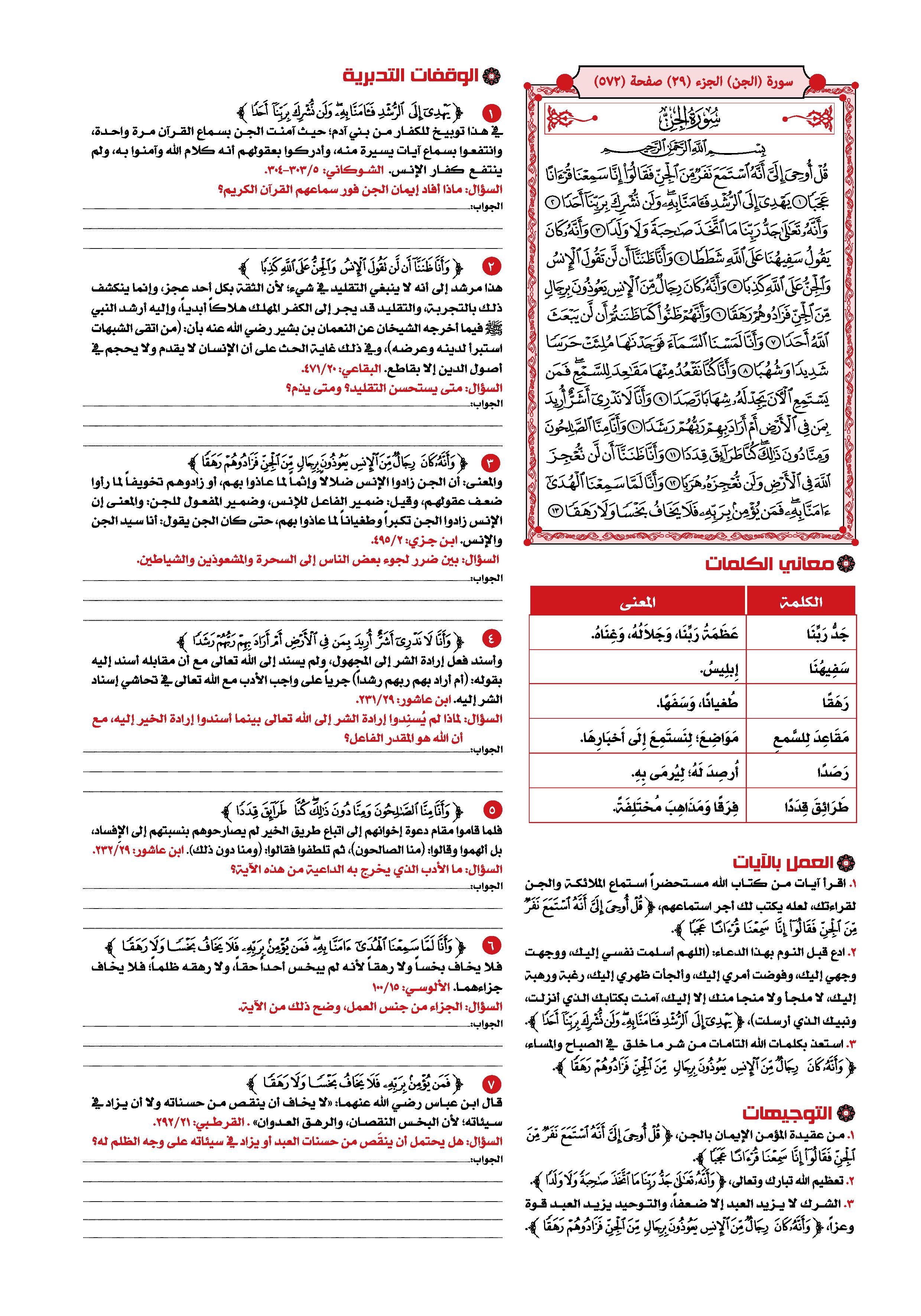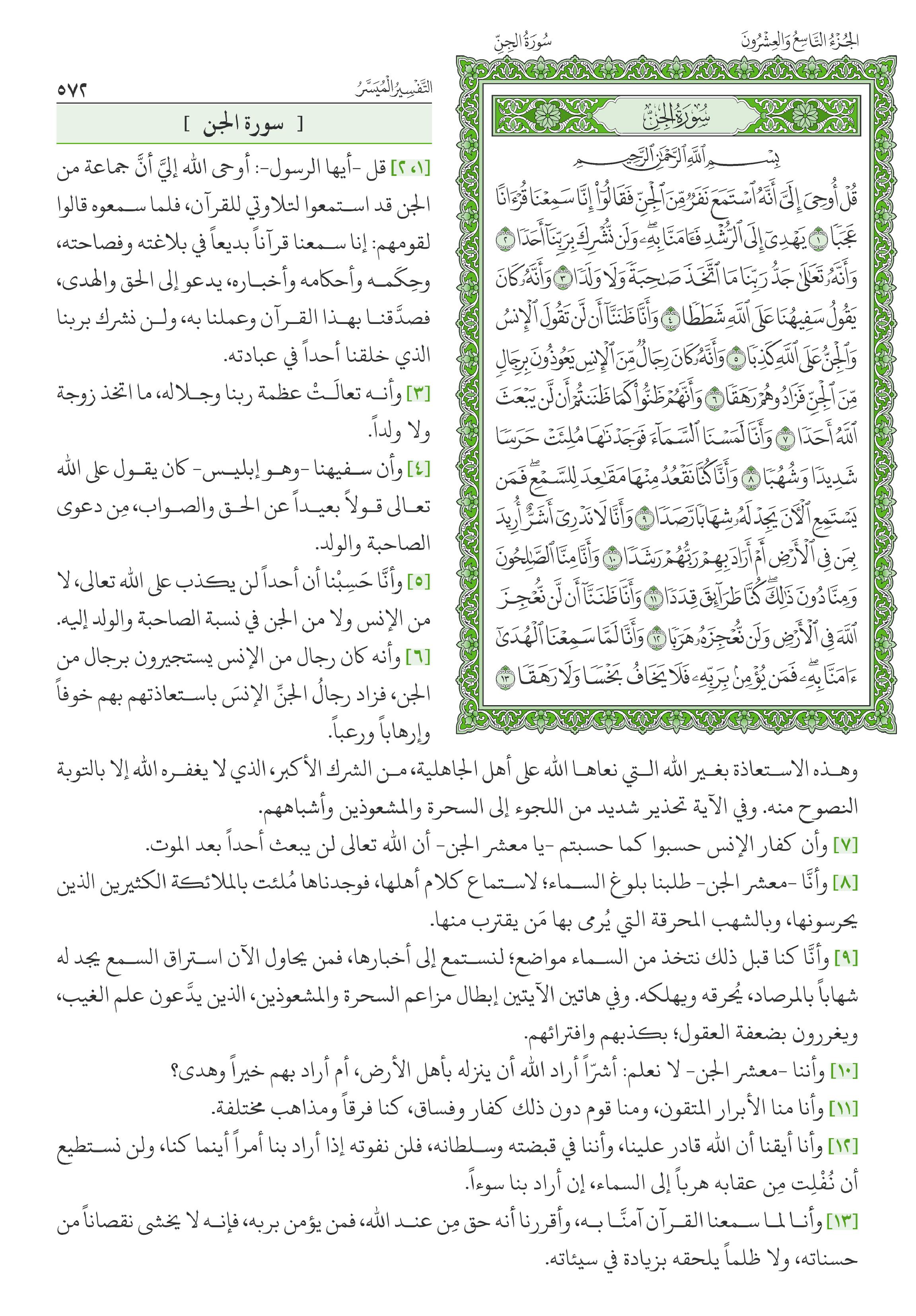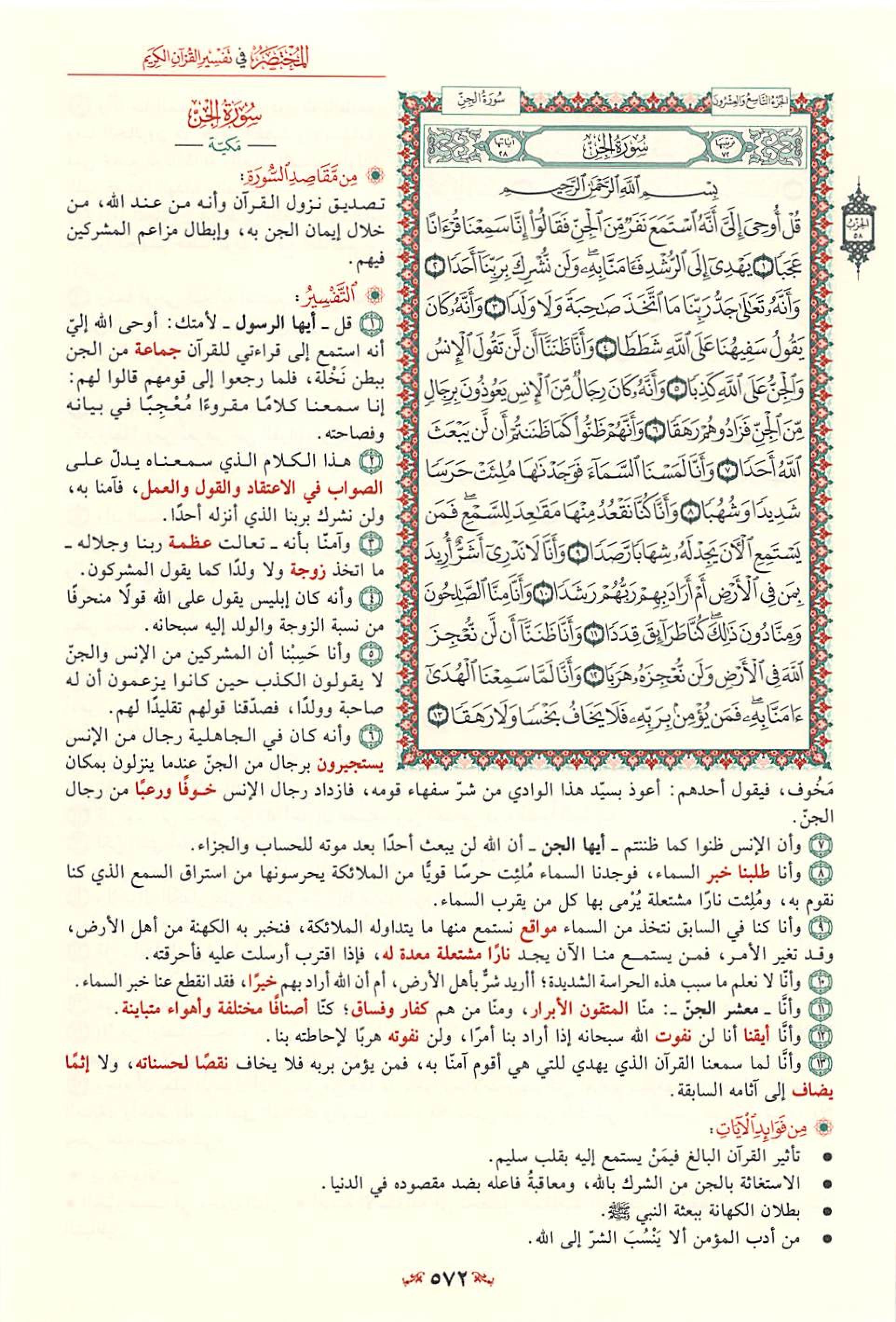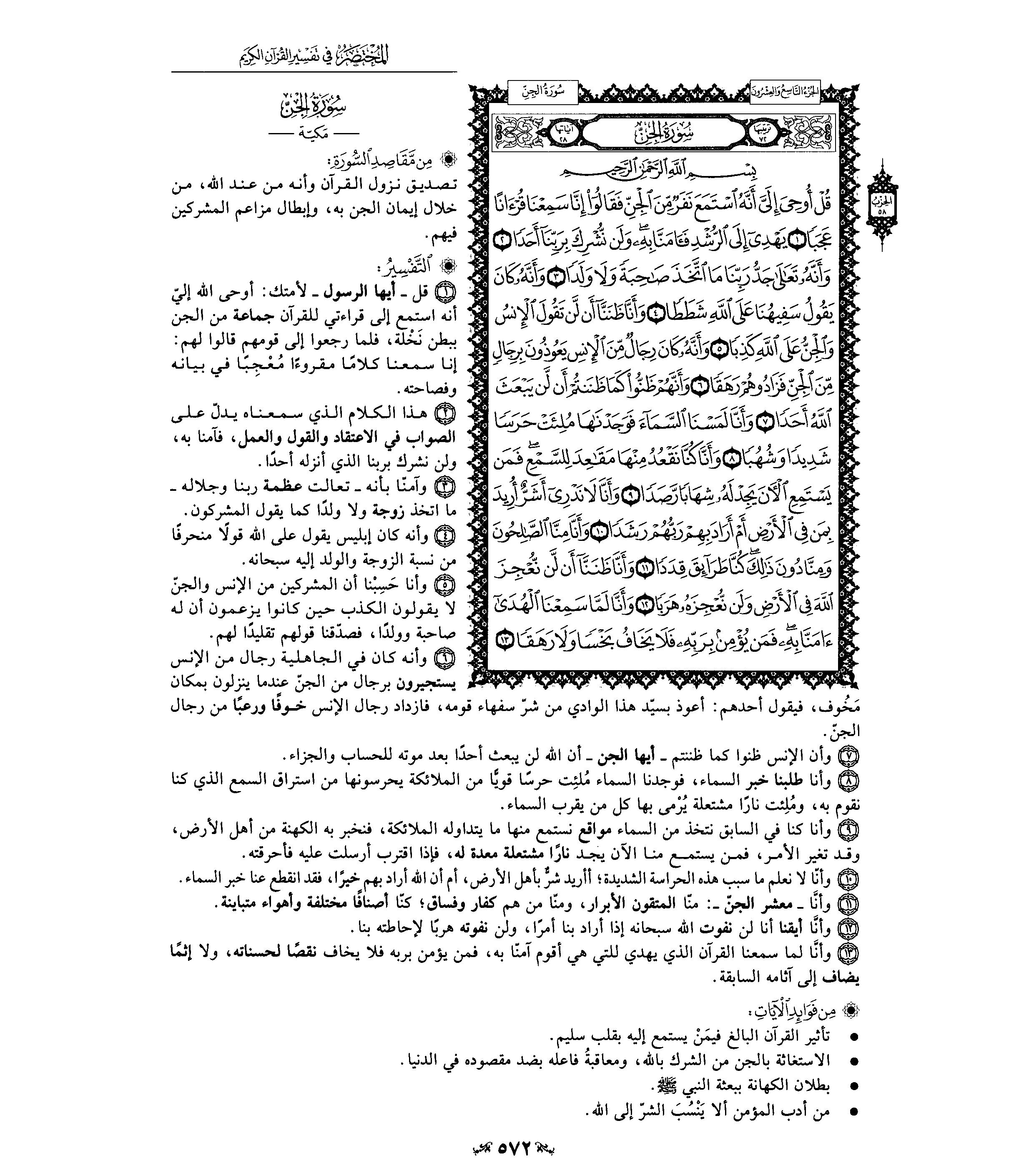 2- والمتدبر لهذه السورة الكريمة، يراها قد أعطتنا صورة واضحة عن عالم الجن، فهي تحكى أنهم أعجبوا بالقرآن الكريم، وأن منهم الصالح ومنهم غير الصالح، وأنهم لا يعلمون الغيب، وأنهم أهل للثواب والعقاب، وأنهم لا يملكون النفع لأحد، وأنهم خاضعون لقضاء الله- تعالى- فيهم.