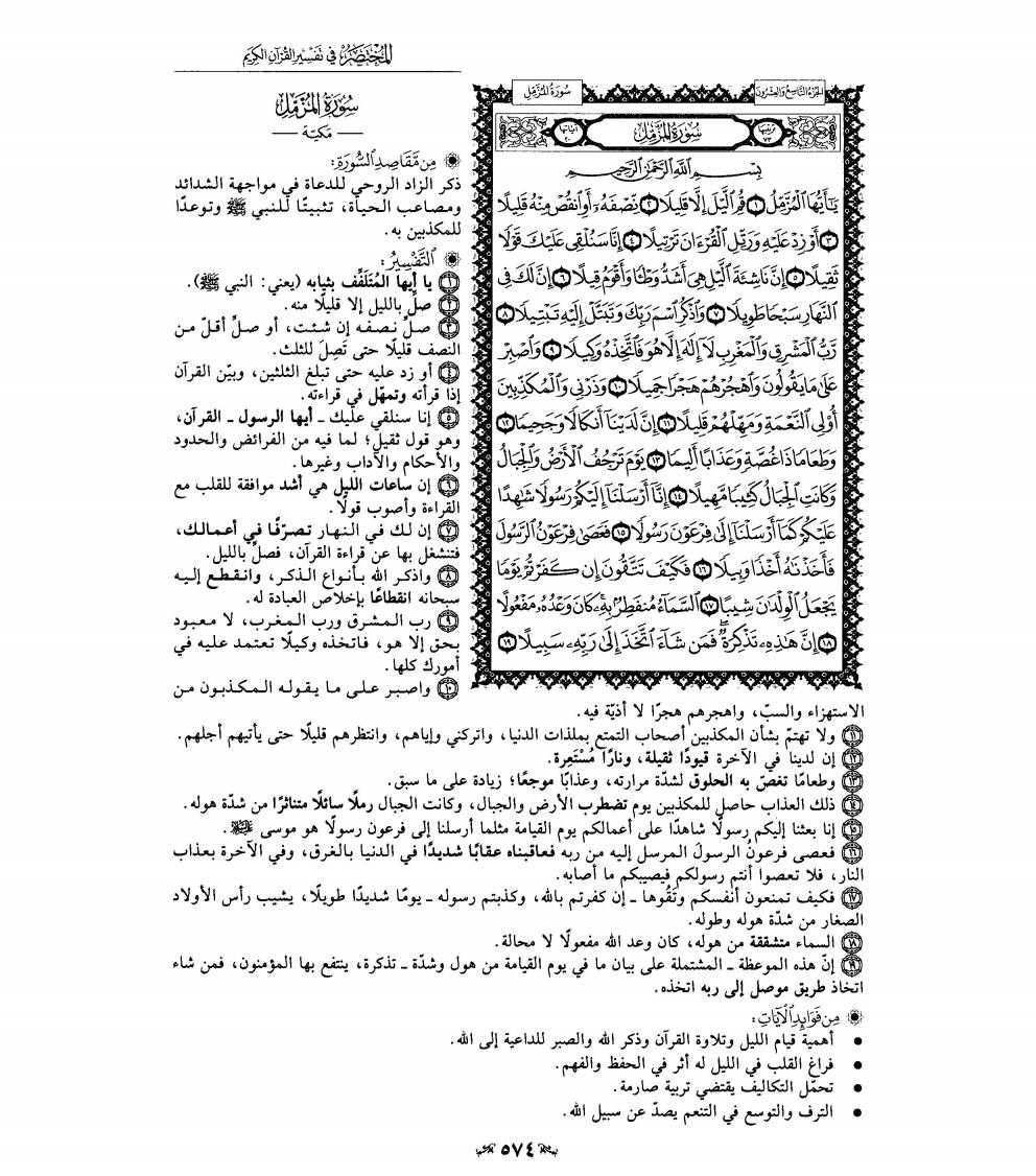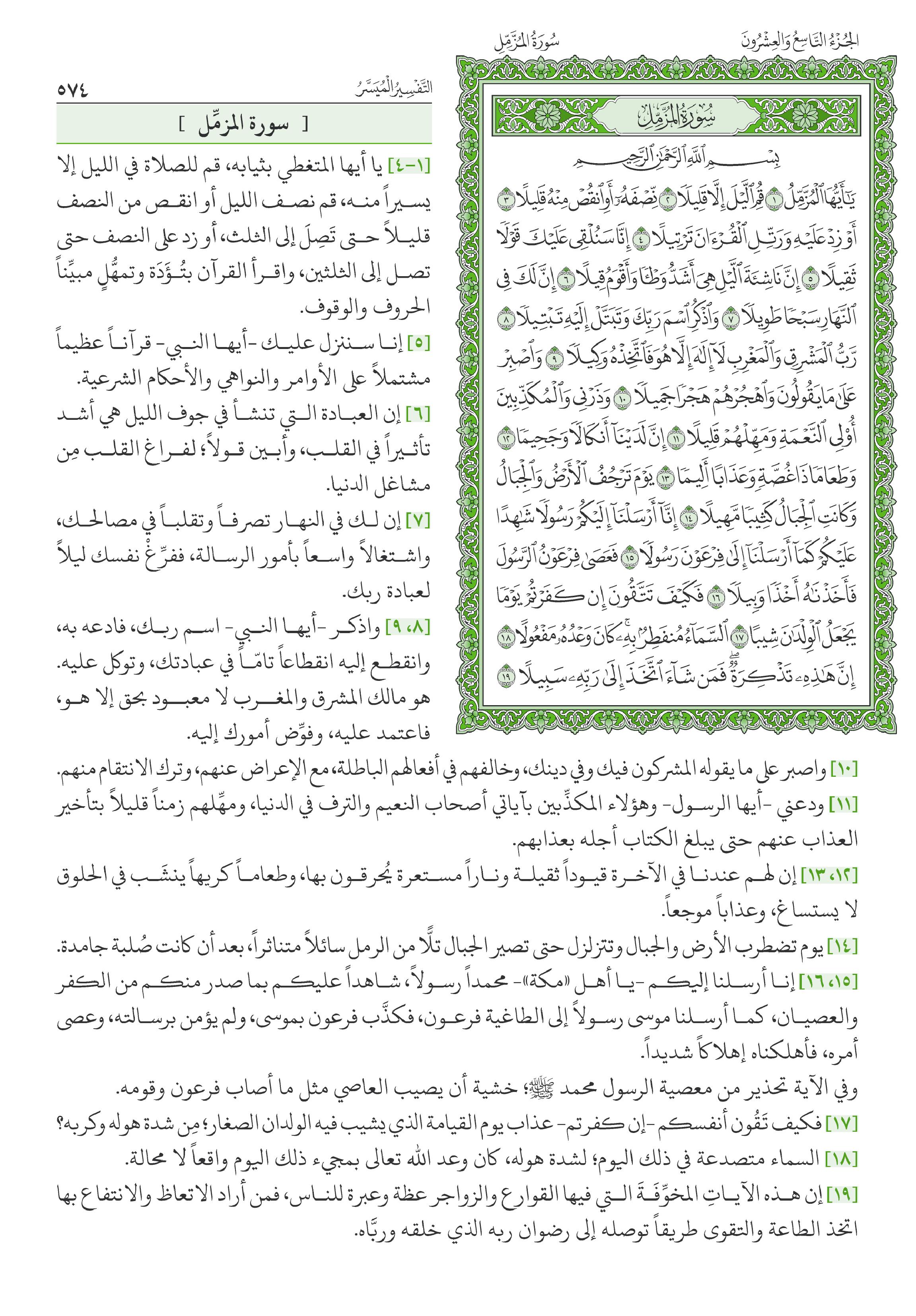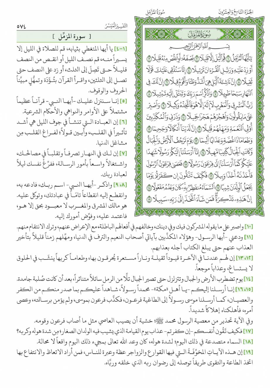 عربى - التفسير الميسر : يا أيها المتغطي بثيابه، قم للصلاة في الليل إلا يسيرًا منه. قم نصف الليل أو انقص من النصف قليلا حتى تَصِلَ إلى الثلث، أو زد على النصف حتى تصل إلى الثلثين، واقرأ القرآن بتُؤَدَة وتمهُّلٍ مبيِّنًا الحروف والوقوف.