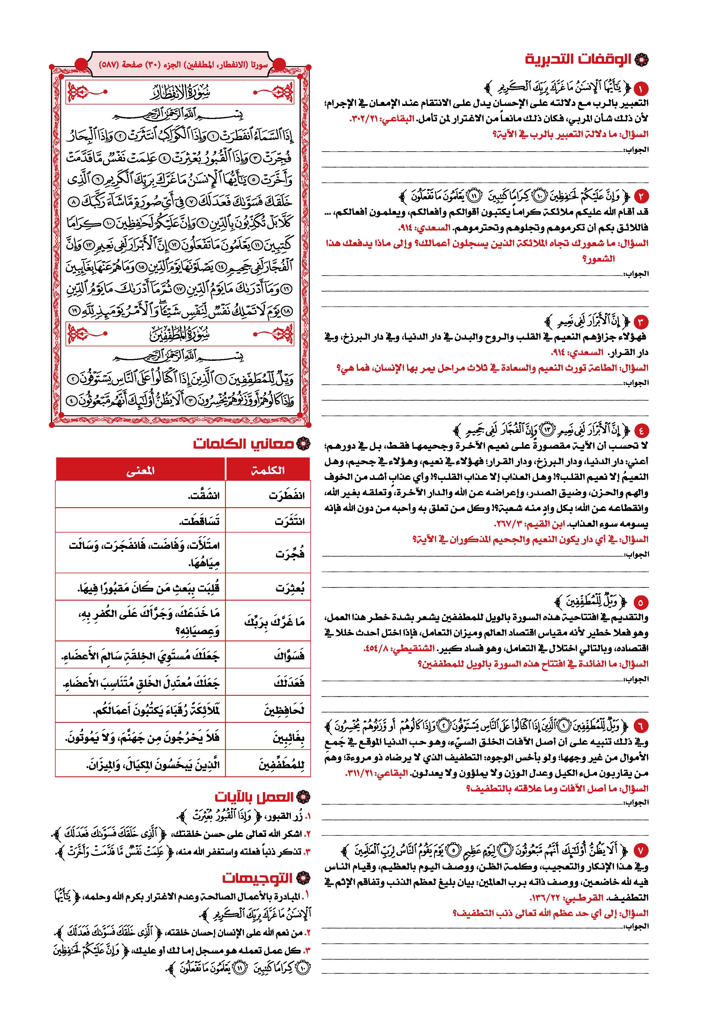 3- والسورة الكريمة في مطلعها تهدد الذين ينقصون المكيال والميزان ويبخسون الناس أشياءهم. وتذكرهم بيوم البعث والحساب والجزاء، لعلهم يتوبون إلى خالقهم ويستغفرونه مما فرط منهم.
