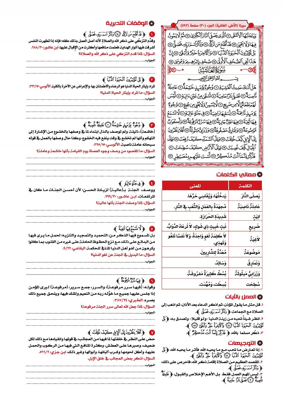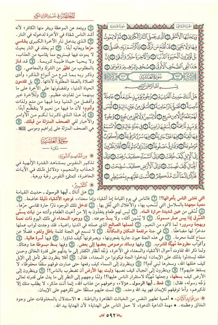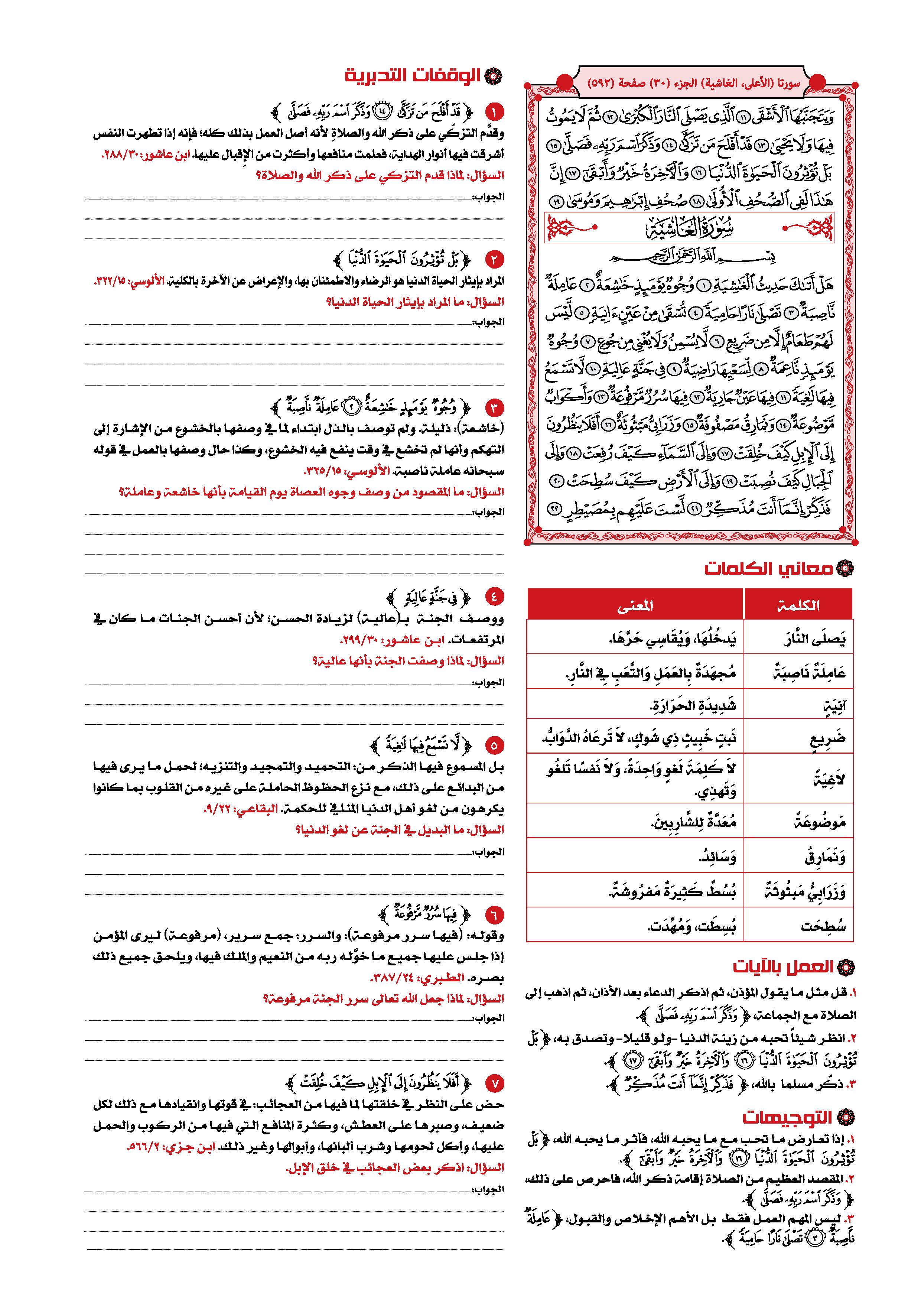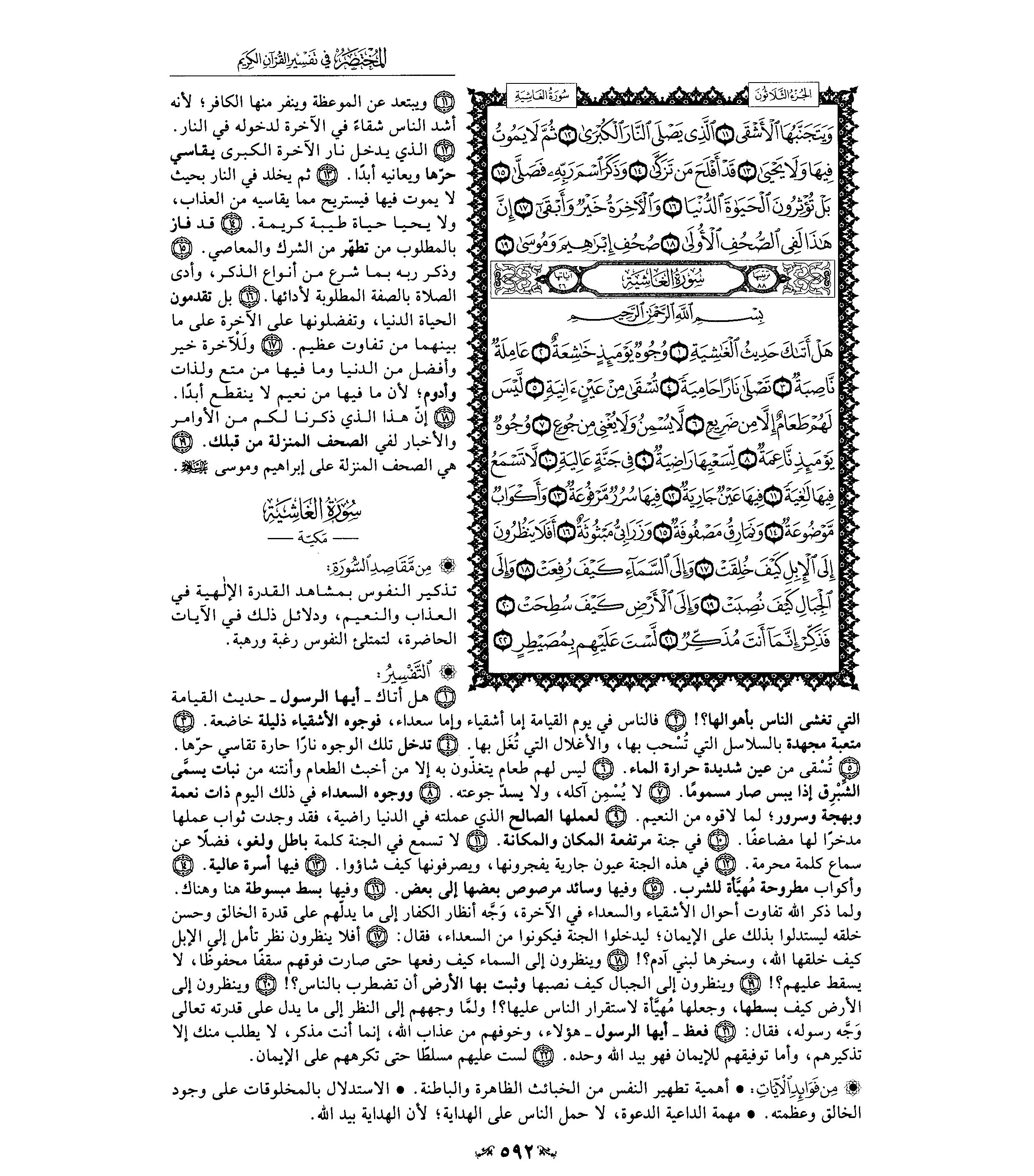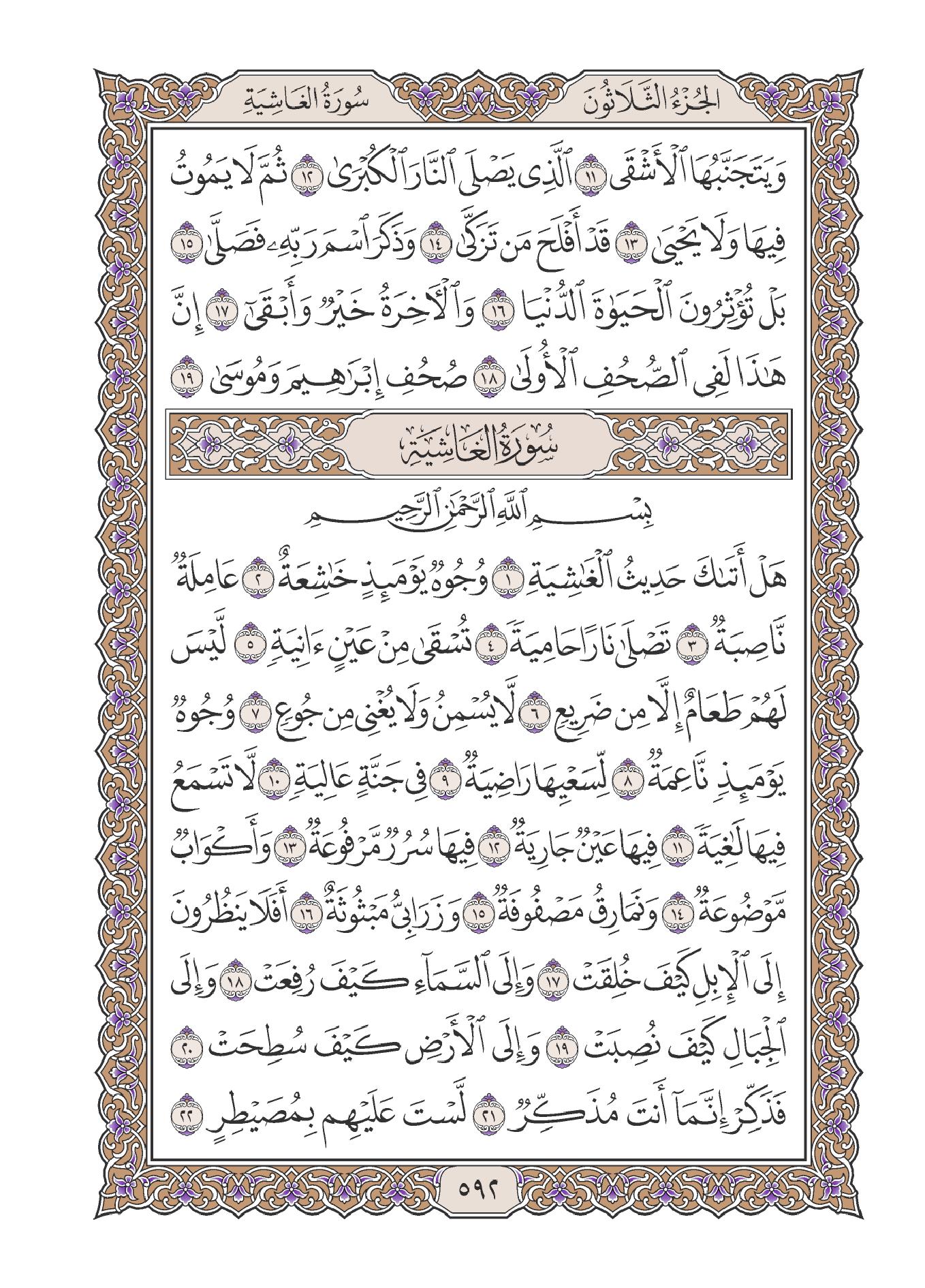 1- سورة «الغاشية» ، وتسمى سورة «هل أتاك حديث الغاشية» من السور المكية الخالصة، وعدد آياتها ست وعشرون آية، وهي السورة الثامنة والثمانون في ترتيب المصحف، أما ترتيبها في النزول، فهي السورة السابعة والستون من بين السور المكية، وكان نزولها بعد سورة «الذاريات» وقبل سورة «الكهف» .