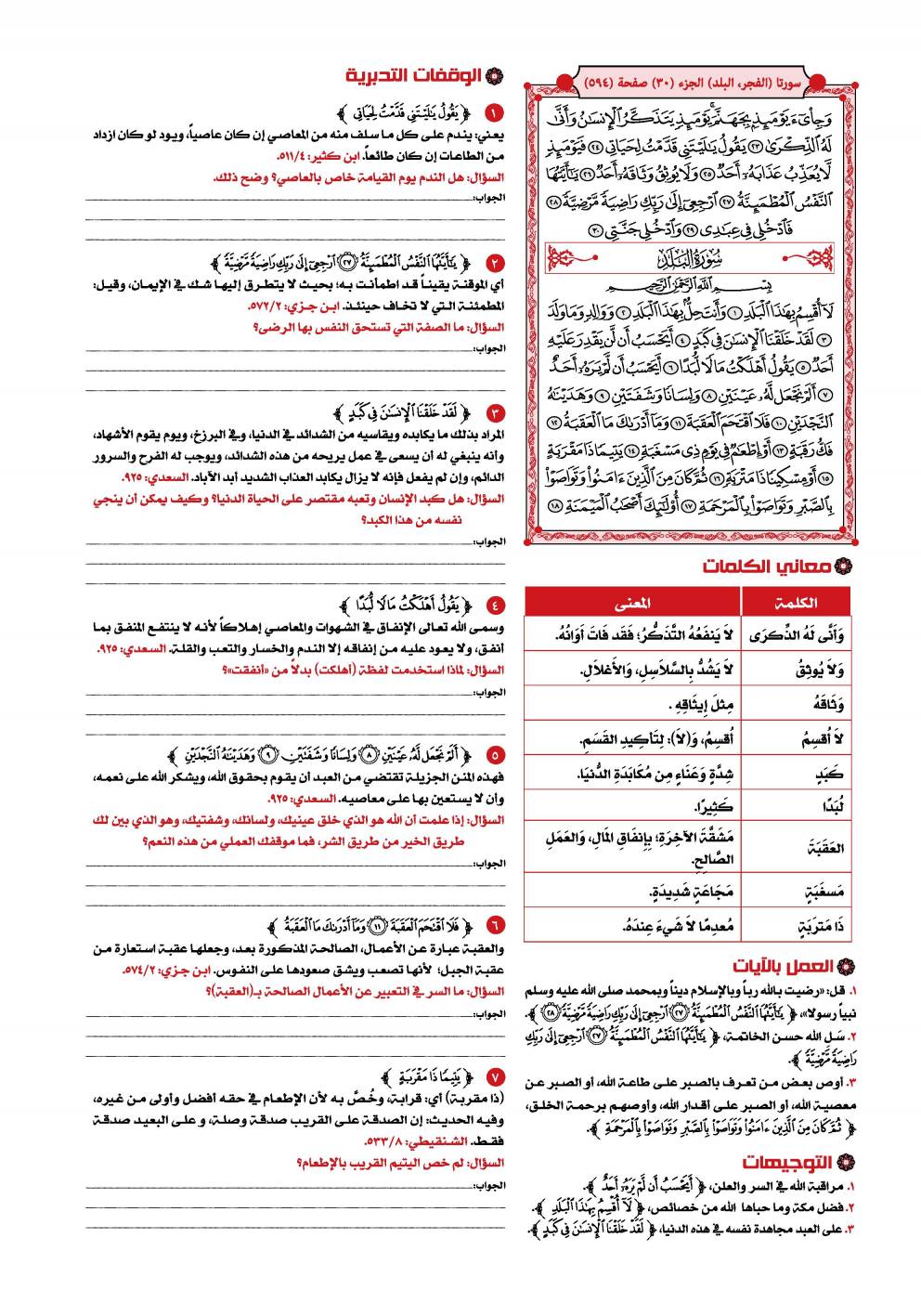 عربى - التفسير الميسر : أقسم الله بهذا البلد الحرام، وهو "مكة"، وأنت -أيها النبي- مقيم في هذا "البلد الحرام"، وأقسم بوالد البشرية- وهو آدم عليه السلام- وما تناسل منه من ولد، لقد خلقنا الإنسان في شدة وعناء من مكابدة الدنيا.